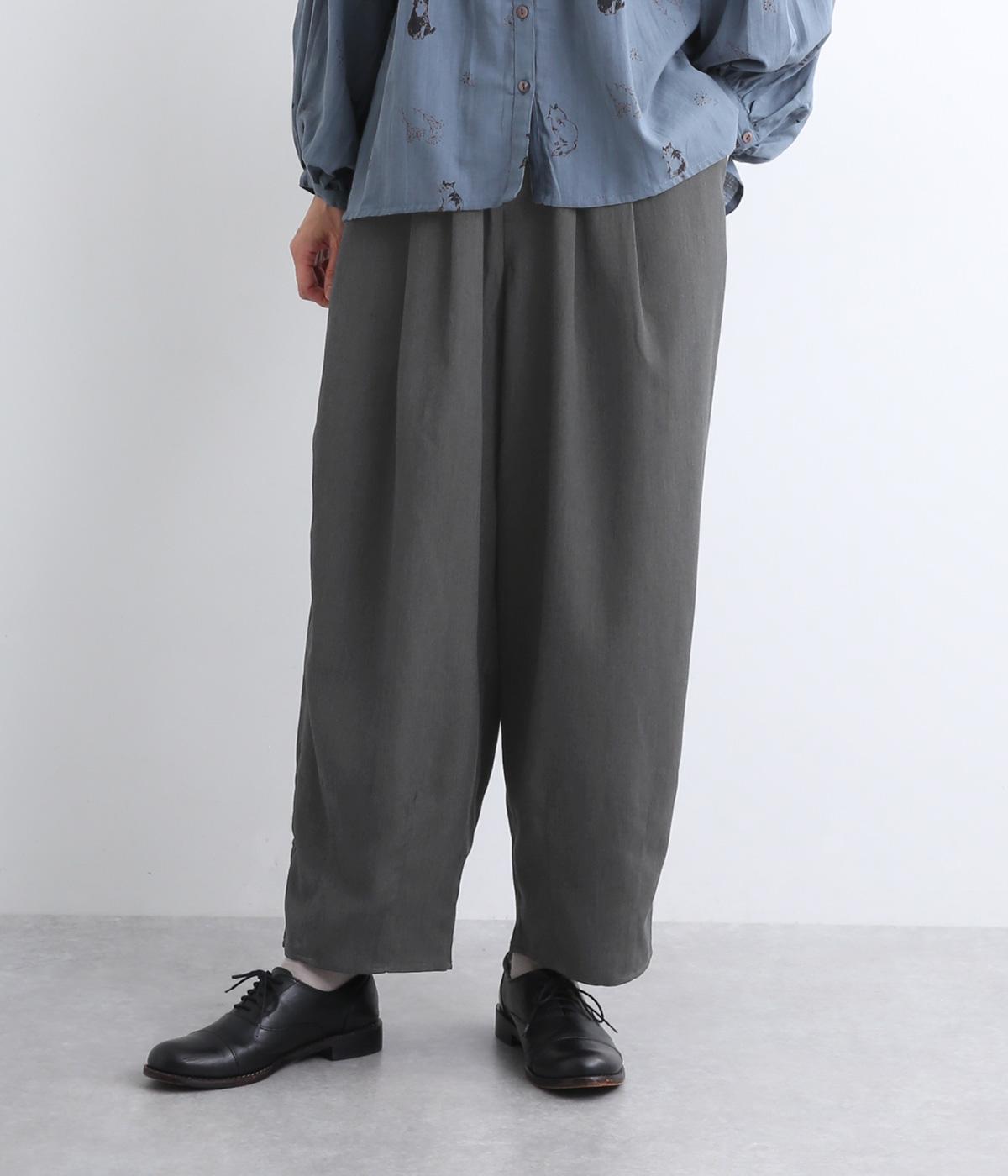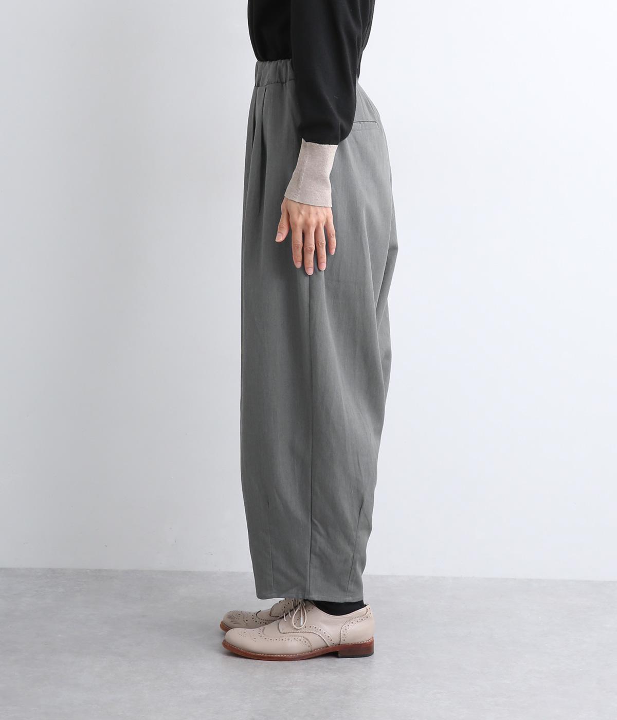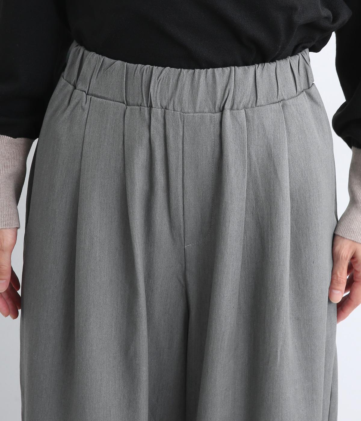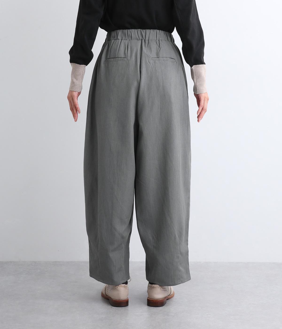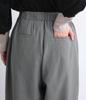 ウエスト下のタックが腰まわりにゆとりを加えるパンツです。裾にはダーツを入れて、少しシャープな印象を際立たせました。ウエストはぐるっとお腹まわりにフィットするオールゴム仕様です。