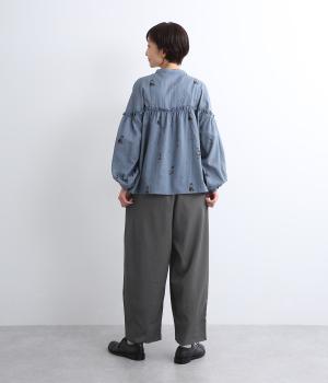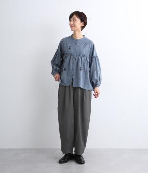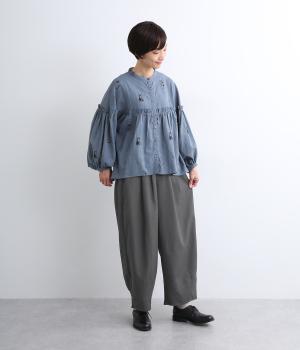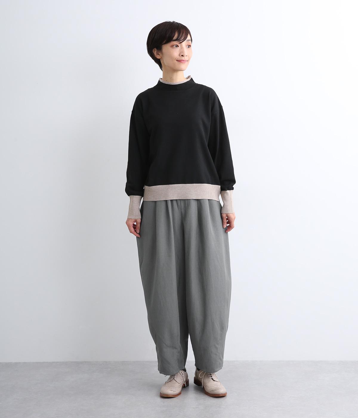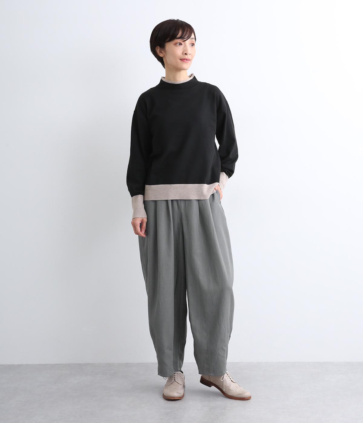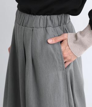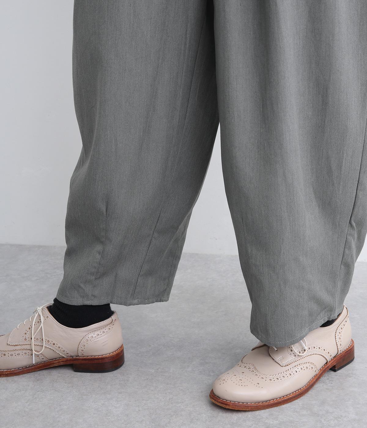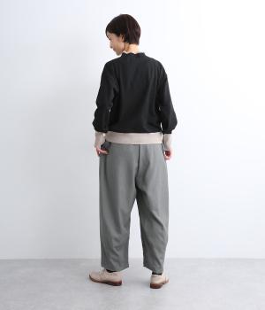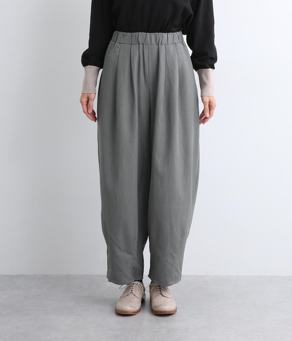 ウエスト下のタックが腰まわりにゆとりを加えるパンツです。裾にはダーツを入れて、少しシャープな印象を際立たせました。ウエストはぐるっとお腹まわりにフィットするオールゴム仕様です。