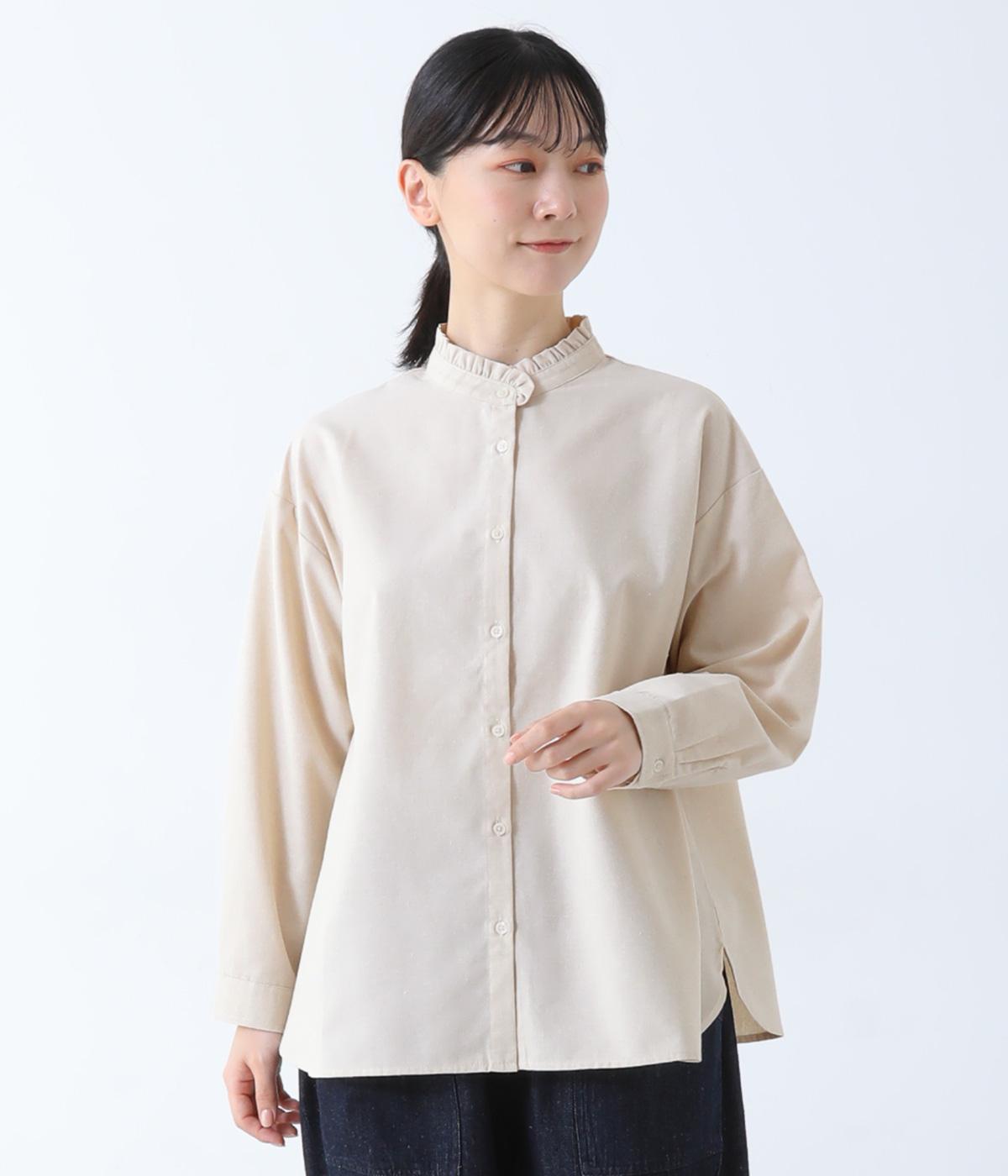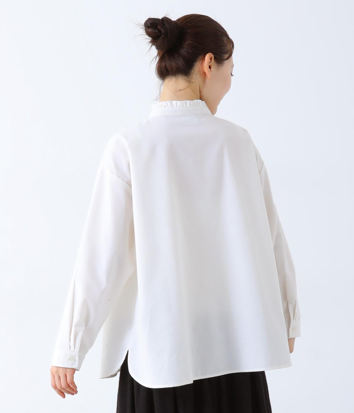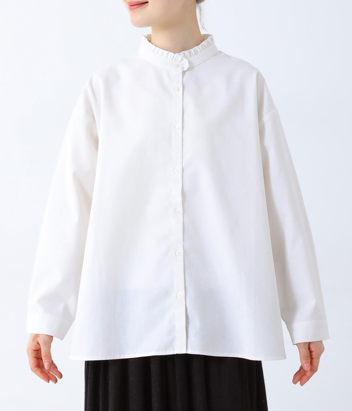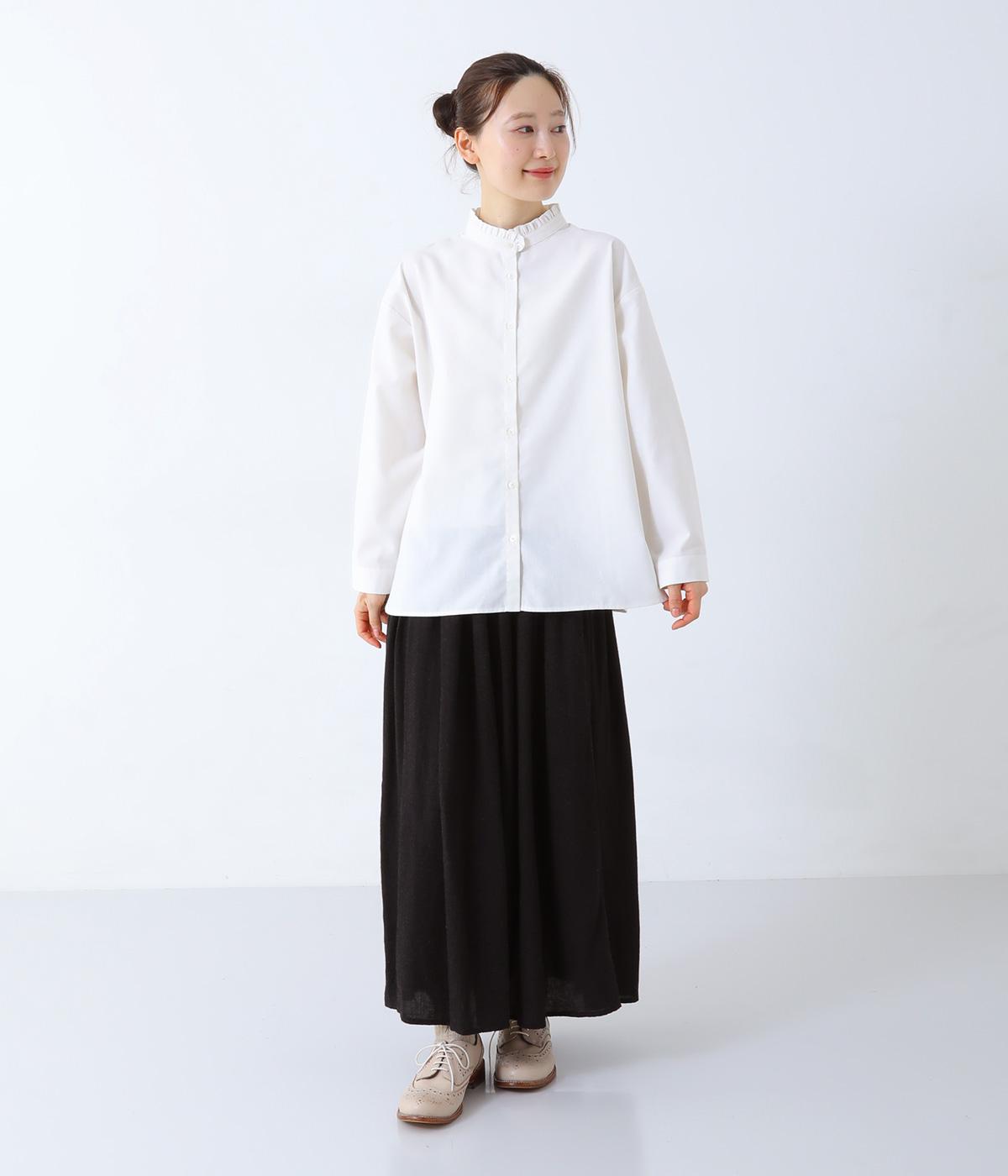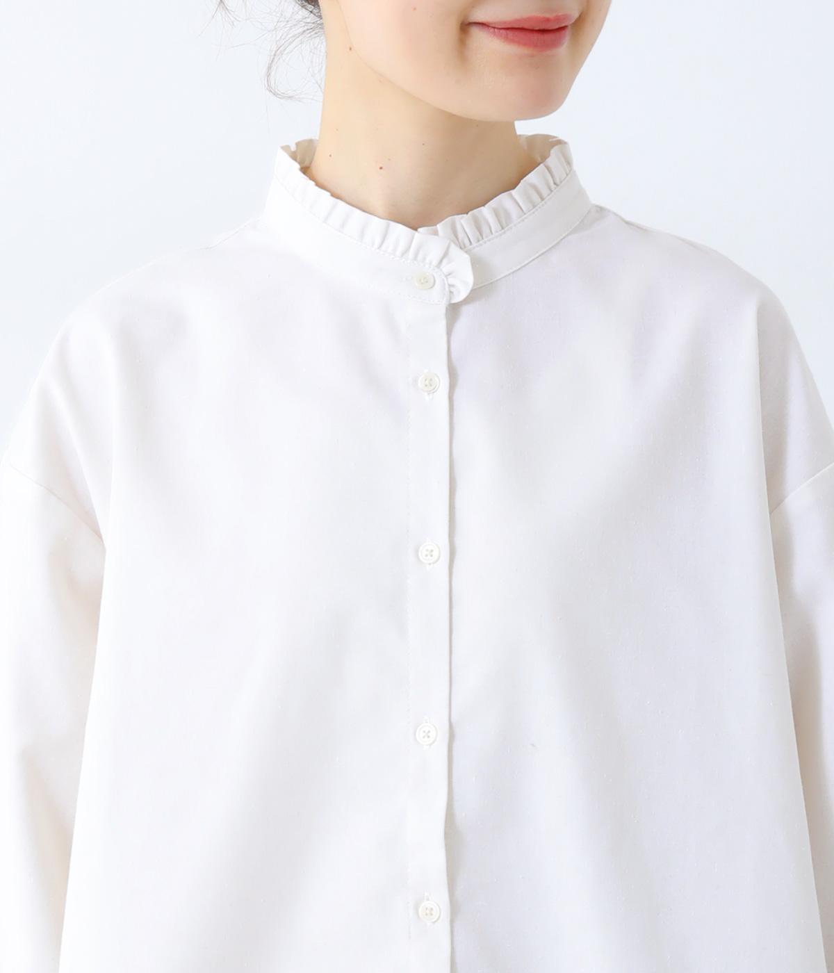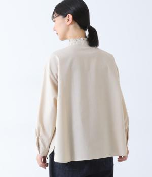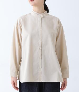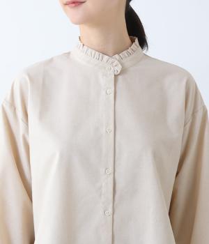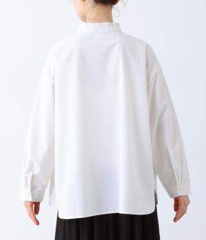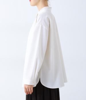 フリルのスタンドカラーが顔まわりをフェミニンに印象づけるブラウス。シンプルなデザインで甘さをおさえ、大人の女性にぴったりな一着に仕上げました。脇に抜け感のあるラウンドヘムで横姿も美しく。ニットを重ねて襟を覗かせた、クラシカルなスタイルもおすすめです。