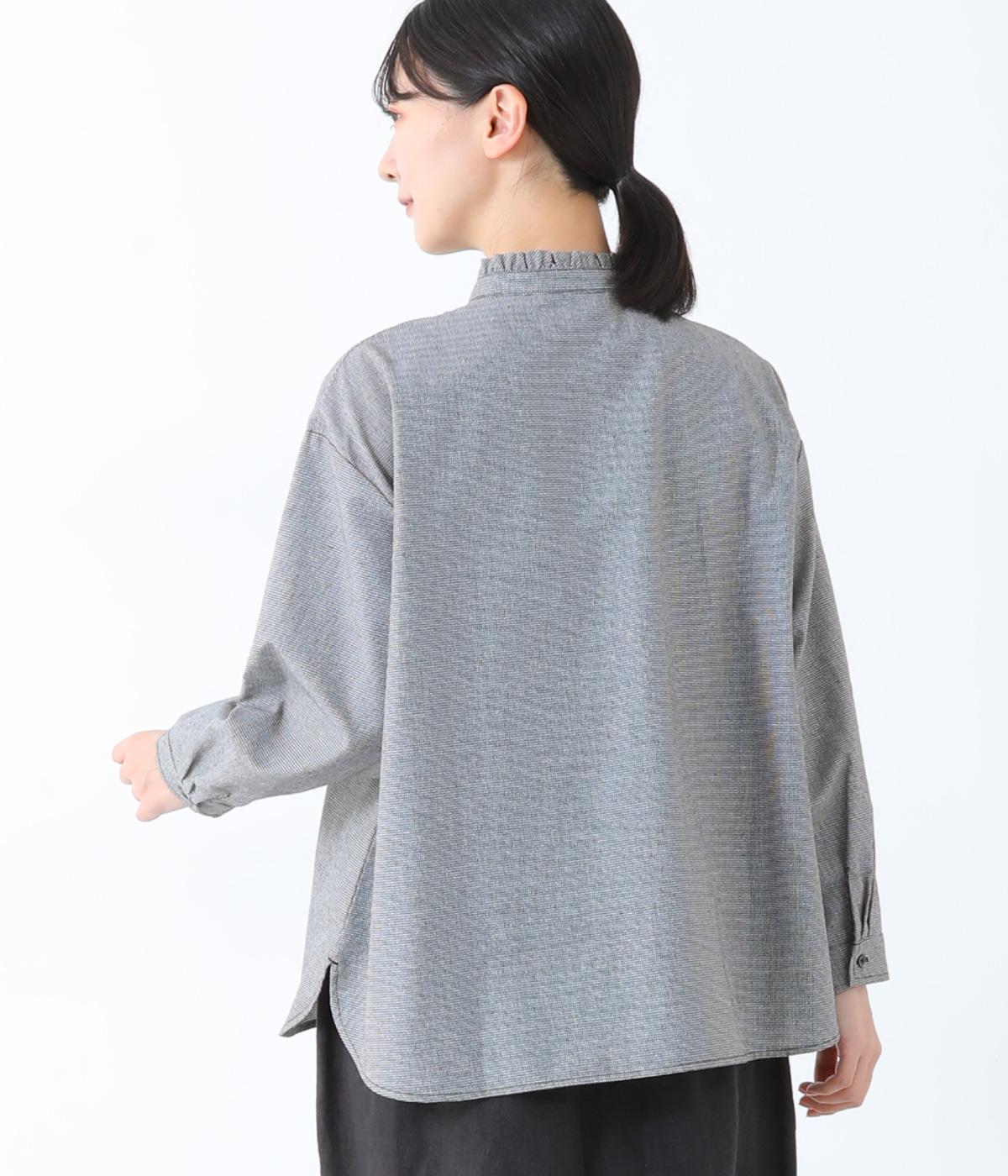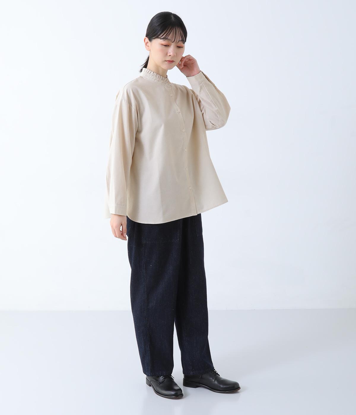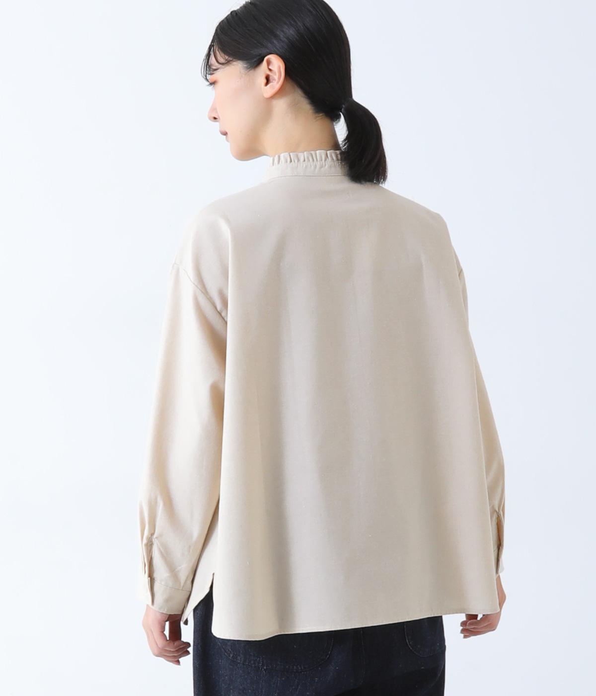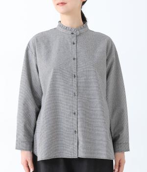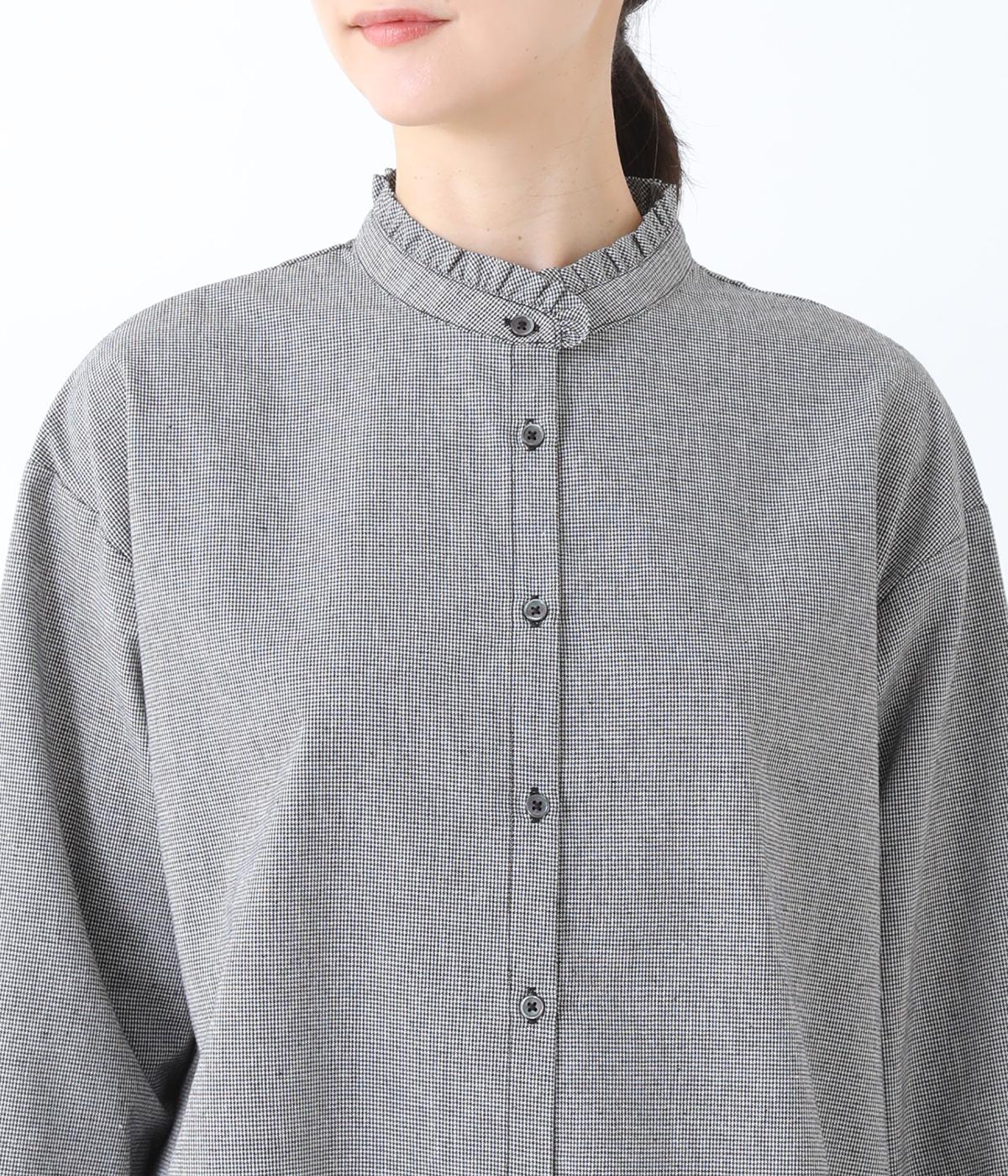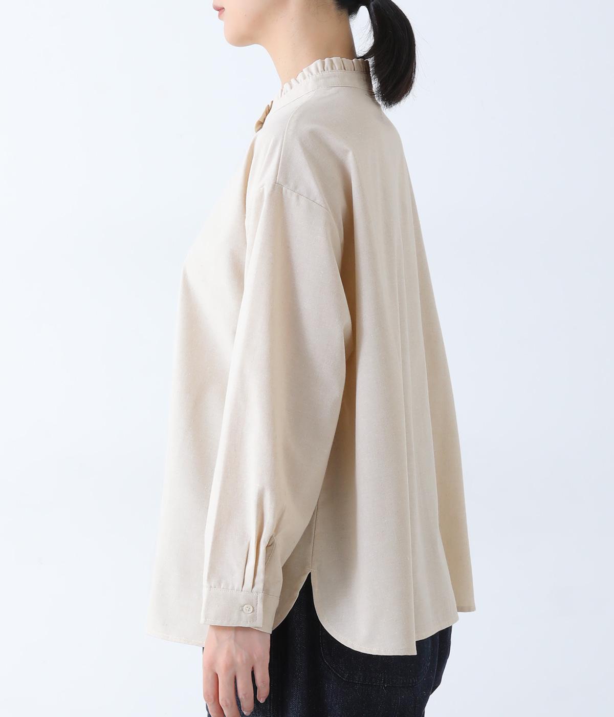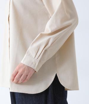 フリルのスタンドカラーが顔まわりをフェミニンに印象づけるブラウス。シンプルなデザインで甘さをおさえ、大人の女性にぴったりな一着に仕上げました。脇に抜け感のあるラウンドヘムで横姿も美しく。ニットを重ねて襟を覗かせた、クラシカルなスタイルもおすすめです。