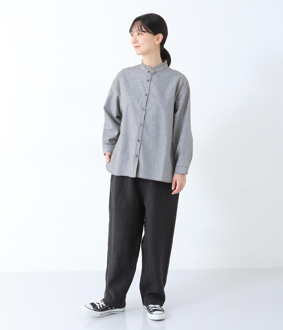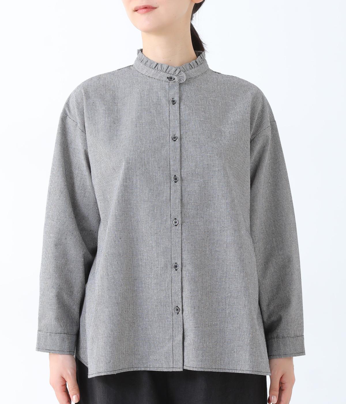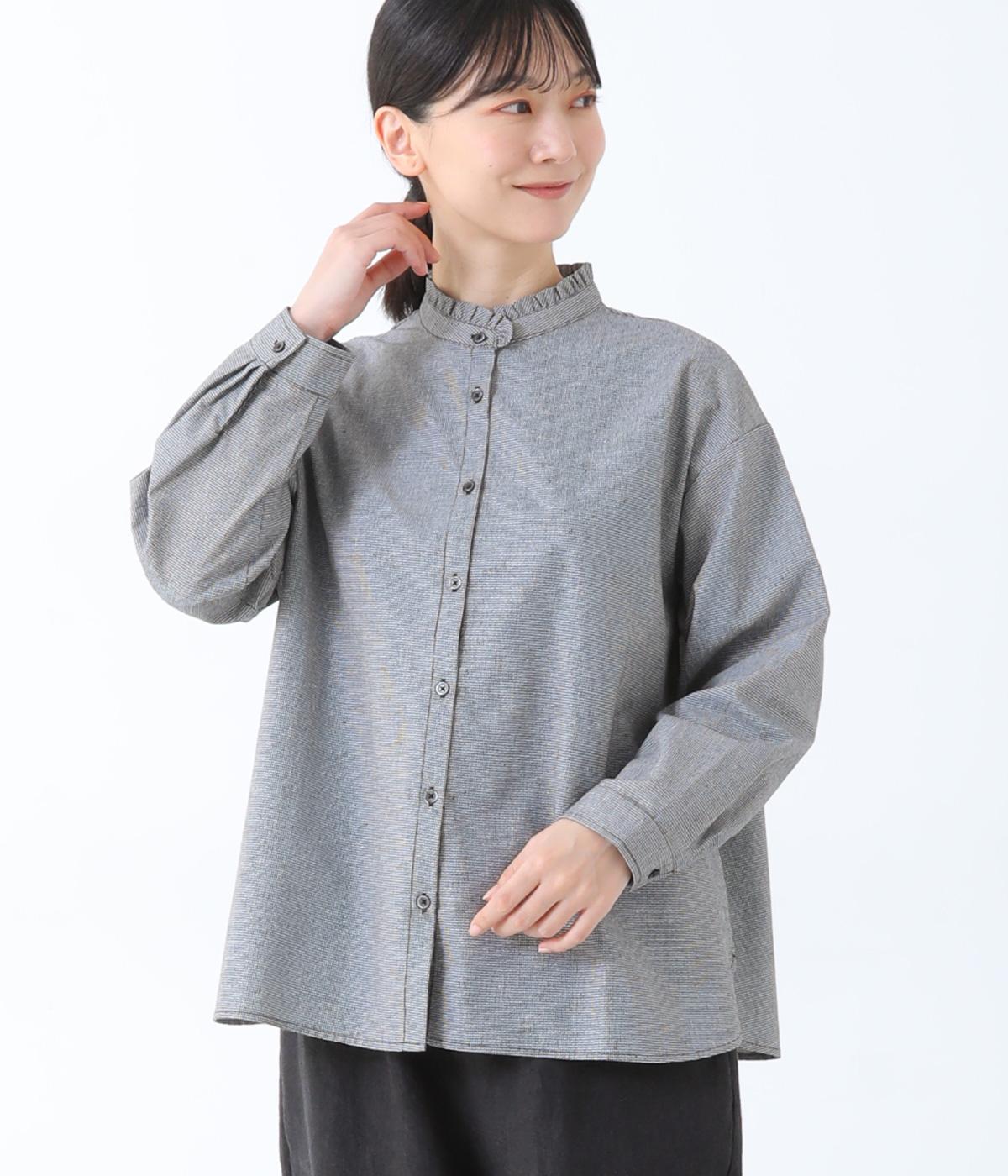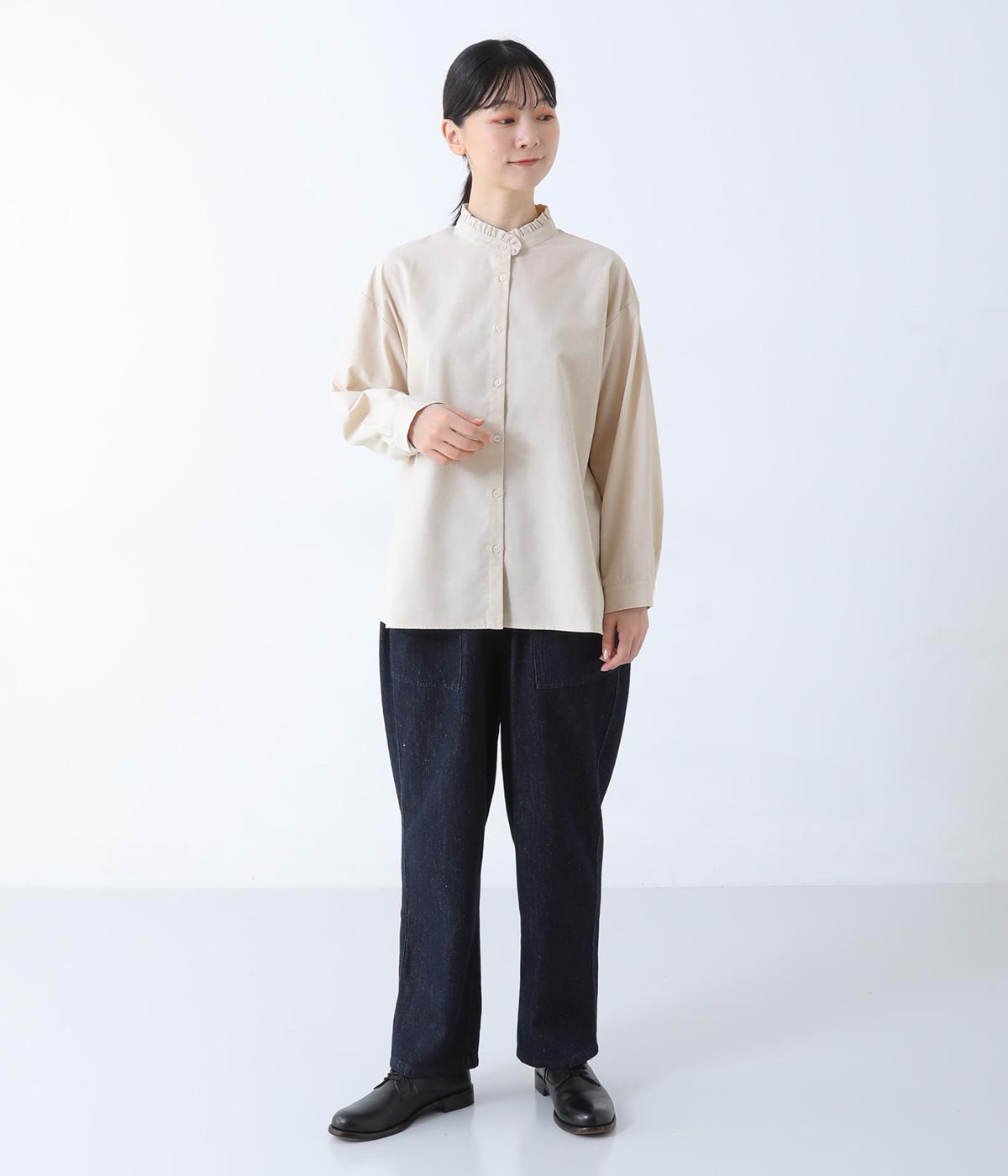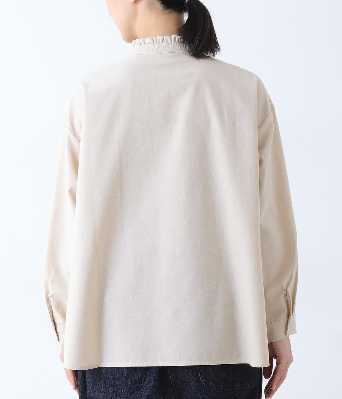 フリルのスタンドカラーが顔まわりをフェミニンに印象づけるブラウス。シンプルなデザインで甘さをおさえ、大人の女性にぴったりな一着に仕上げました。脇に抜け感のあるラウンドヘムで横姿も美しく。ニットを重ねて襟を覗かせた、クラシカルなスタイルもおすすめです。
