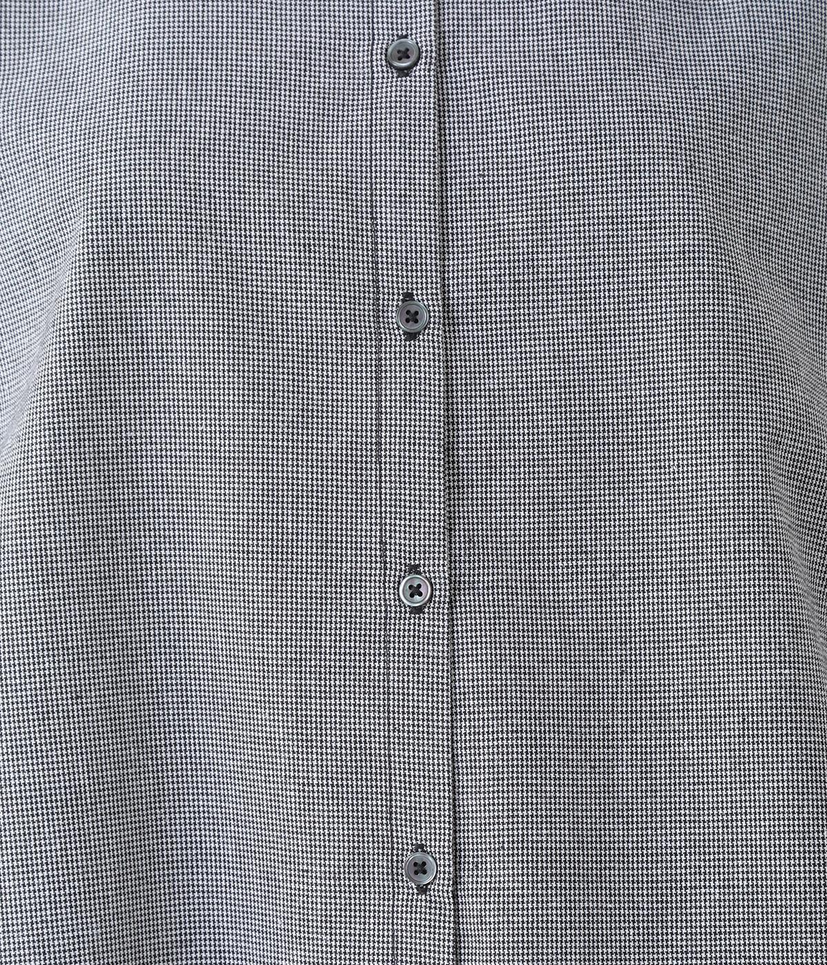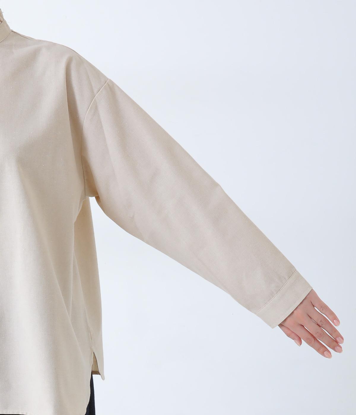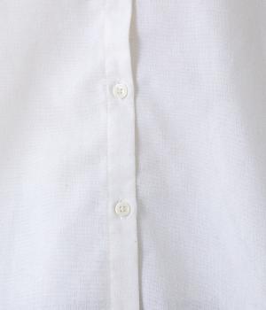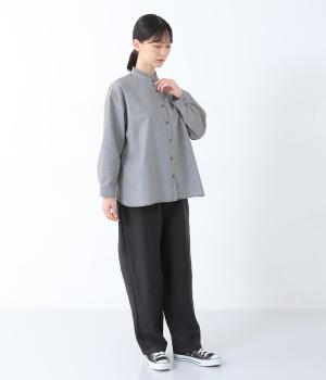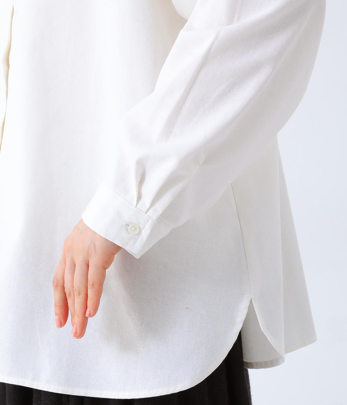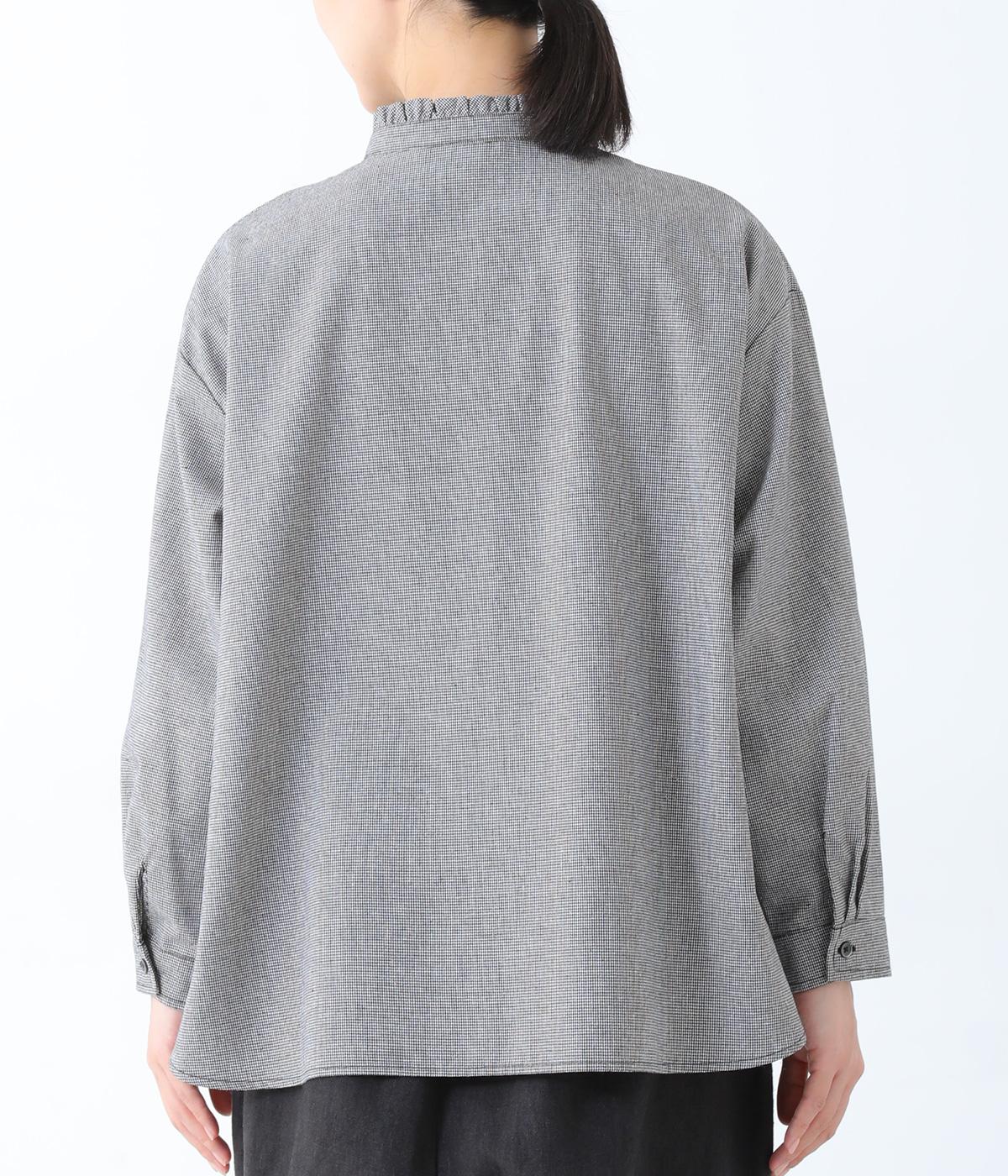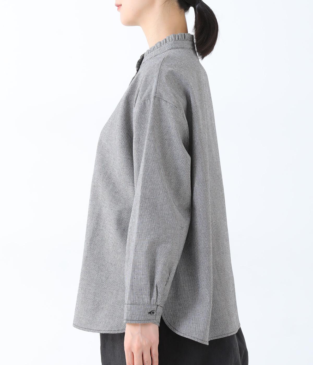フリルのスタンドカラーが顔まわりをフェミニンに印象づけるブラウス。シンプルなデザインで甘さをおさえ、大人の女性にぴったりな一着に仕上げました。脇に抜け感のあるラウンドヘムで横姿も美しく。ニットを重ねて襟を覗かせた、クラシカルなスタイルもおすすめです。