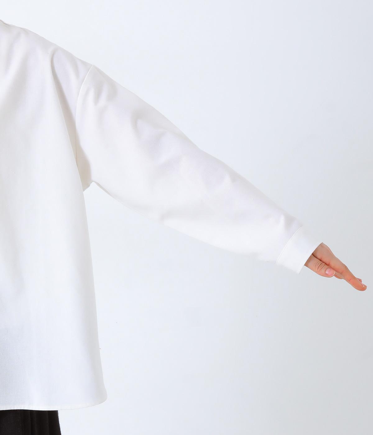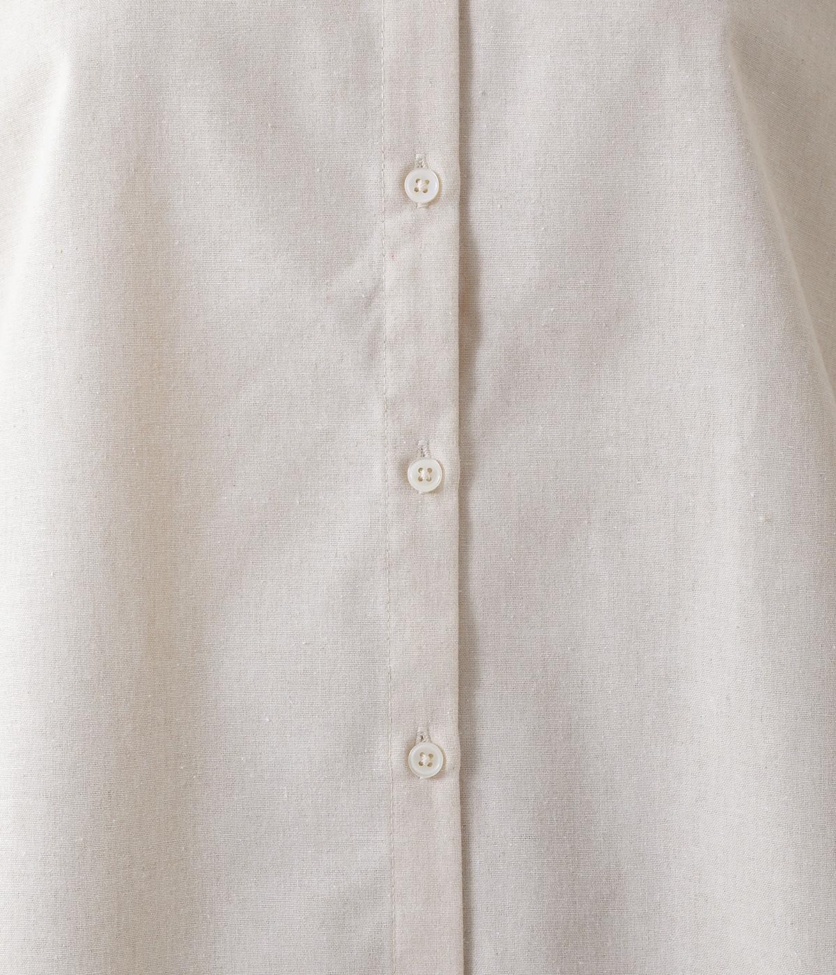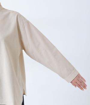 リネンのようにネップの見えるナチュラルな佇まいが、着こなしを品よく仕上げてくれる生地。適度なハリとしっかりとした肉感があり、メイントップスとして一枚でサマ見えします。