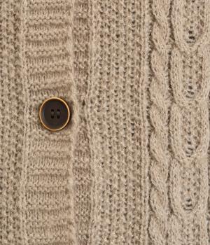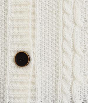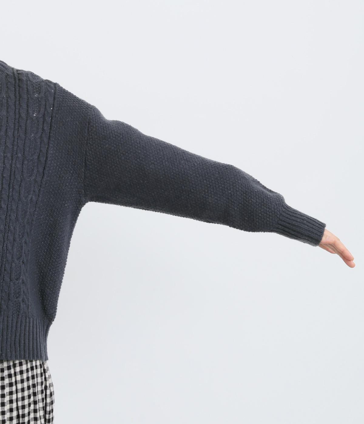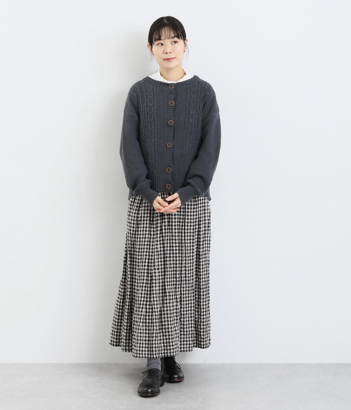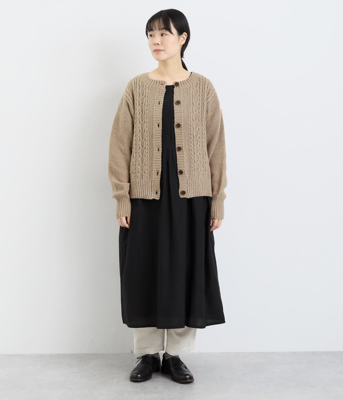なめらかさが特徴のポリエステル素材。軽量で持ち運びもしやすく、外出時に気軽に羽織ることができます。大きめに編まれたニットが抜け感を漂わせます。
