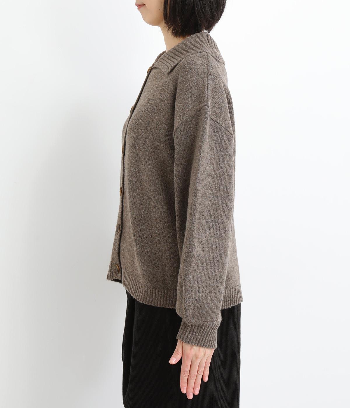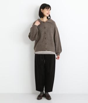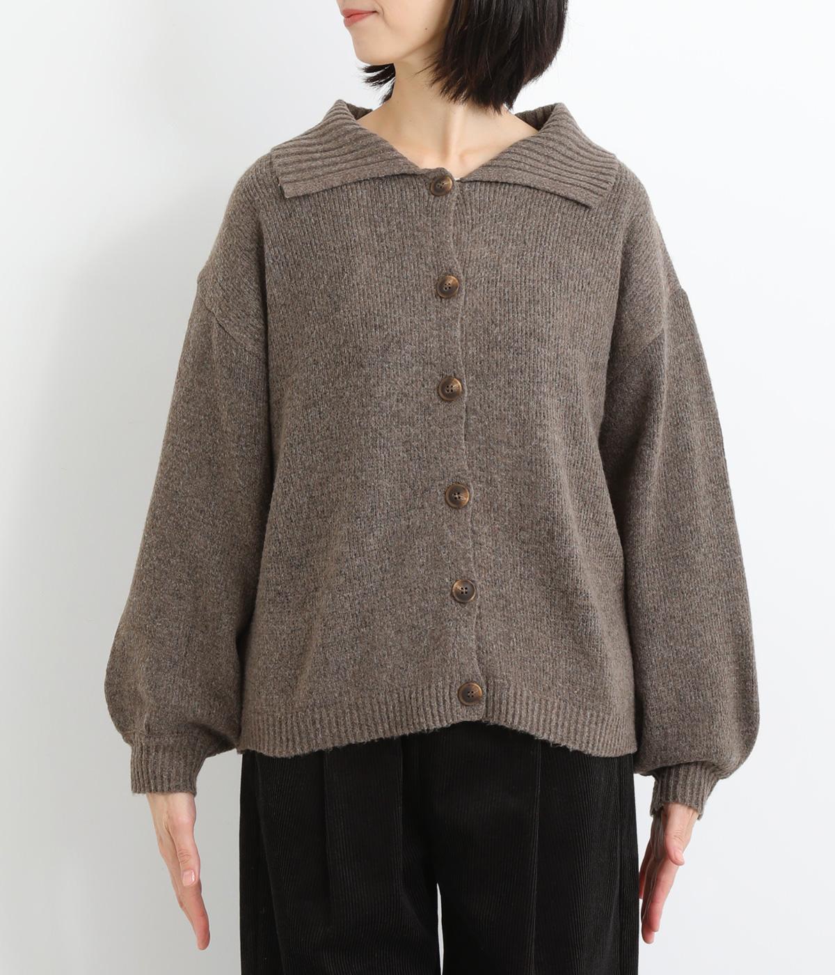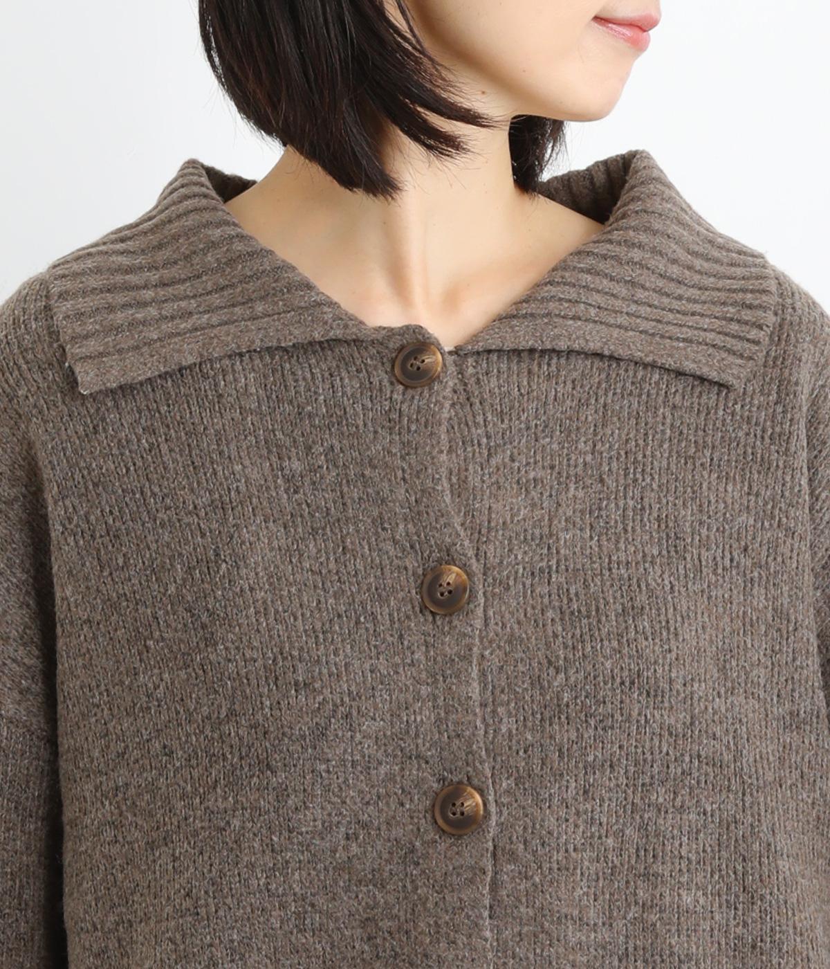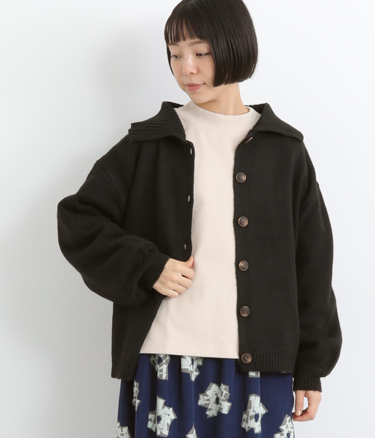 すっきりとした品のいい編み模様に襟つきで大人仕様に仕上げたカーディガン。自然とたぷっとなる袖口が可愛らしいニュアンスを生み、ボタンを留めてトップス感覚でメイン使いにするのもおすすめ。大きめのボタンもワンポイントに。