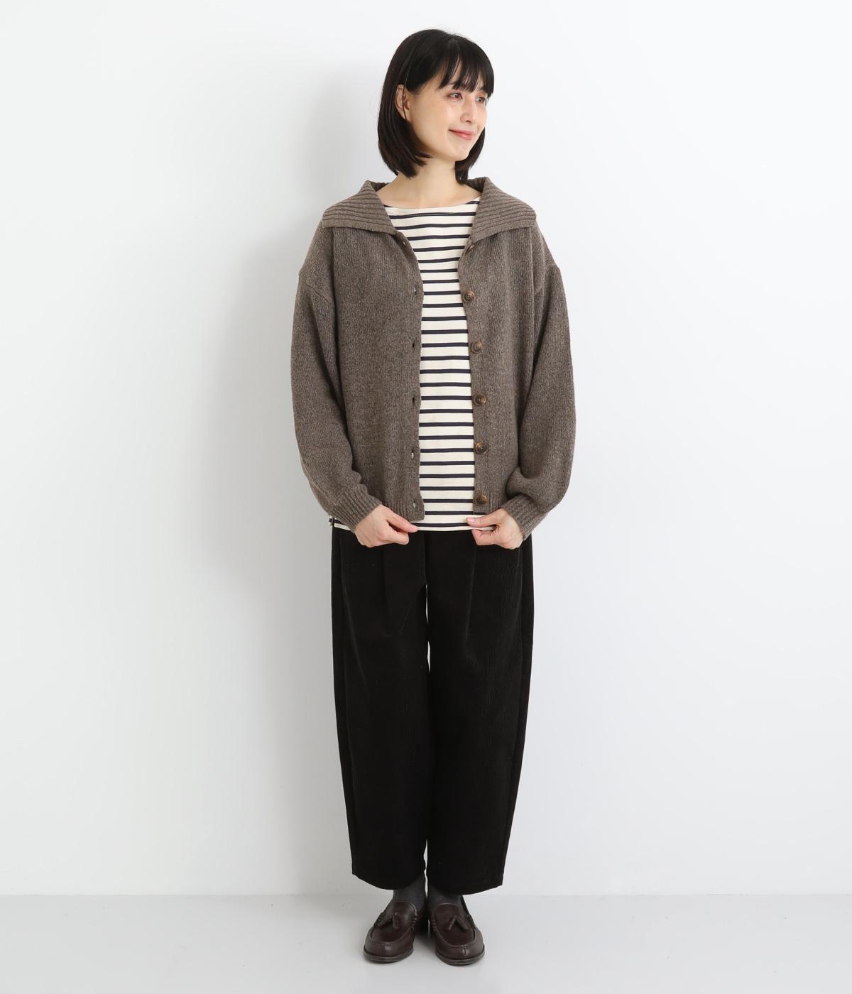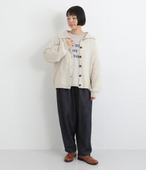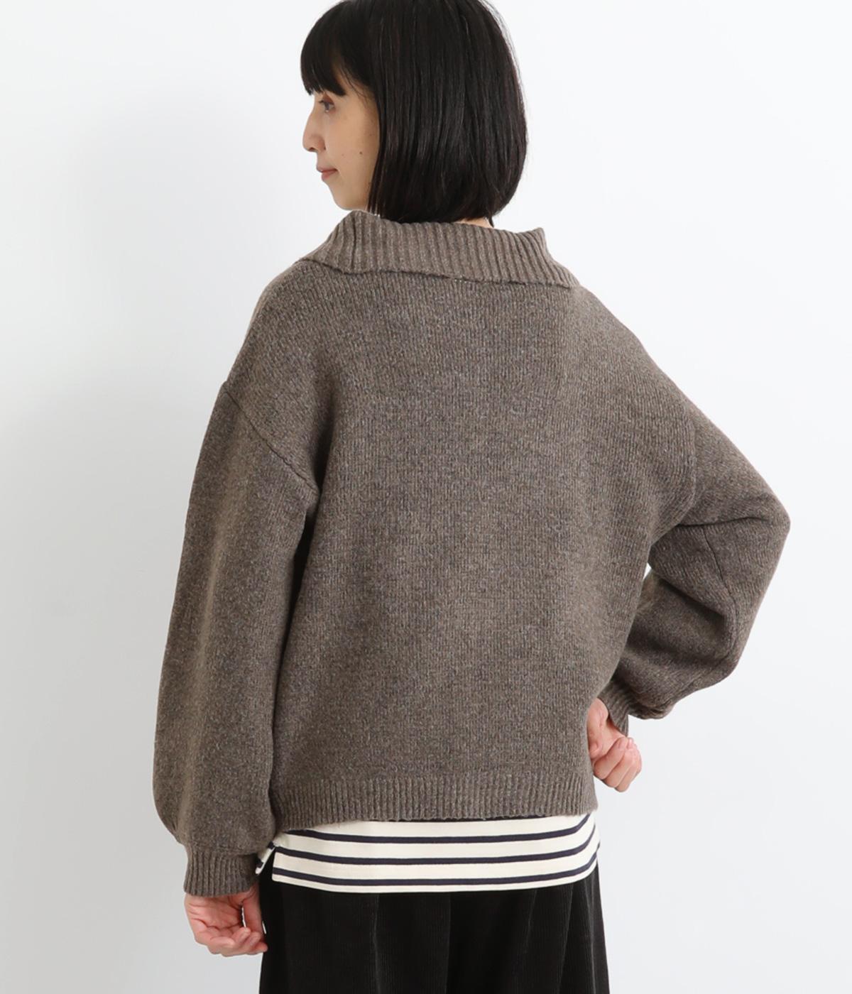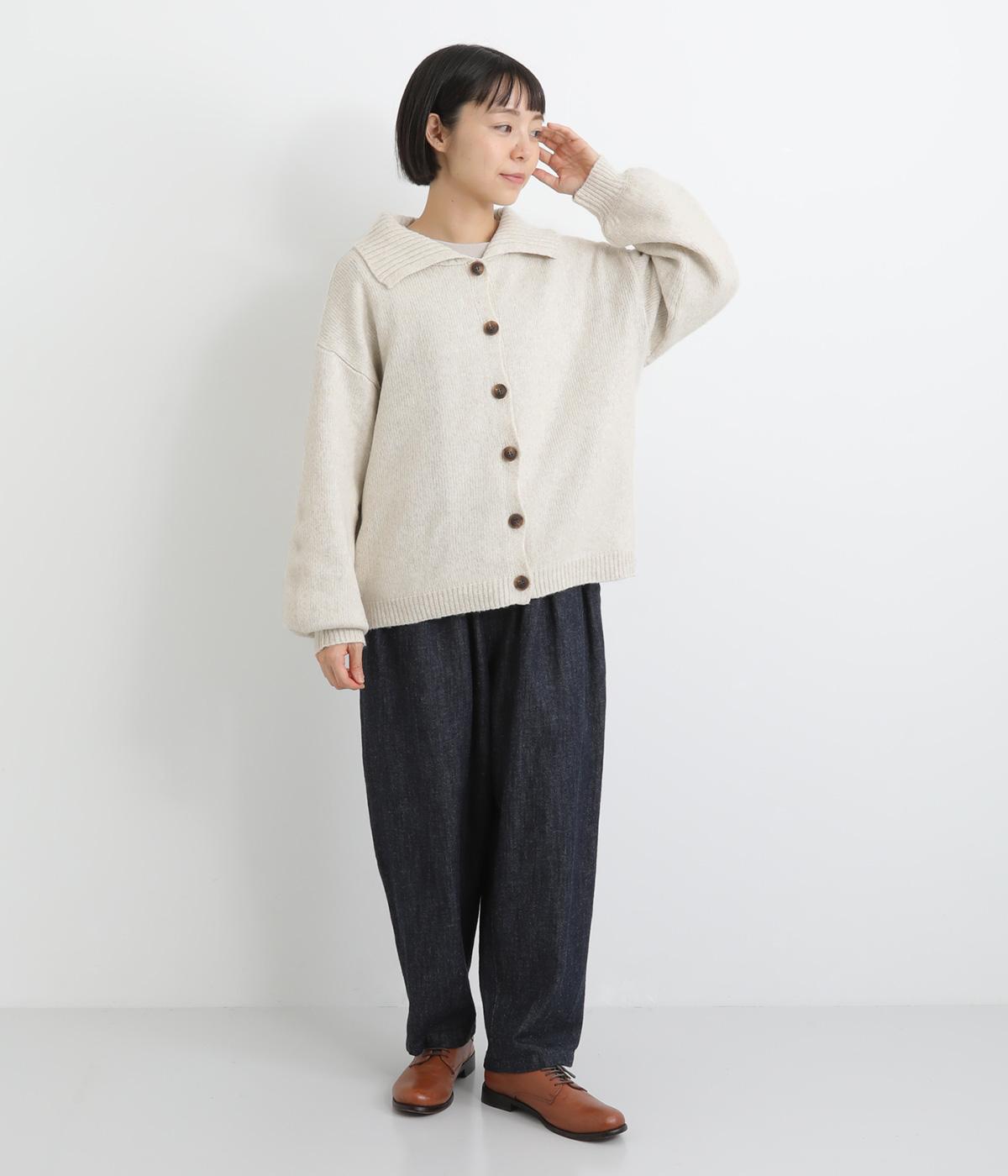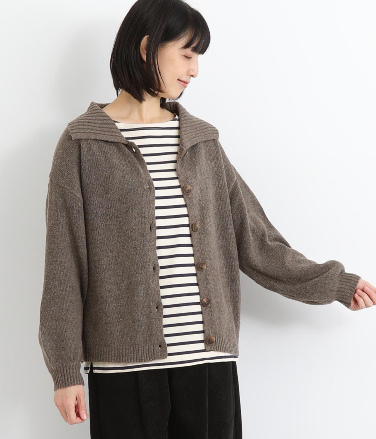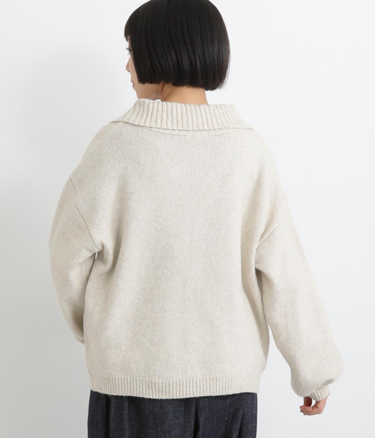 すっきりとした品のいい編み模様に襟つきで大人仕様に仕上げたカーディガン。自然とたぷっとなる袖口が可愛らしいニュアンスを生み、ボタンを留めてトップス感覚でメイン使いにするのもおすすめ。大きめのボタンもワンポイントに。