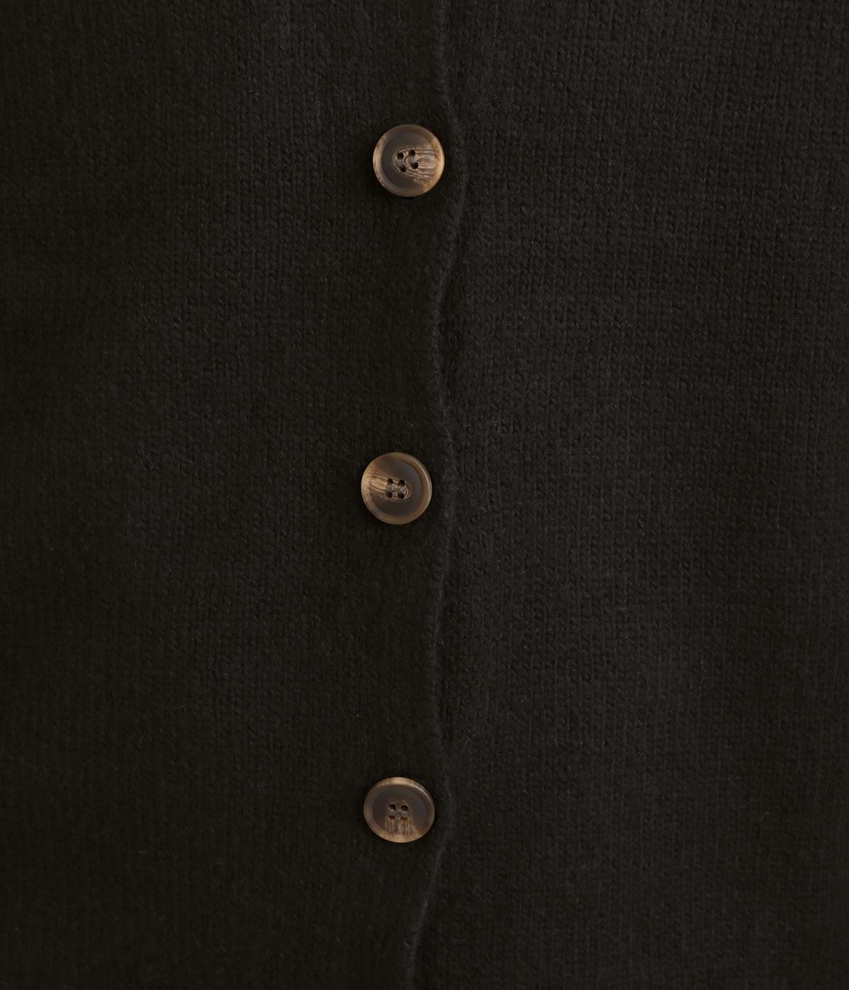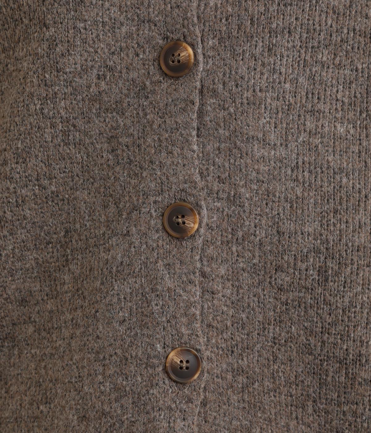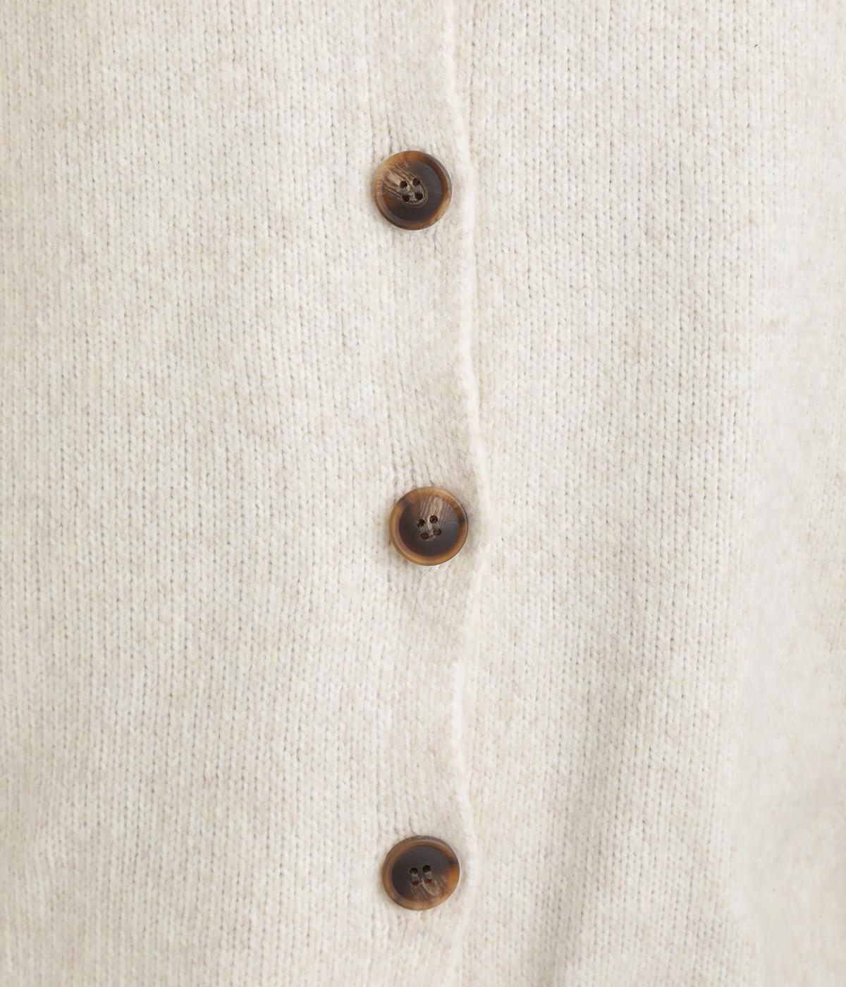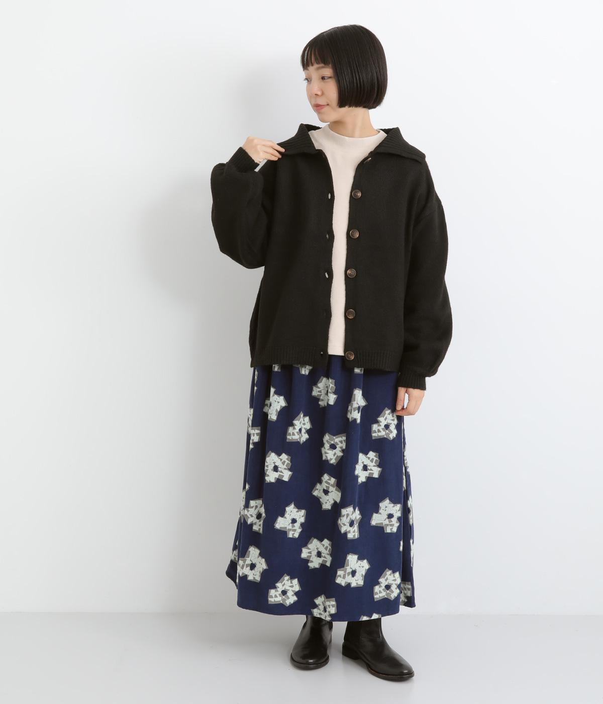 すっきりとした品のいい編み模様に襟つきで大人仕様に仕上げたカーディガン。自然とたぷっとなる袖口が可愛らしいニュアンスを生み、ボタンを留めてトップス感覚でメイン使いにするのもおすすめ。大きめのボタンもワンポイントに。