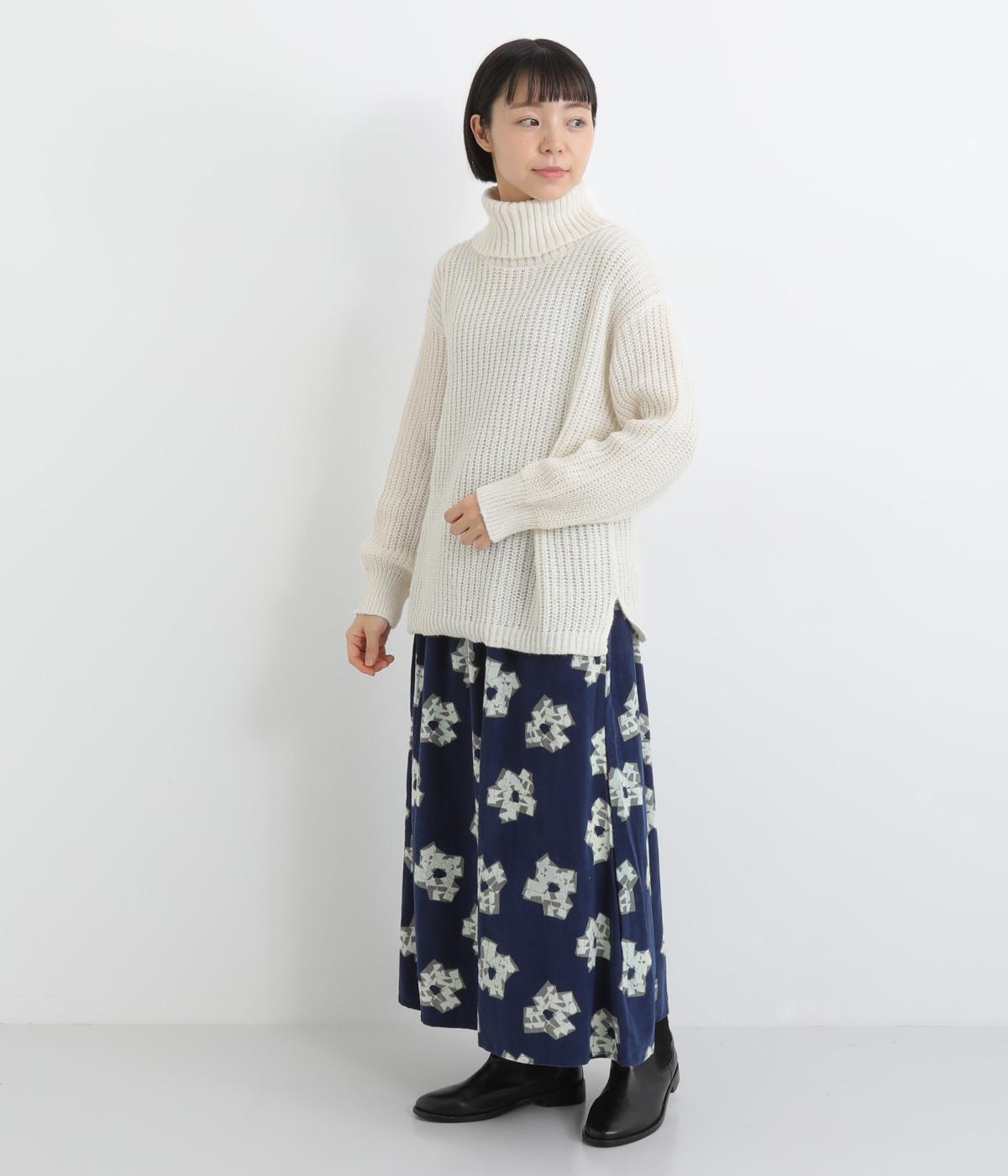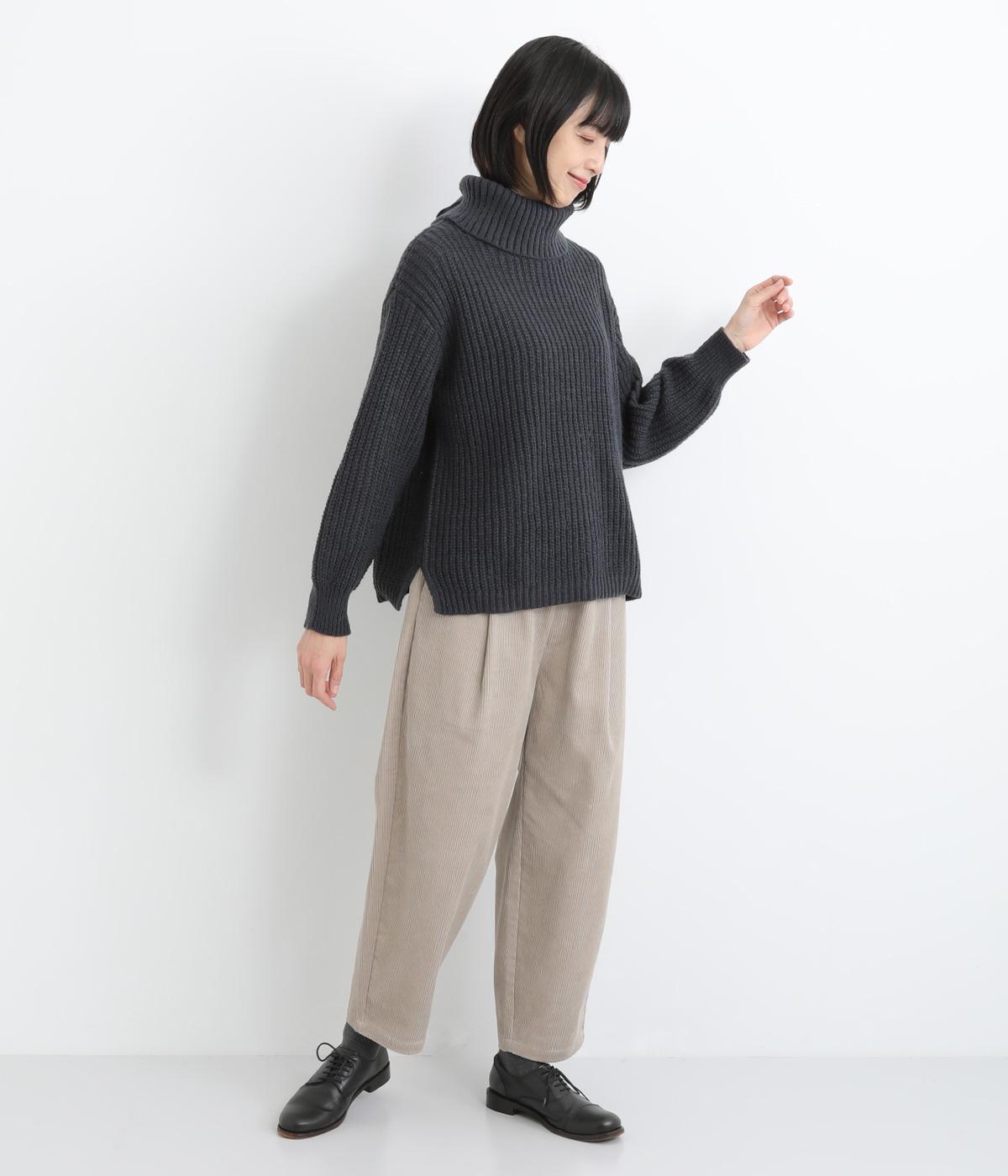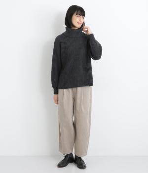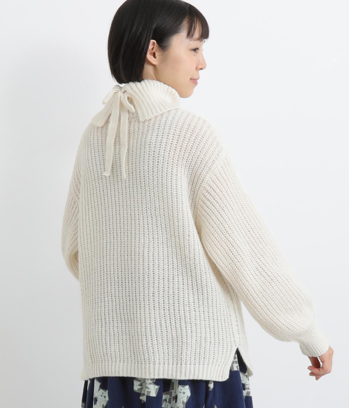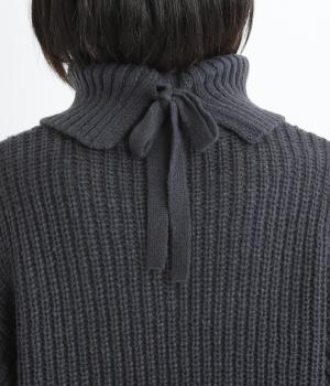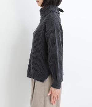 ベーシックなボックスシルエットに袖とタートルネックのボリューム感がアクセントになっています。後ろネックのリボンが大人かわいいディテールに。シンプルで着まわしやすく、サイドスリット入りでボトム合わせもすっきりきまります。