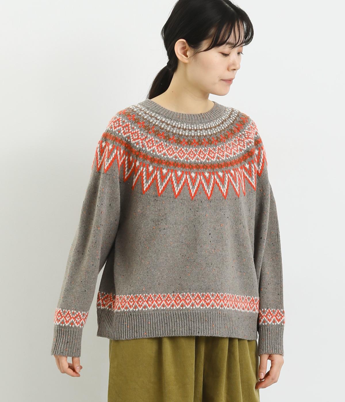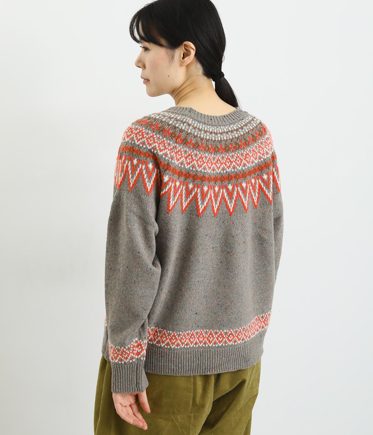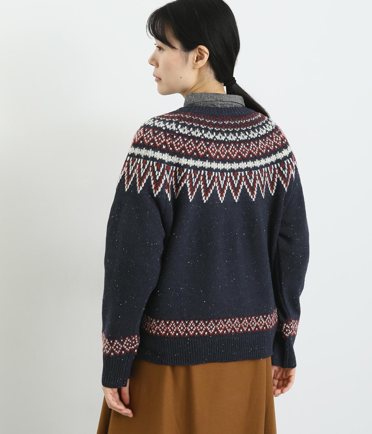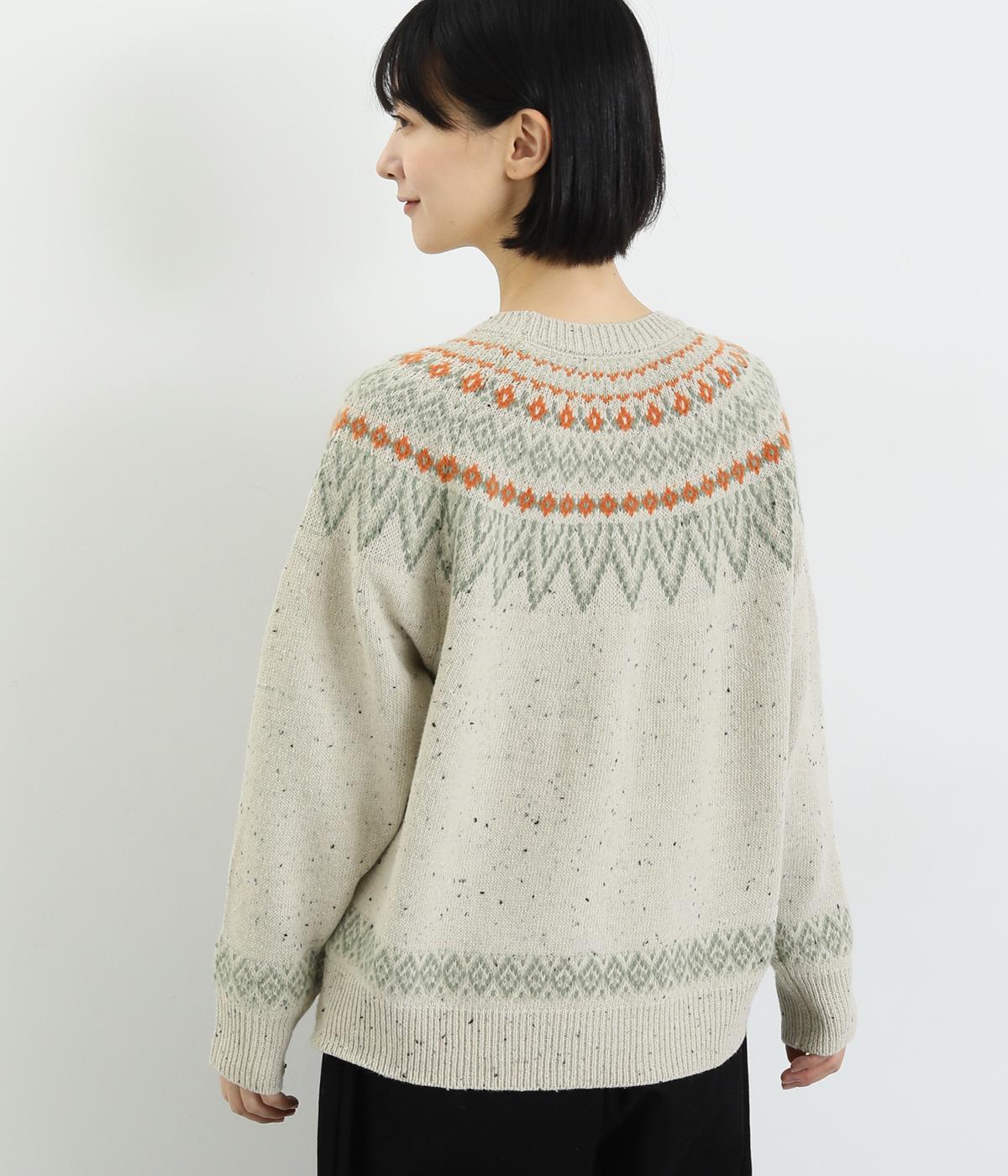 粒々としたネップ入りのニュアンスたっぷりのニット。ところどころに出ている色みがかわいらしく、編み柄のパターンともマッチしています。軽くやわらかなウール混素材で、デイリー使いにおすすめ。