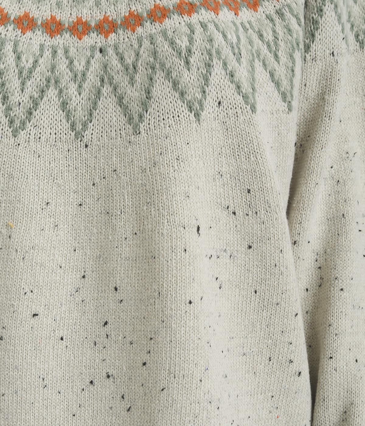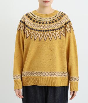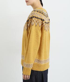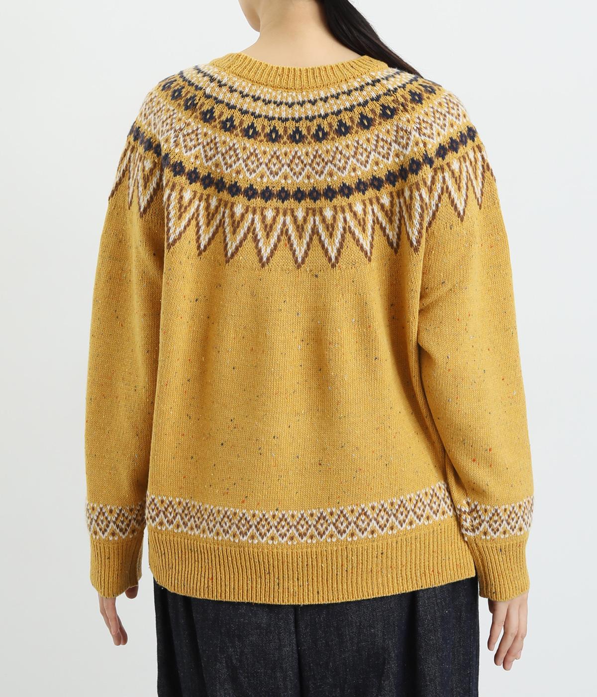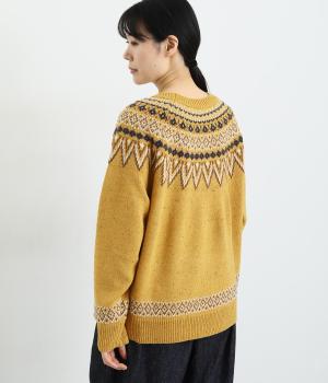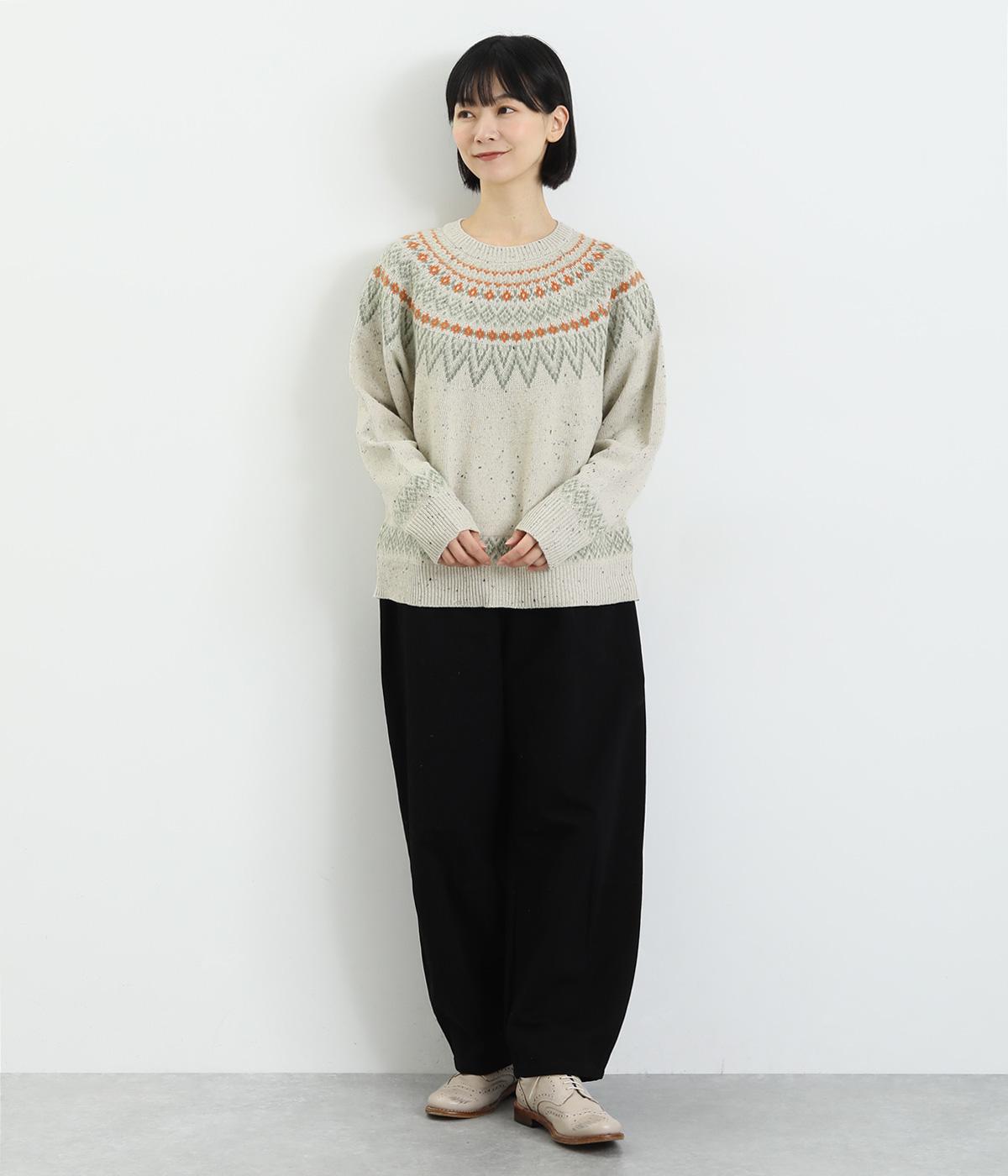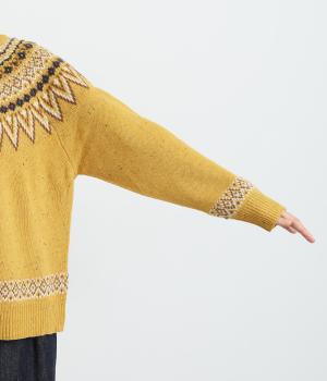 粒々としたネップ入りのニュアンスたっぷりのニット。ところどころに出ている色みがかわいらしく、編み柄のパターンともマッチしています。軽くやわらかなウール混素材で、デイリー使いにおすすめ。