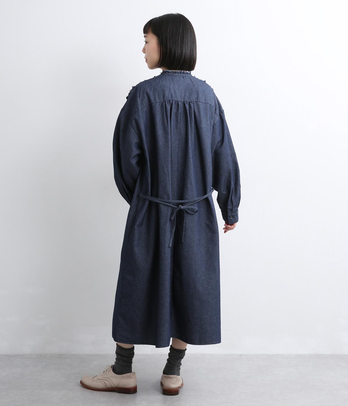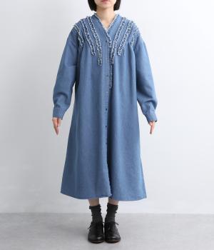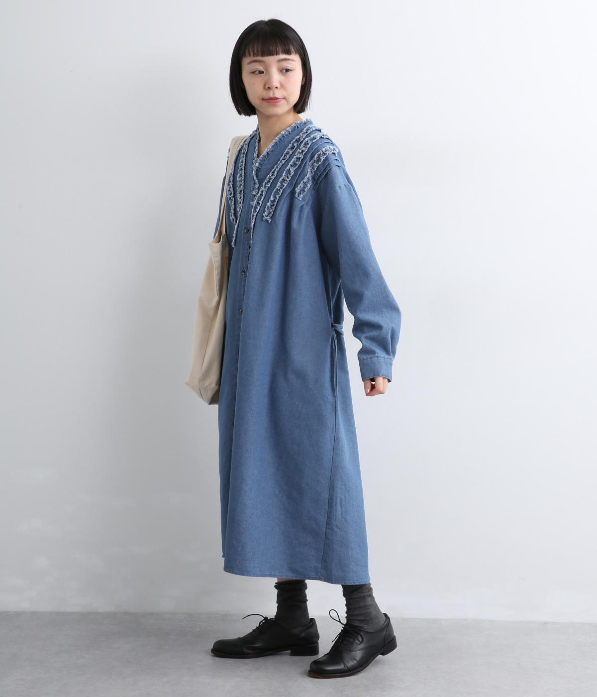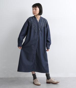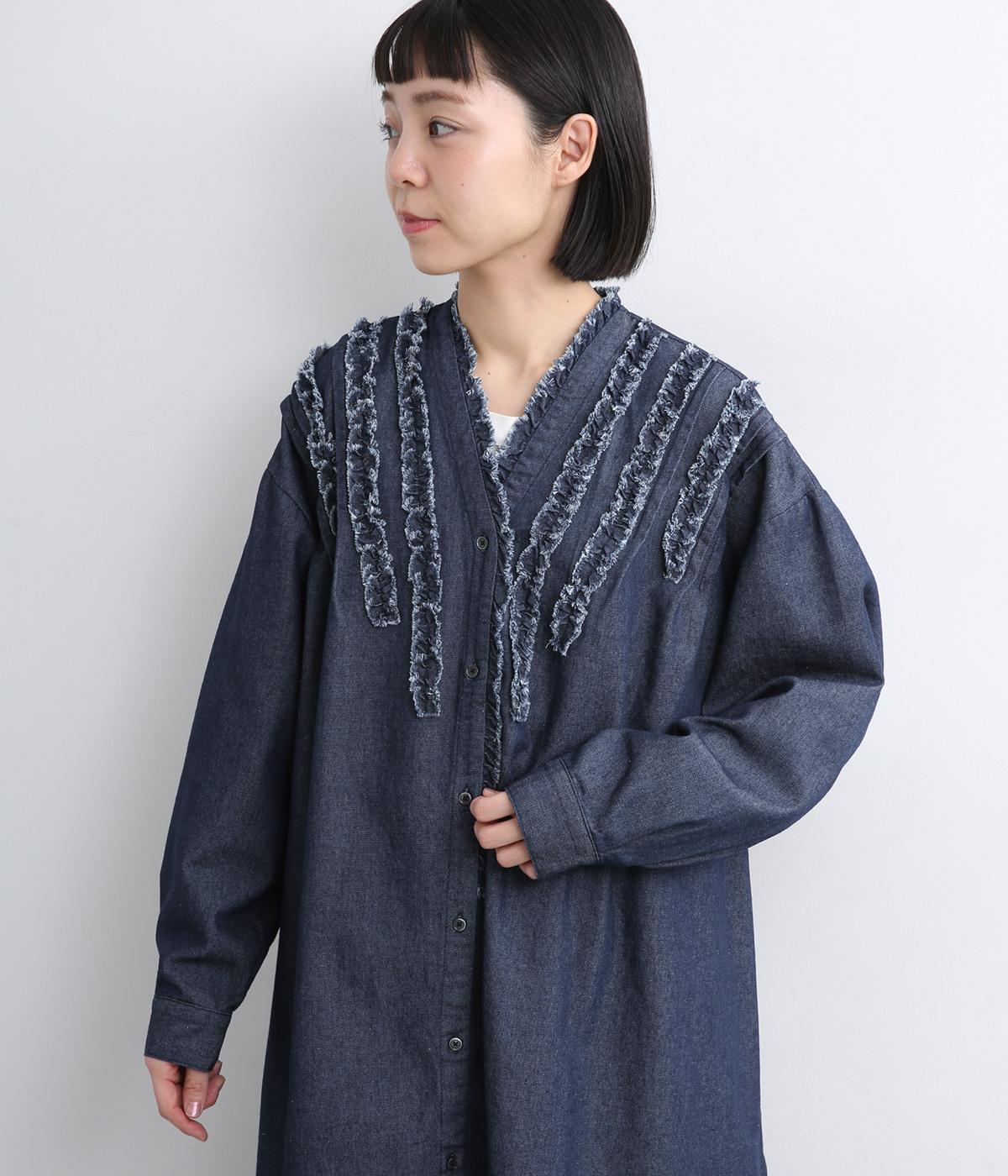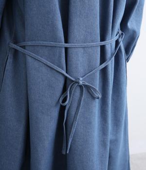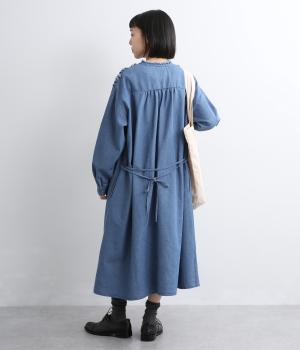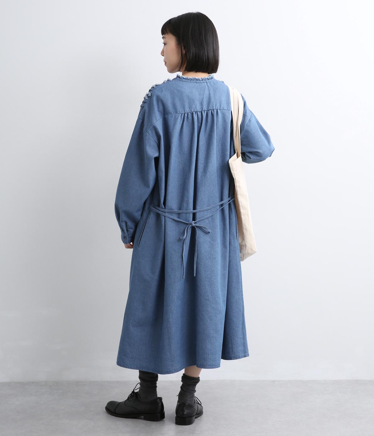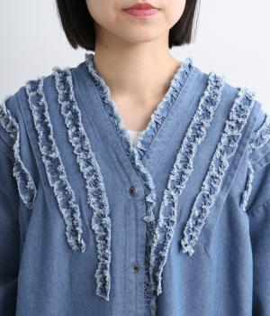切りっぱなしのフリルを首元からあしらい、甘さとカジュアルさをバランスよく融合しました。顔まわりを明るく見せつつ、縦のラインを強調することで全体をすっきりと見せてくれます。ウエストにはブラウジングできる紐つきで、シルエットの調整も自在。一枚で着るのはもちろん、前をあけて羽織りとしても活躍します。
