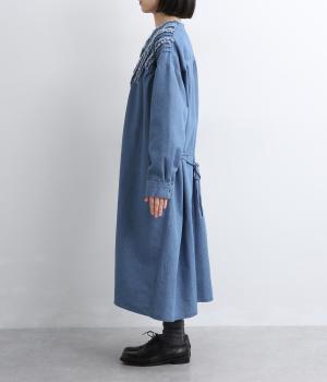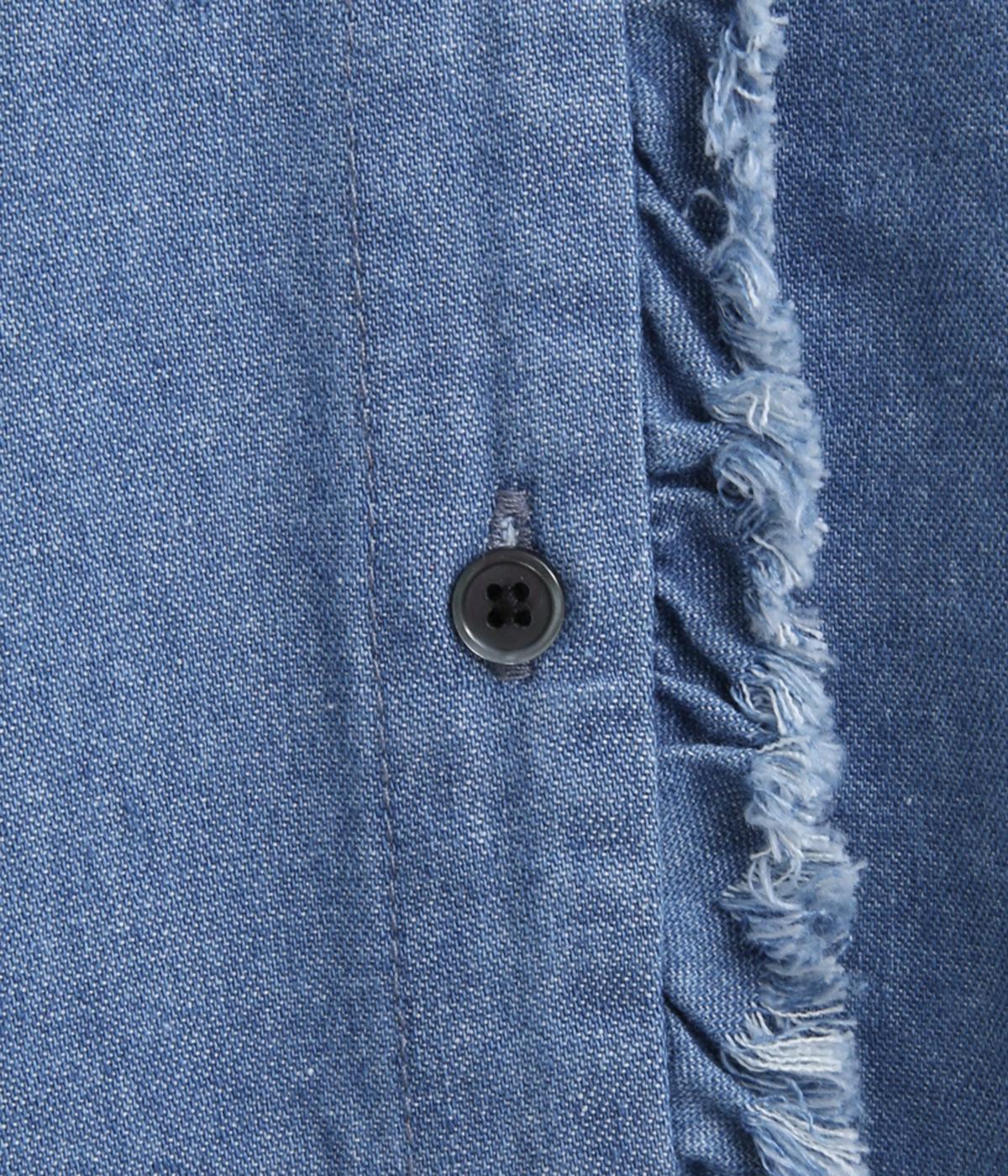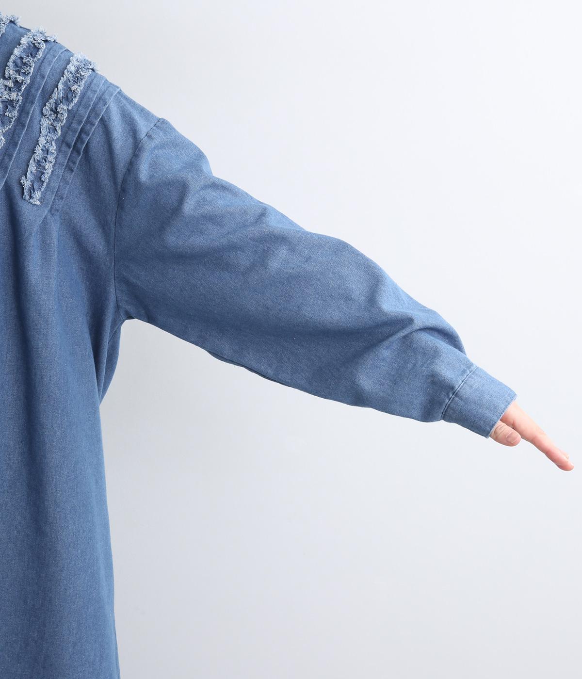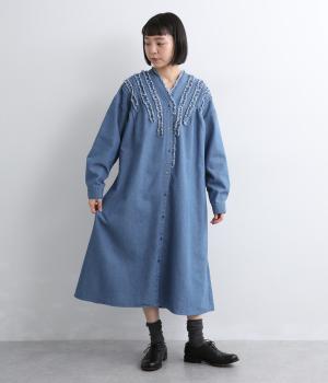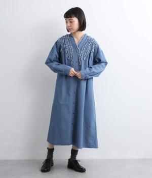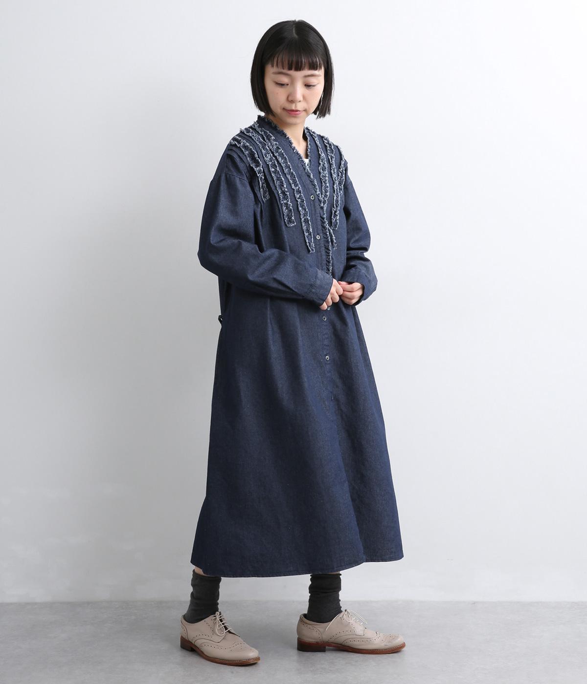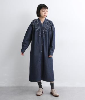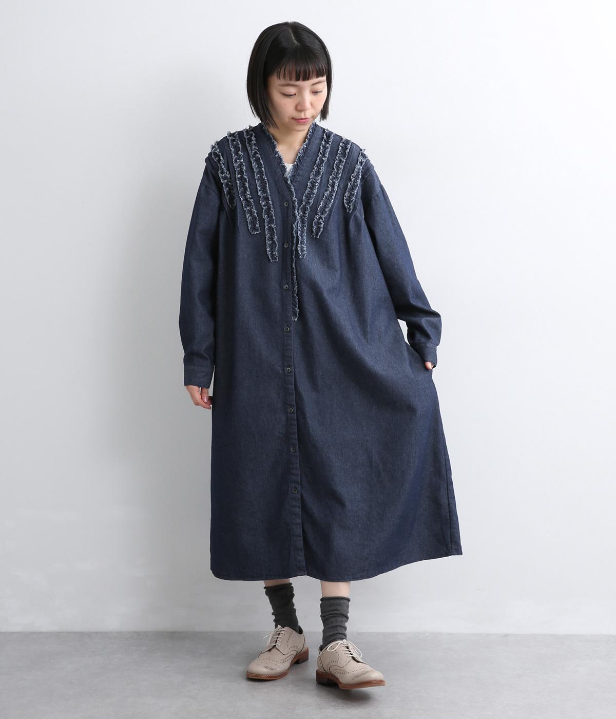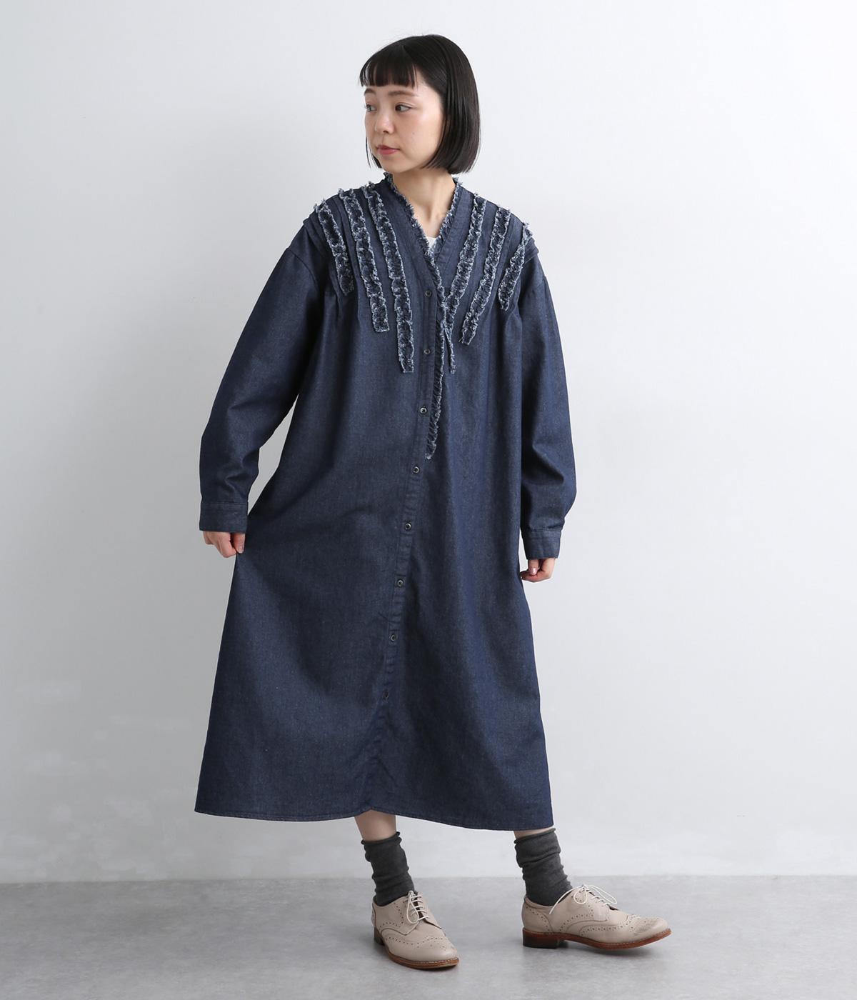 切りっぱなしのフリルを首元からあしらい、甘さとカジュアルさをバランスよく融合しました。顔まわりを明るく見せつつ、縦のラインを強調することで全体をすっきりと見せてくれます。ウエストにはブラウジングできる紐つきで、シルエットの調整も自在。一枚で着るのはもちろん、前をあけて羽織りとしても活躍します。