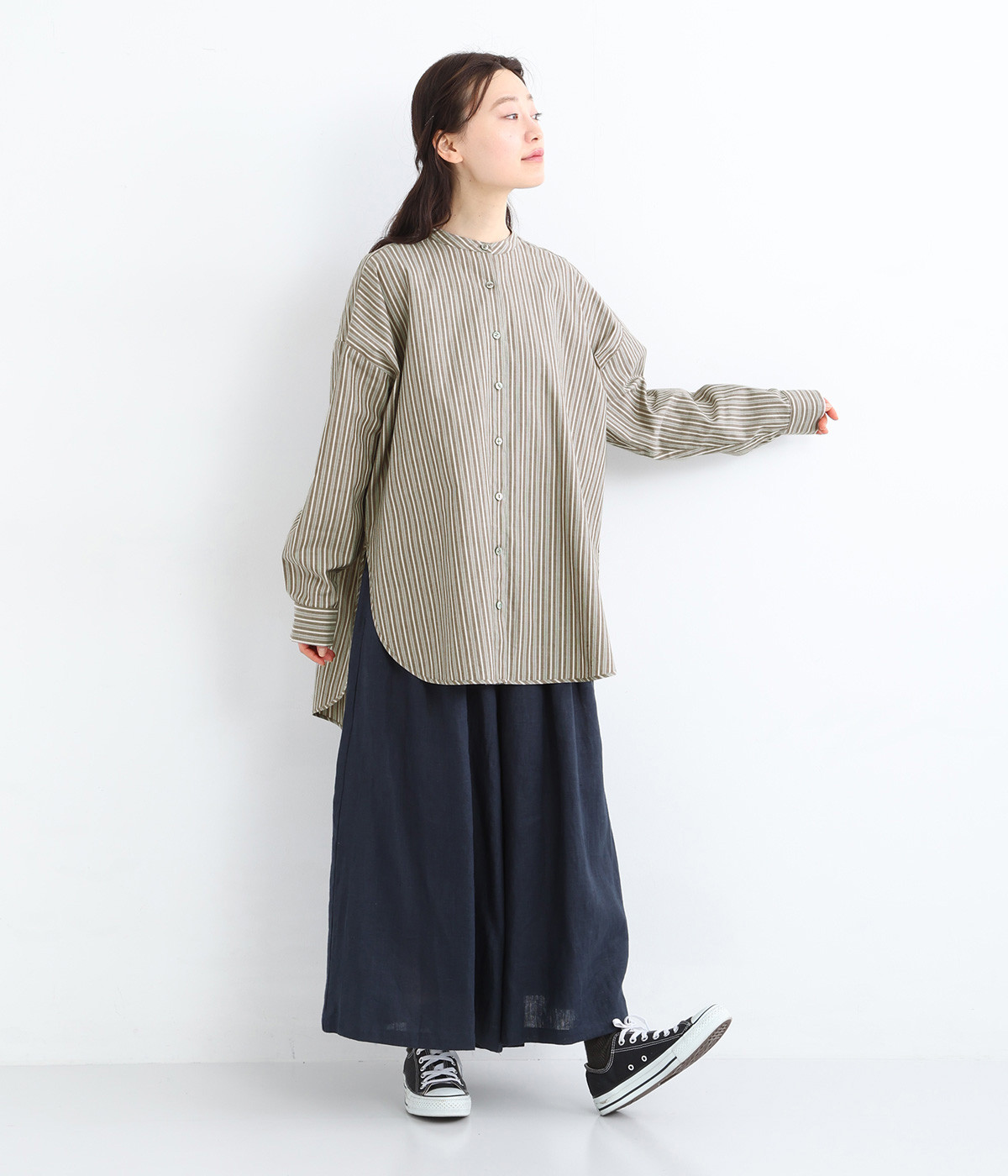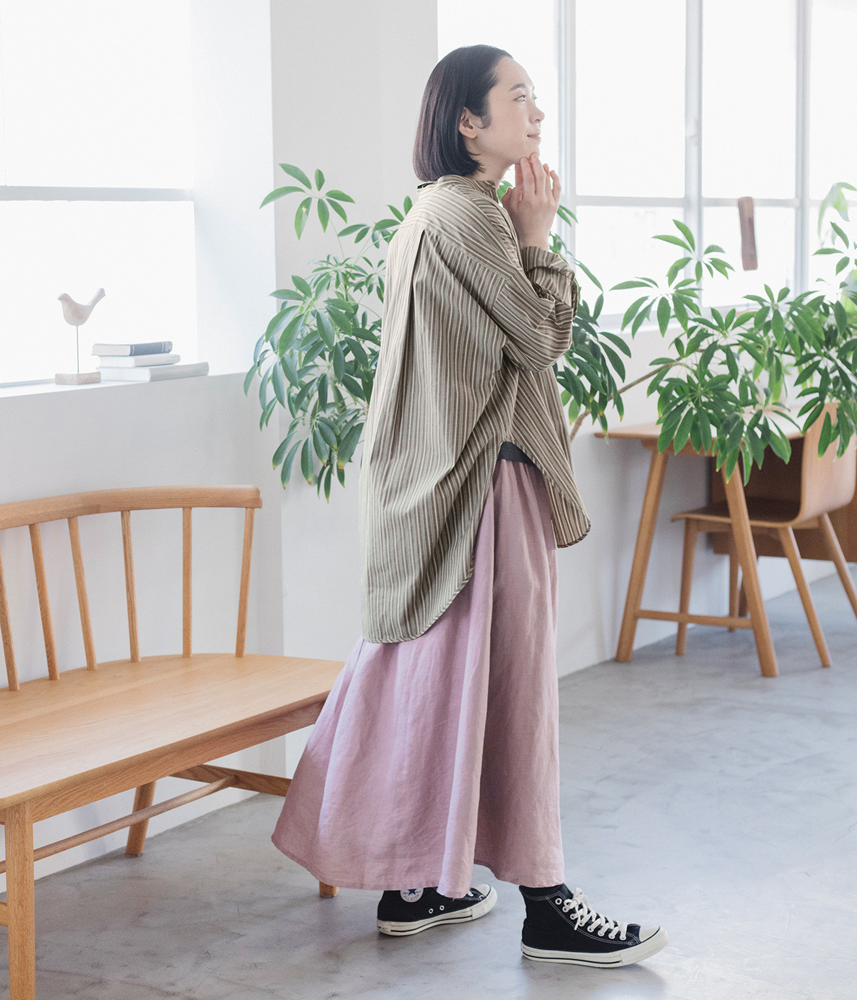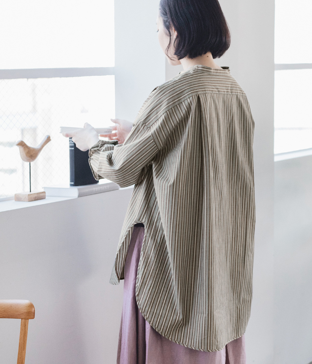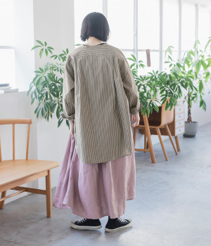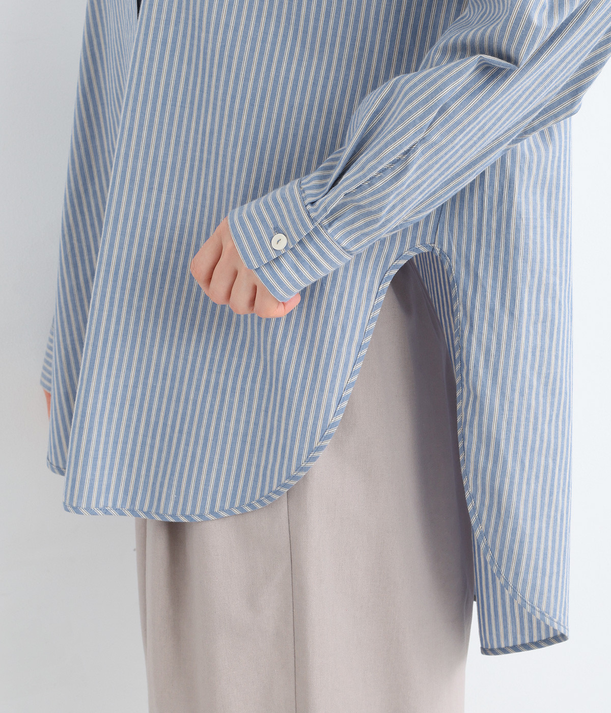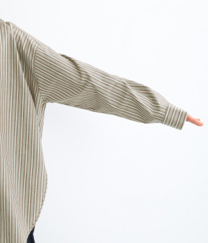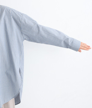 長めの着丈に深くサイドスリットが入っていて、体のラインを拾わないビッグシルエットながらもすっきりとした印象に。デザイン性の高いストライプ柄がコーディネートに清潔感をプラスします。シンプルなインナーに羽織るスタイリングも◎。