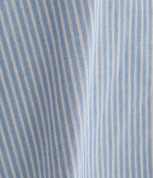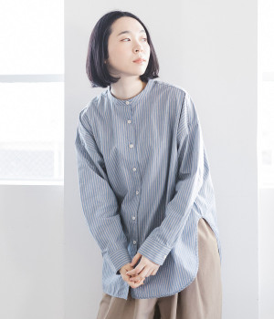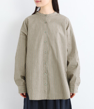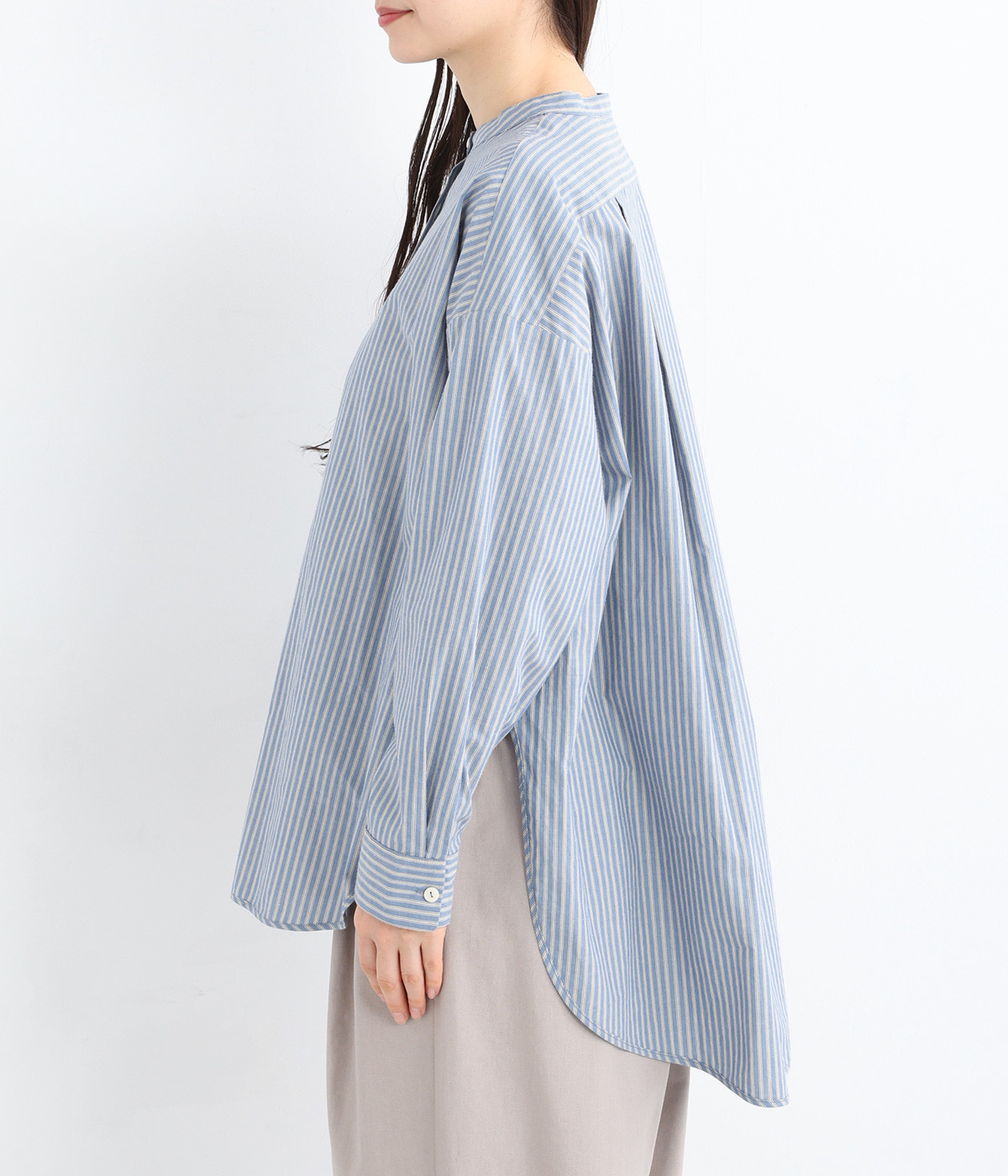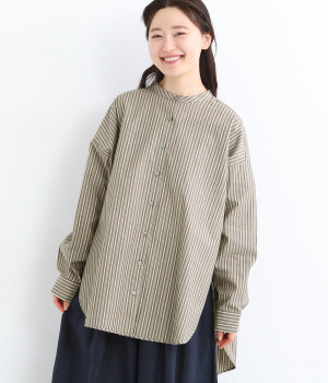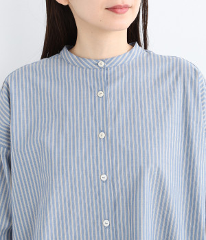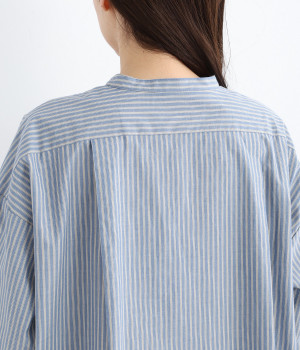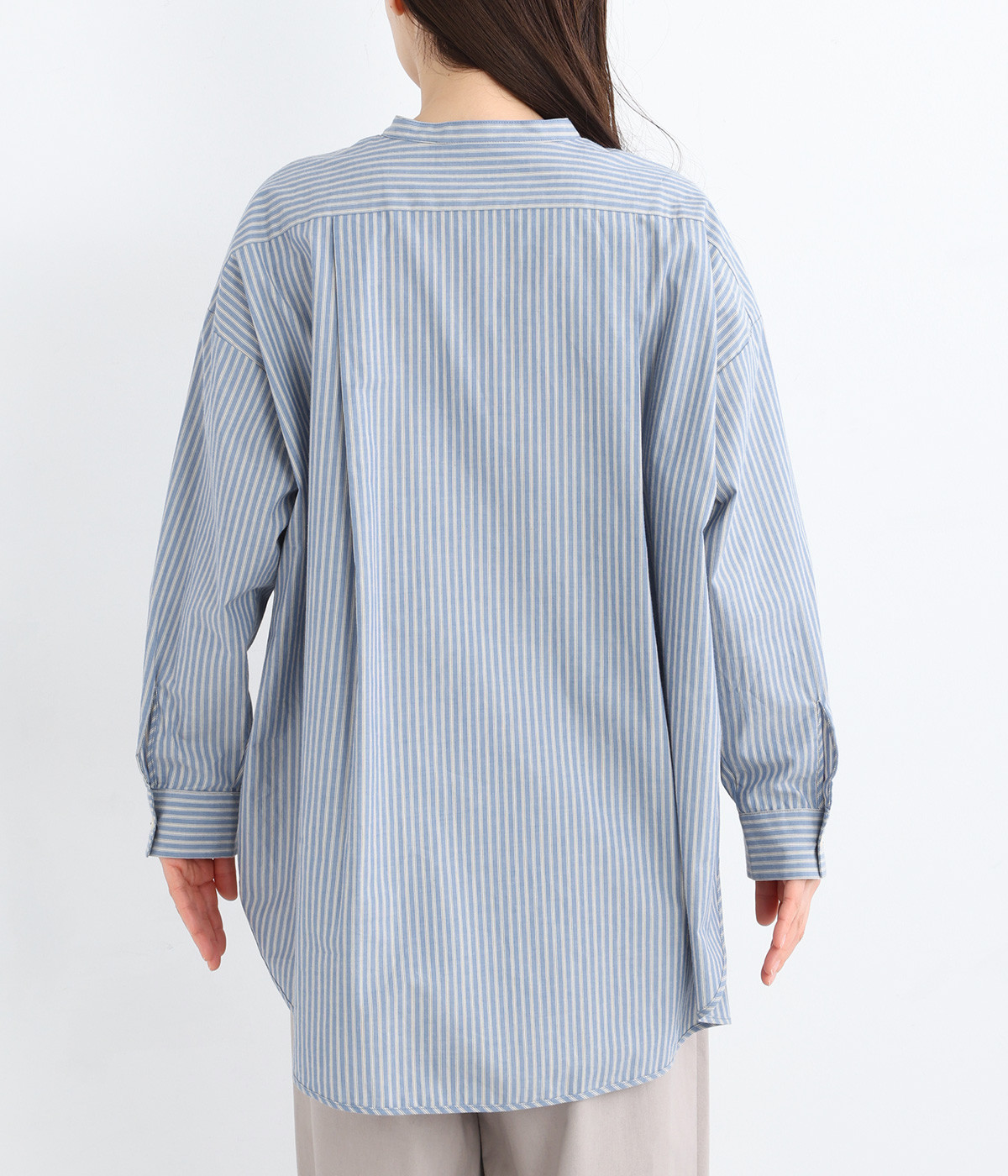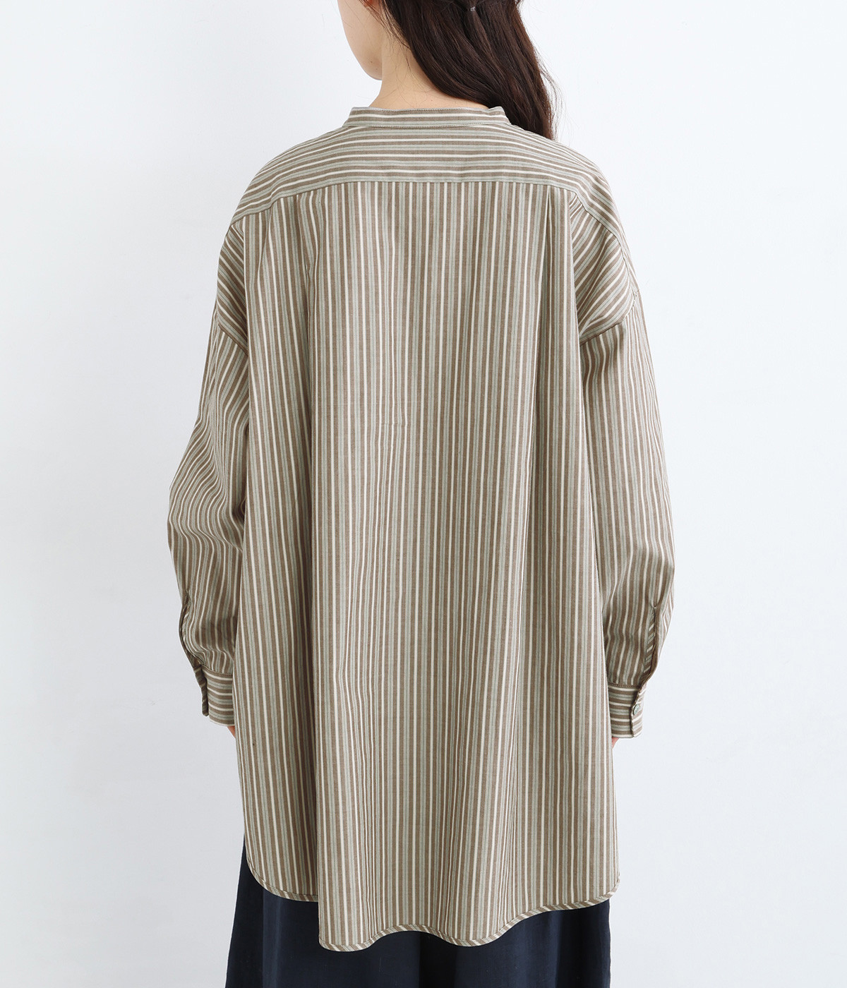 長めの着丈に深くサイドスリットが入っていて、体のラインを拾わないビッグシルエットながらもすっきりとした印象に。デザイン性の高いストライプ柄がコーディネートに清潔感をプラスします。シンプルなインナーに羽織るスタイリングも◎。