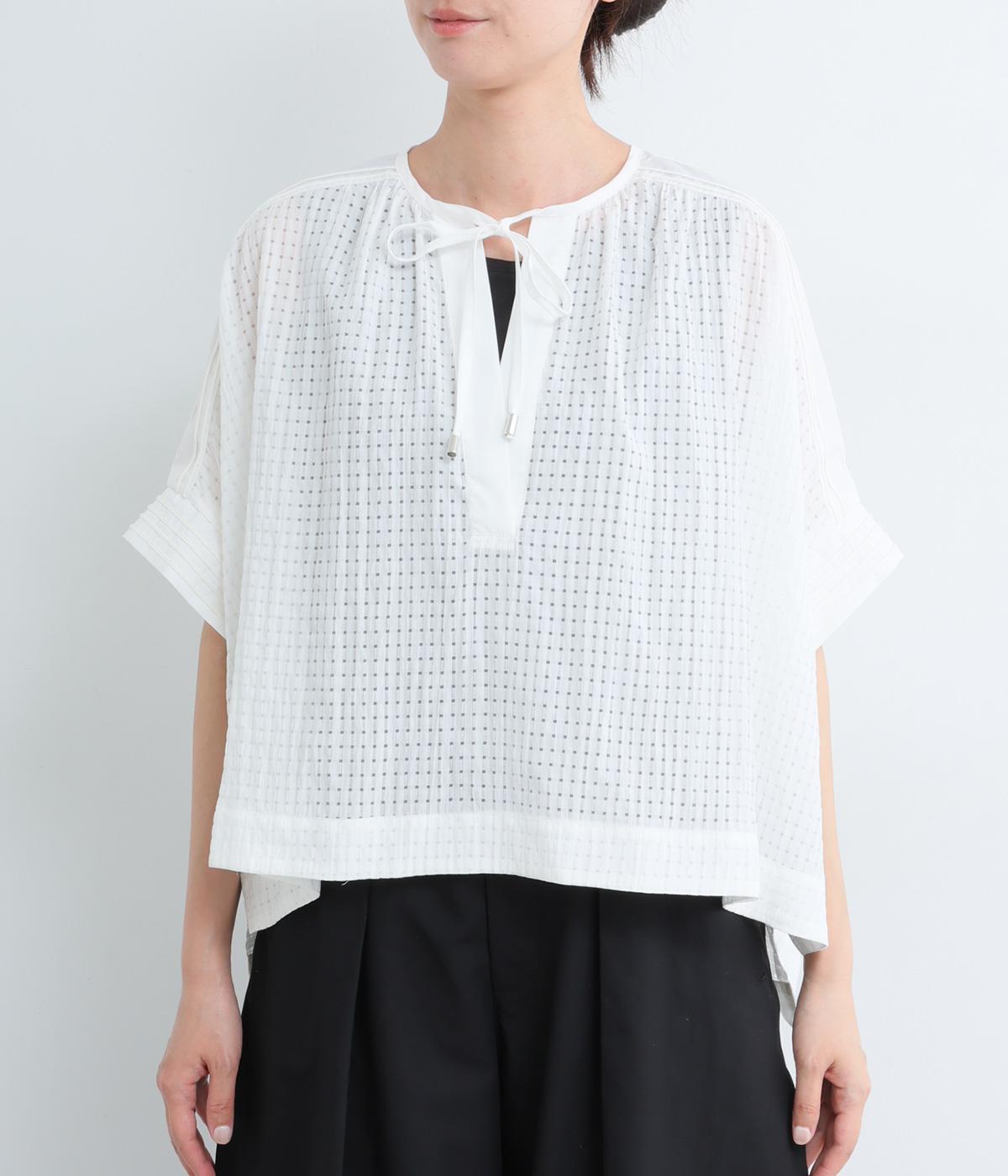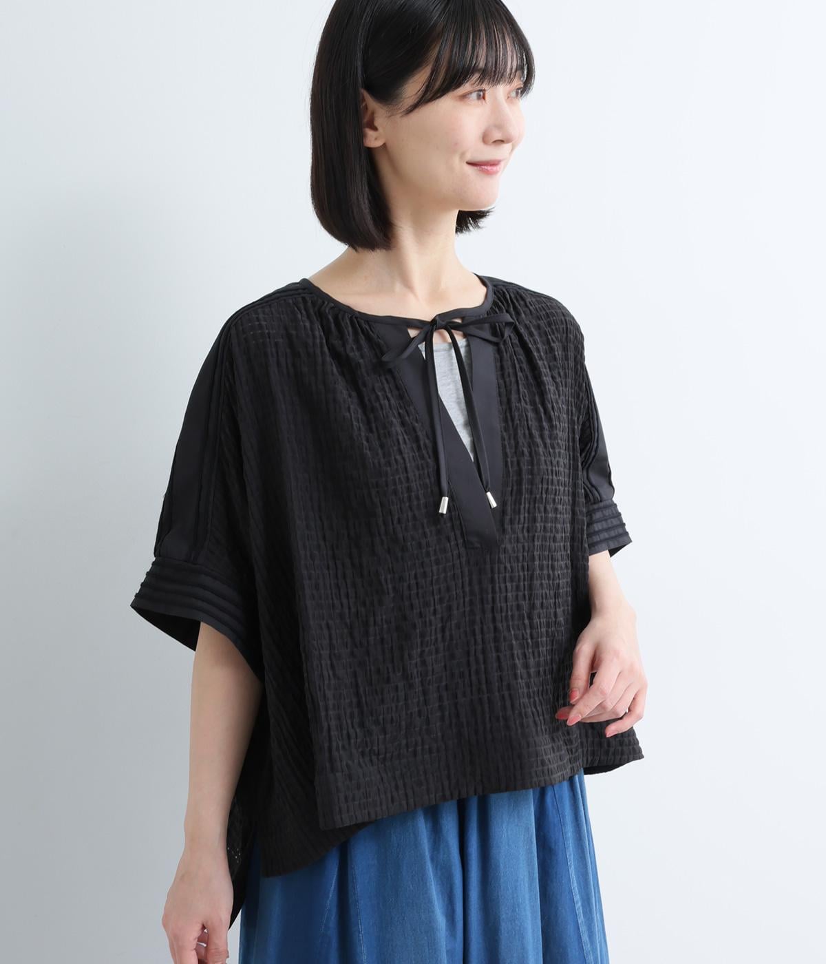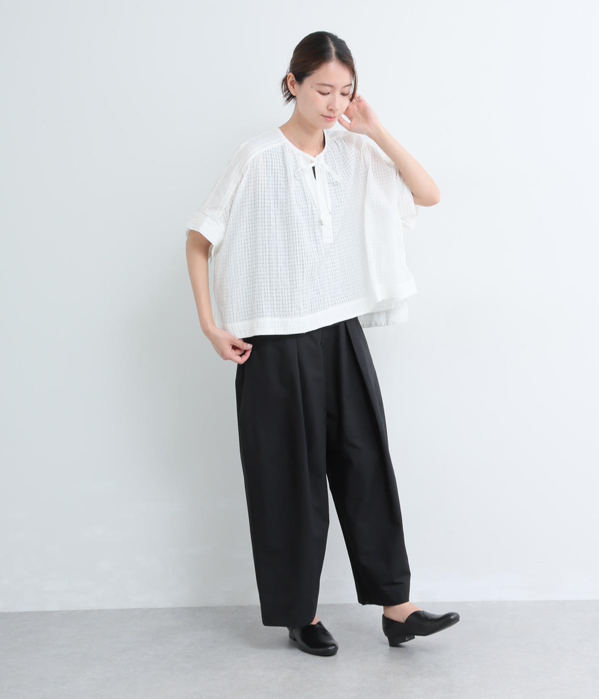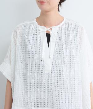 レイヤードスタイルを軽やかに仕上げ、スタイリングに奥行きを与えるシアーチェックブラウスの登場。キーネックの抜け感とリボンの華やかさがバランスよく、布帛切り替えできちんと感をプラス。前後差のある裾が自然に揺れ、動きのあるシルエットに。
