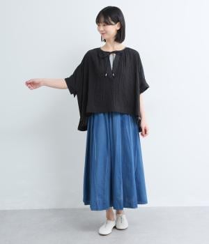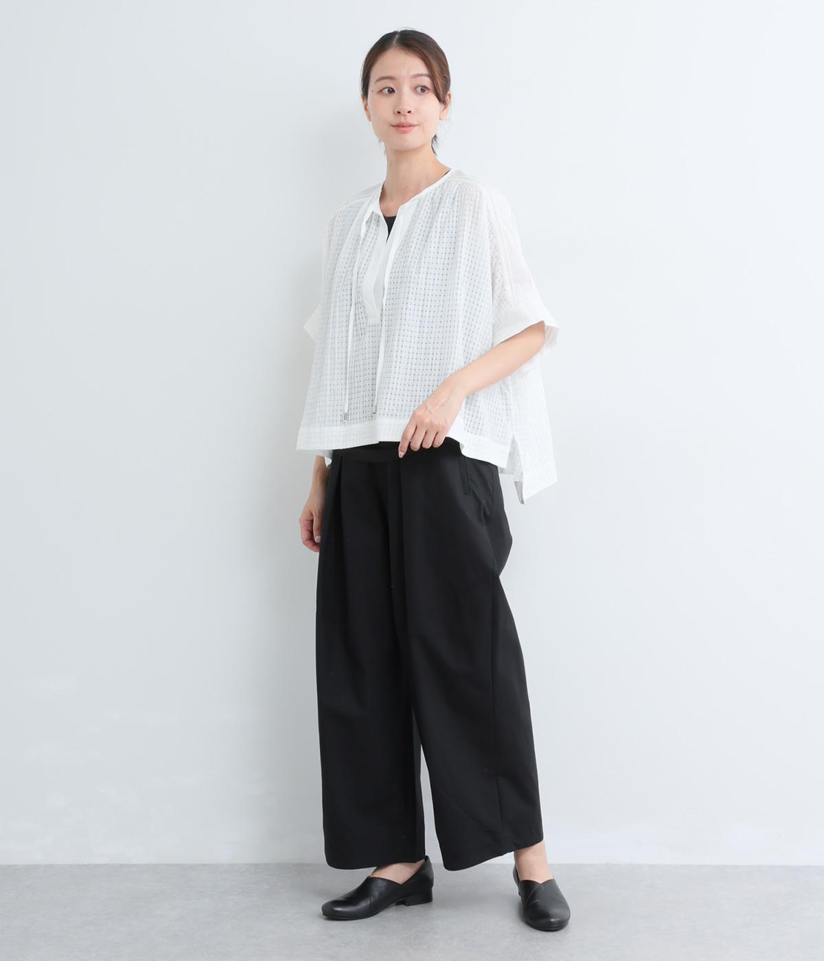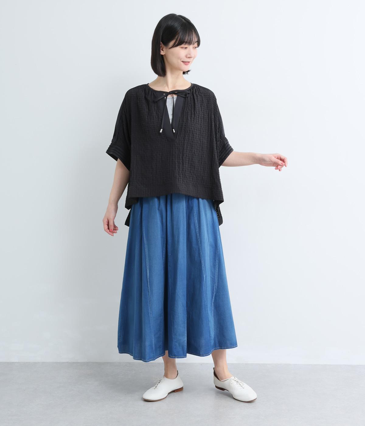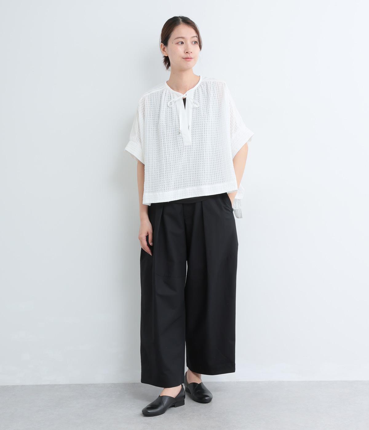 レイヤードスタイルを軽やかに仕上げ、スタイリングに奥行きを与えるシアーチェックブラウスの登場。キーネックの抜け感とリボンの華やかさがバランスよく、布帛切り替えできちんと感をプラス。前後差のある裾が自然に揺れ、動きのあるシルエットに。