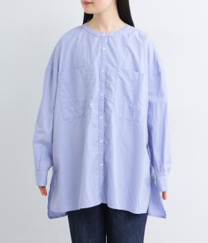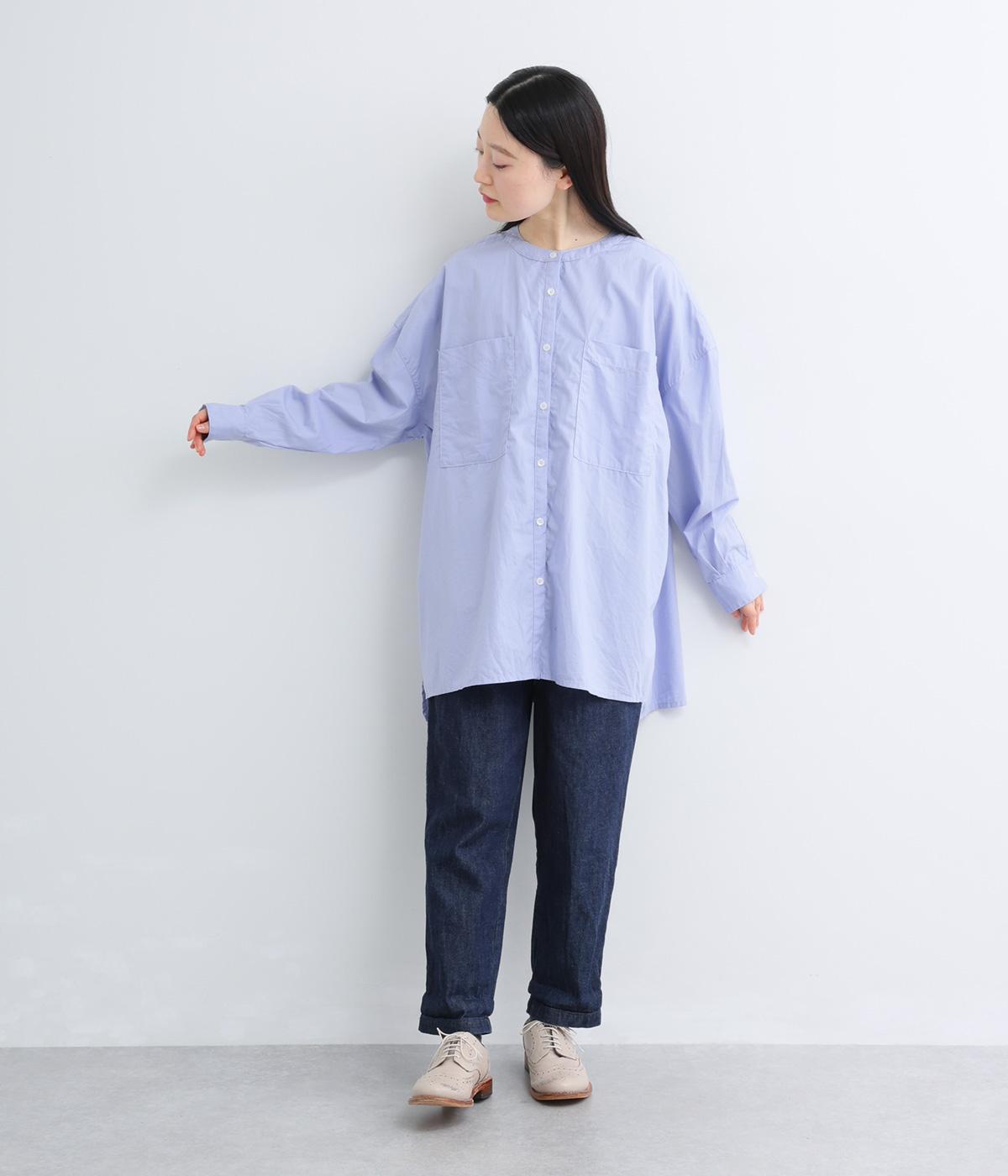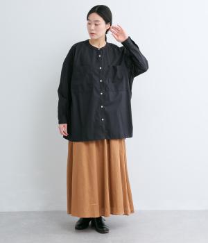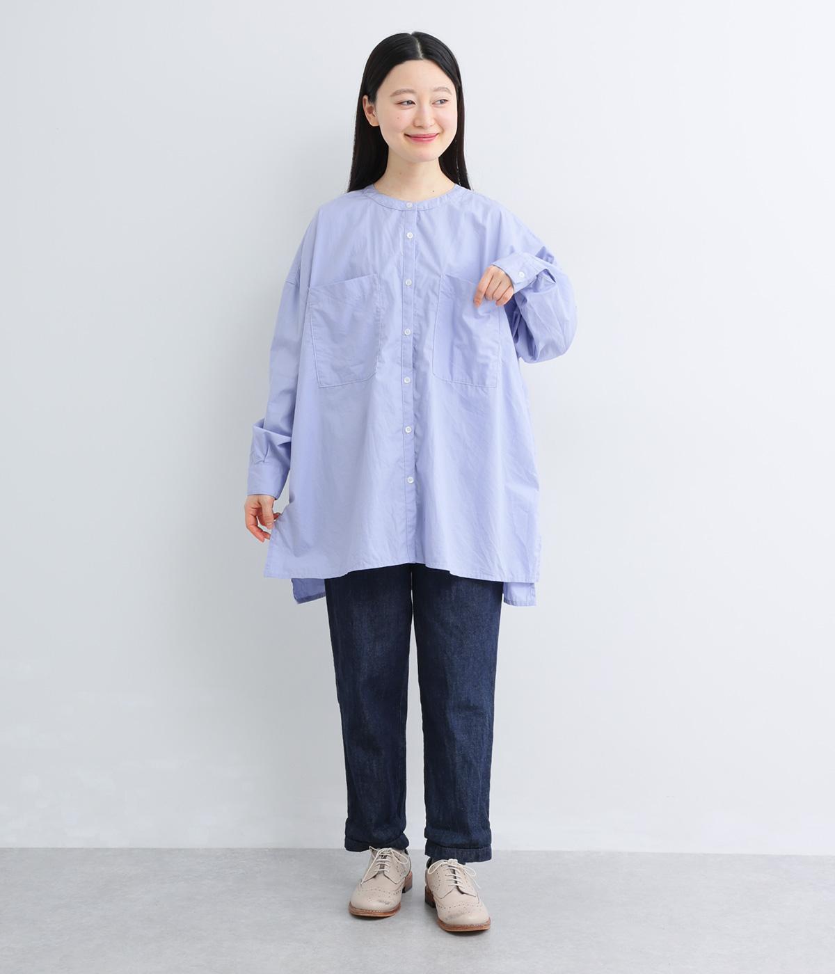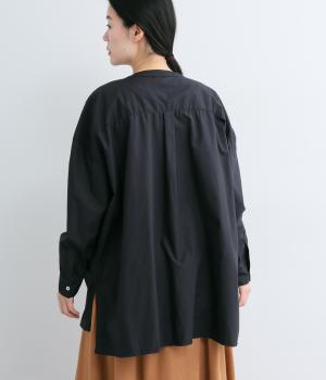 前面に配した大きなポケットがアクセントを添えています。腰まわりをカバーするゆったりとしたシルエットで、リラックス感のある着心地です。首元はバンドカラーですっきりとバランスよく仕上げました。