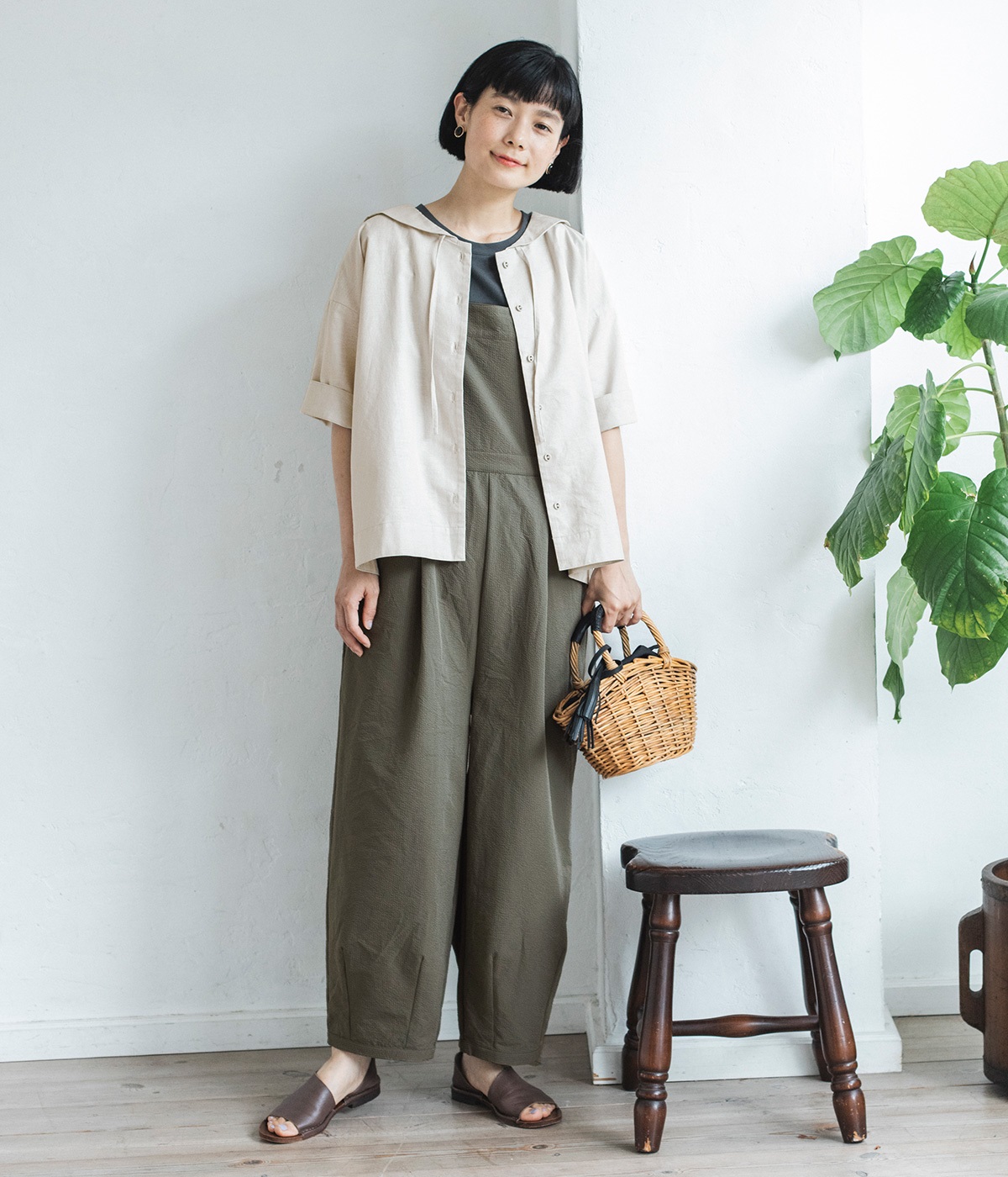 ニュアンスのあるカーキのサロペットに、肌馴染みのいいライトグレーのブラウスを羽織りました。飾らない佇まいでありながら、どこか抜け感のある装いです。