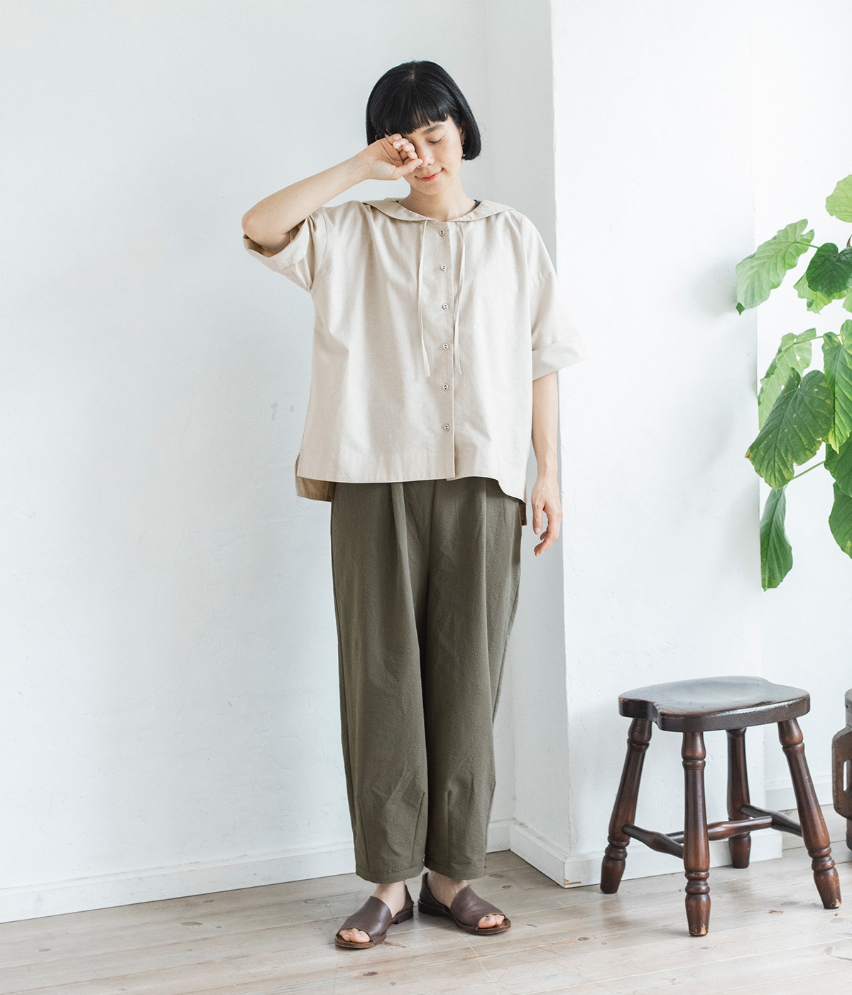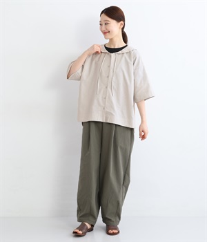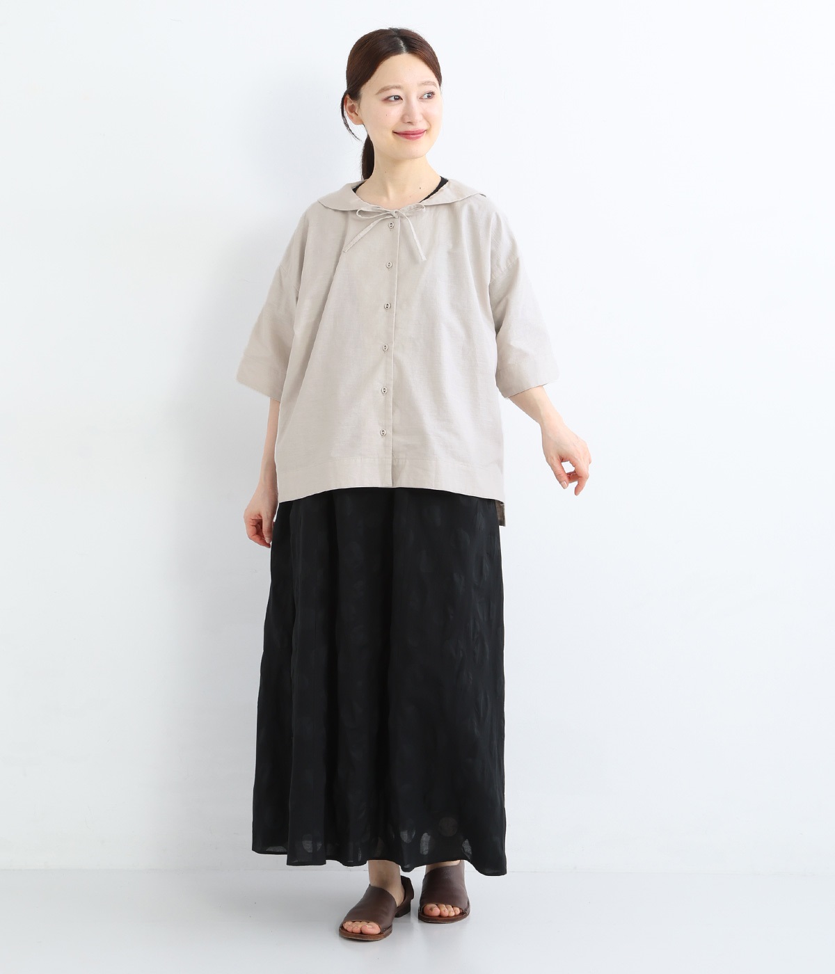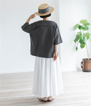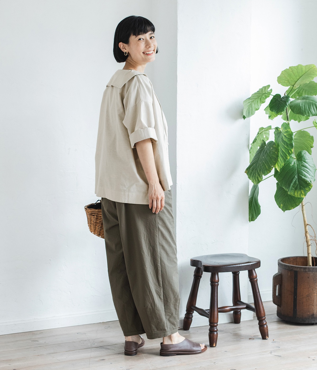 コットンリネンの豊かな風合いが引き立つブラウス。濃色でも、どこかやわらかさのあるコーディネートに仕上がります。
