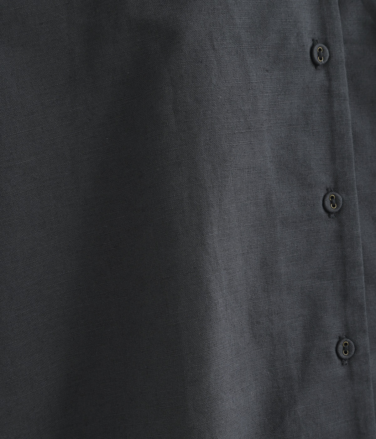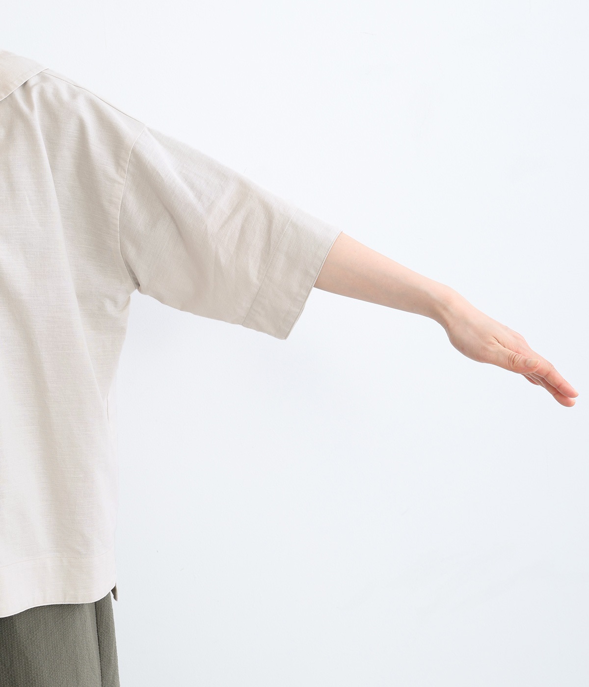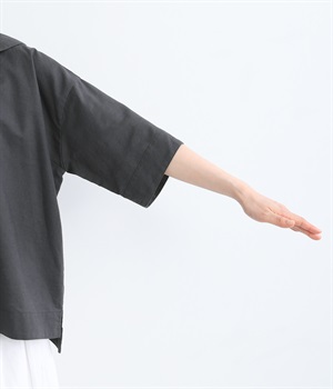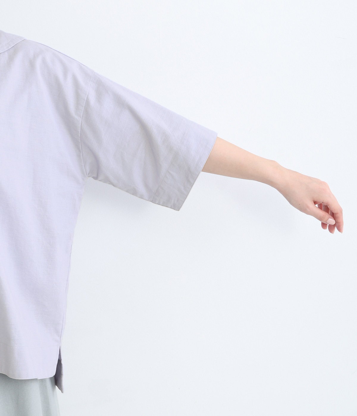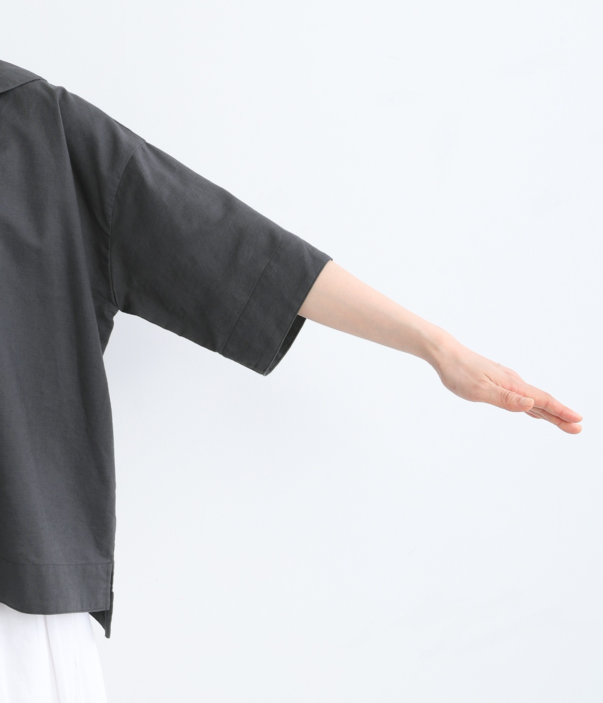 ほどよいハリ感とやわらかさのある、コットン多めの綿麻生地で仕立てています。さらりとした肌触りが心地よい、風合いの良さが引き立つ一着です。<ライトグレー>と<アイスブルー>、<ネイビー>の3色です。