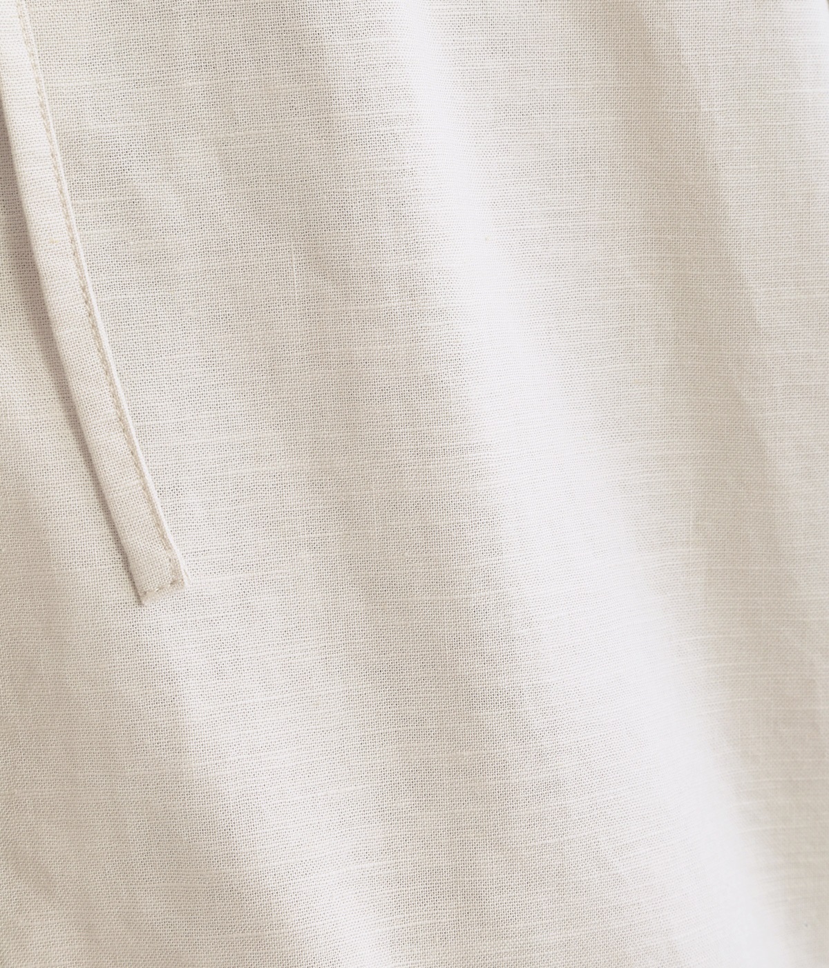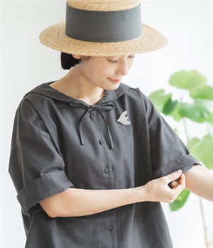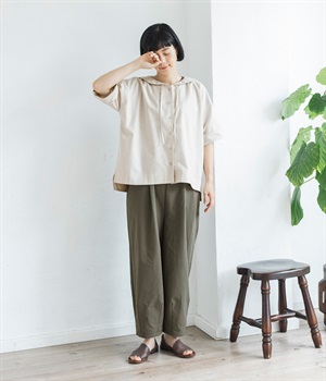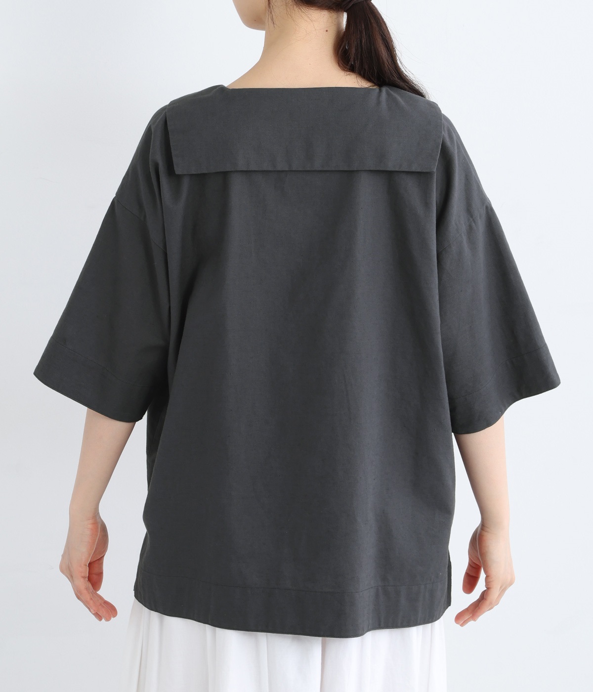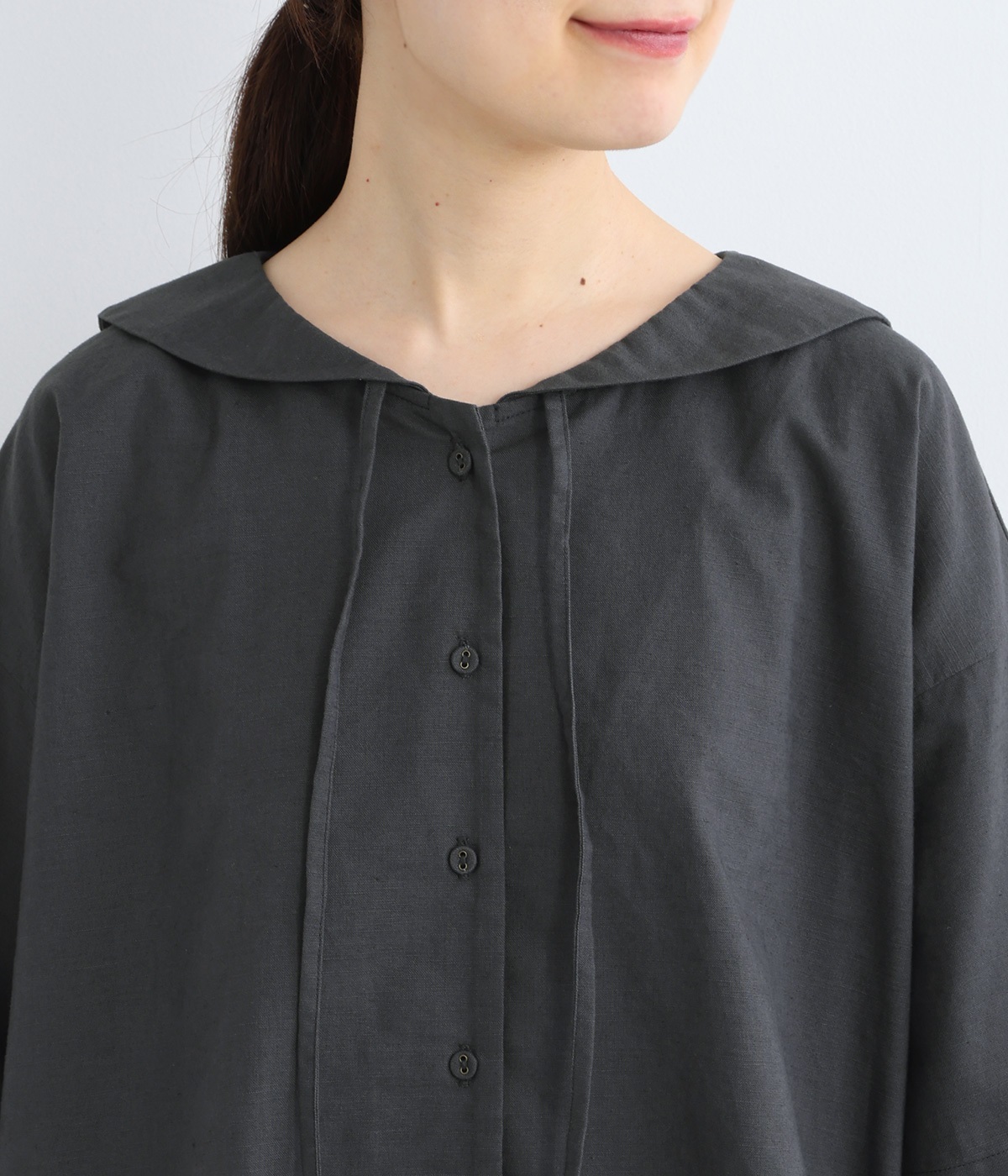 ほどよいハリ感とやわらかさのある、コットン多めの綿麻生地で仕立てています。さらりとした肌触りが心地よい、風合いの良さが引き立つ一着です。<ライトグレー>と<アイスブルー>、<ネイビー>の3色です。