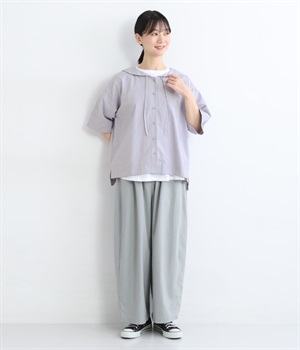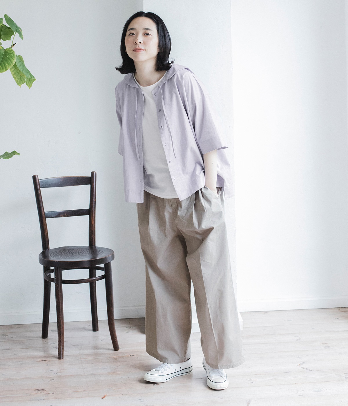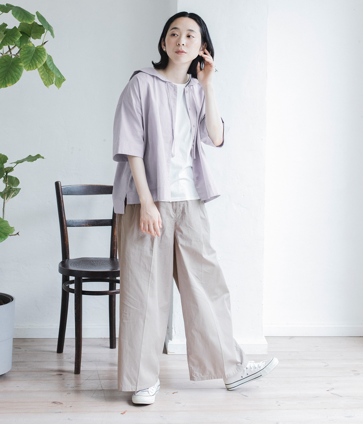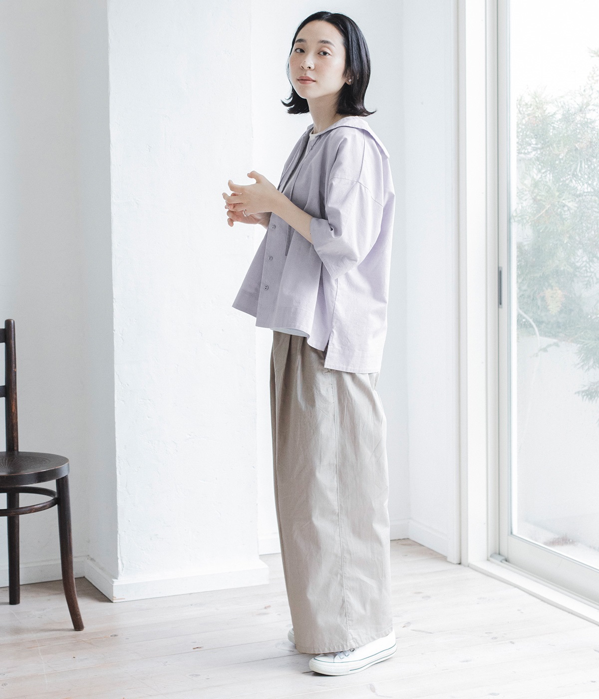 爽やかなアイスブルーのブラウスは、Tシャツとワイドパンツをラフに合わせて、淡いカラーでまとめました。メンズライクなアイテムも、セーラーカラーがひとさじのかわいらしさを添えます。