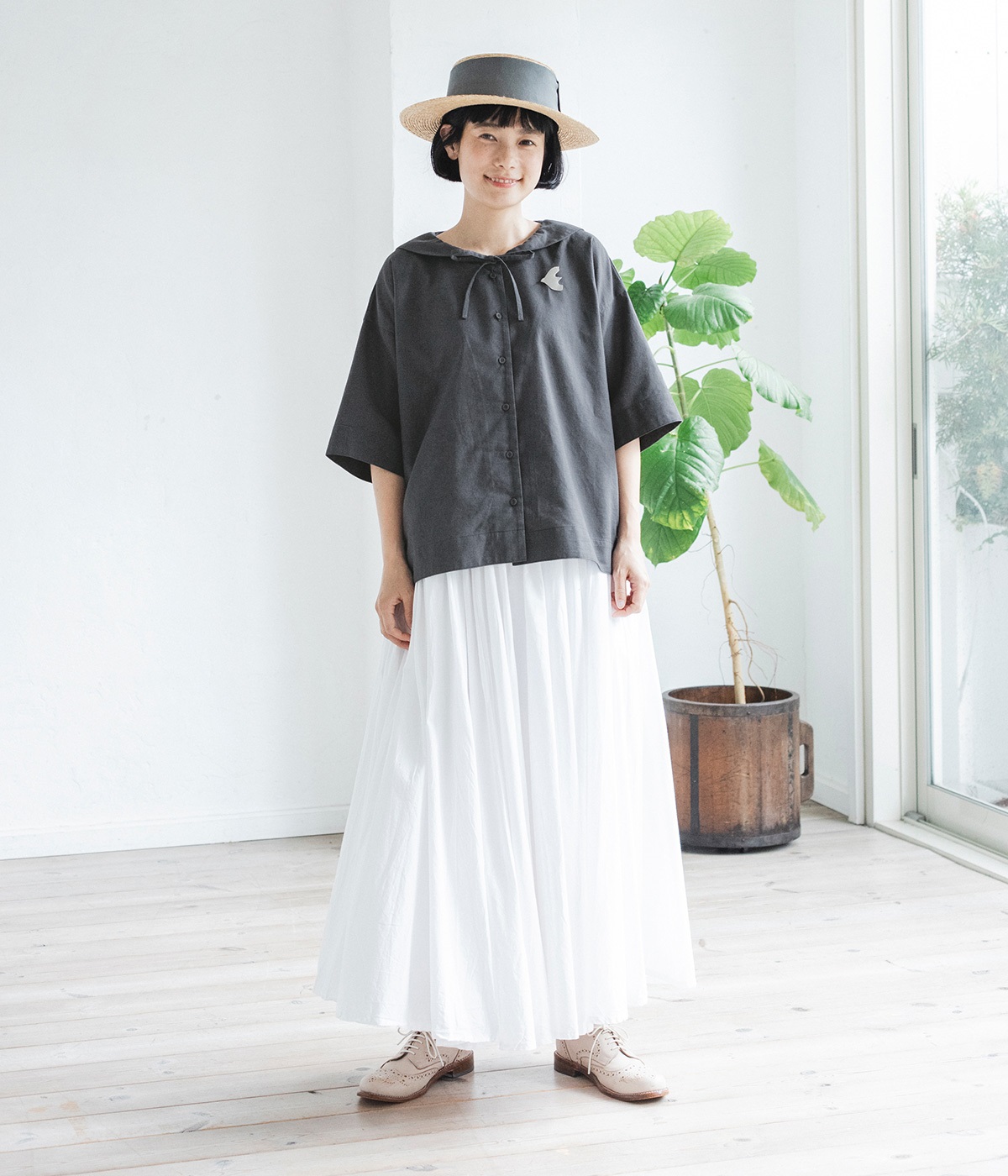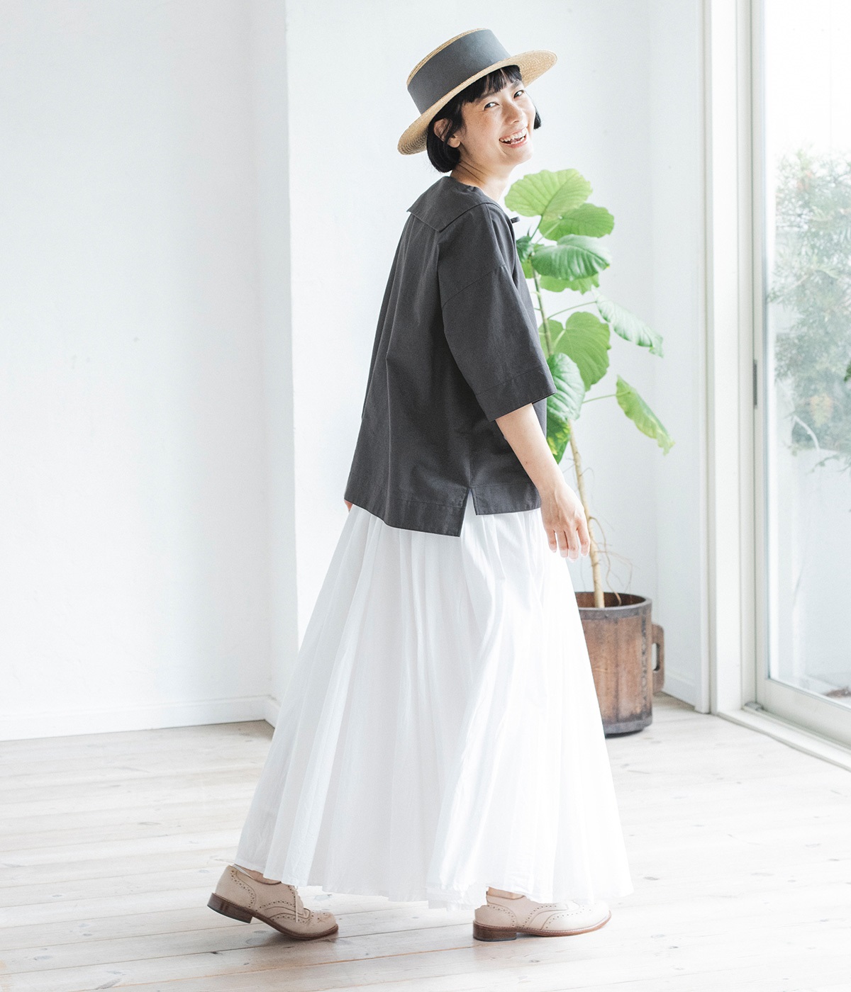 深みのあるネイビーは、軽やかに白いスカートと合わせました。帽子とレザーシューズを加えることで、よりやわらかな品のある装いに。