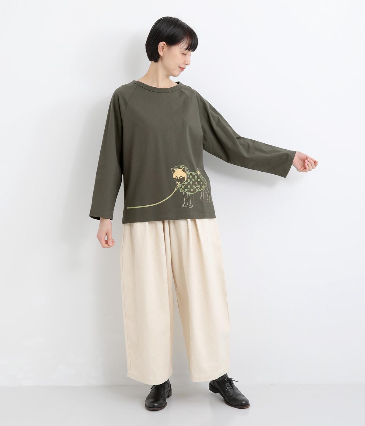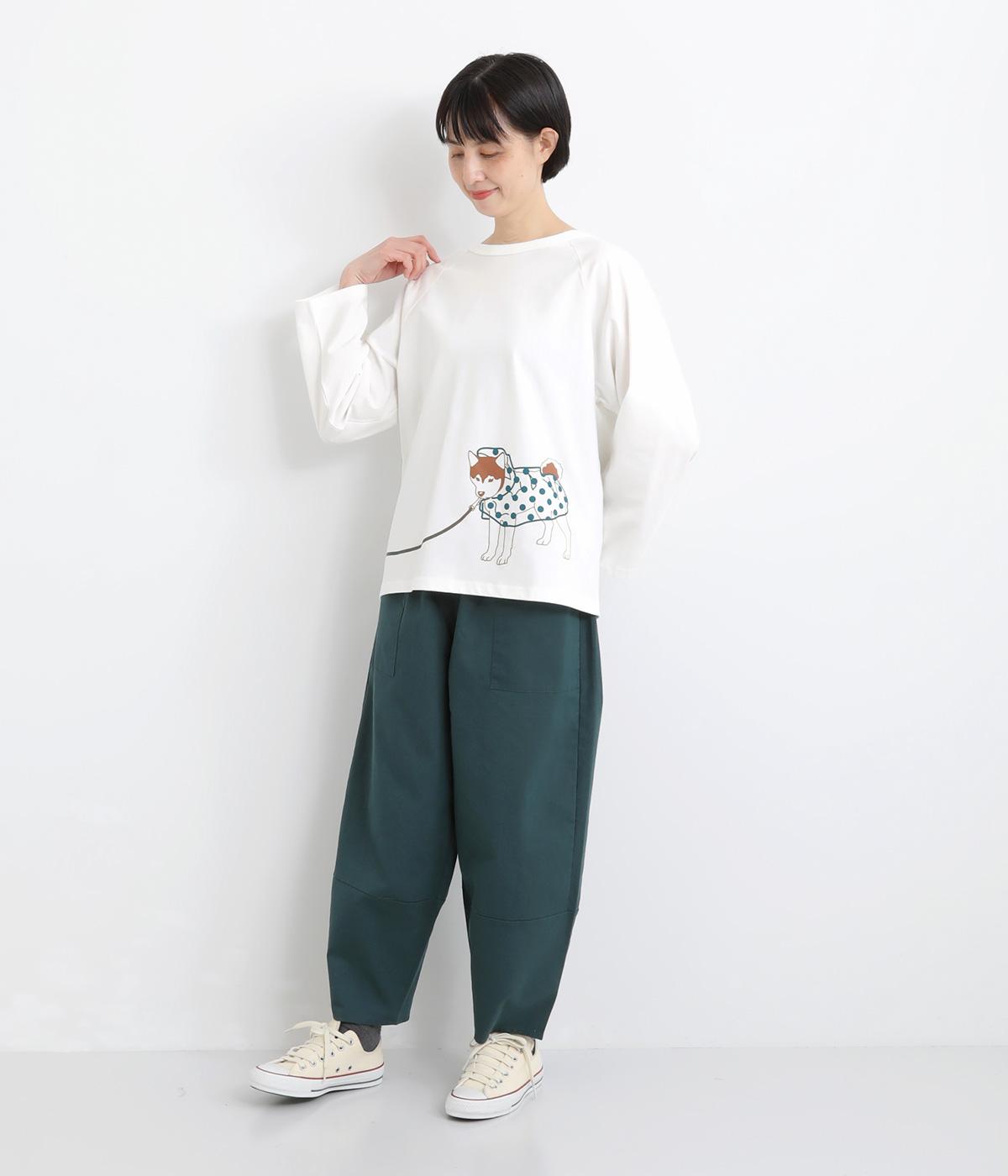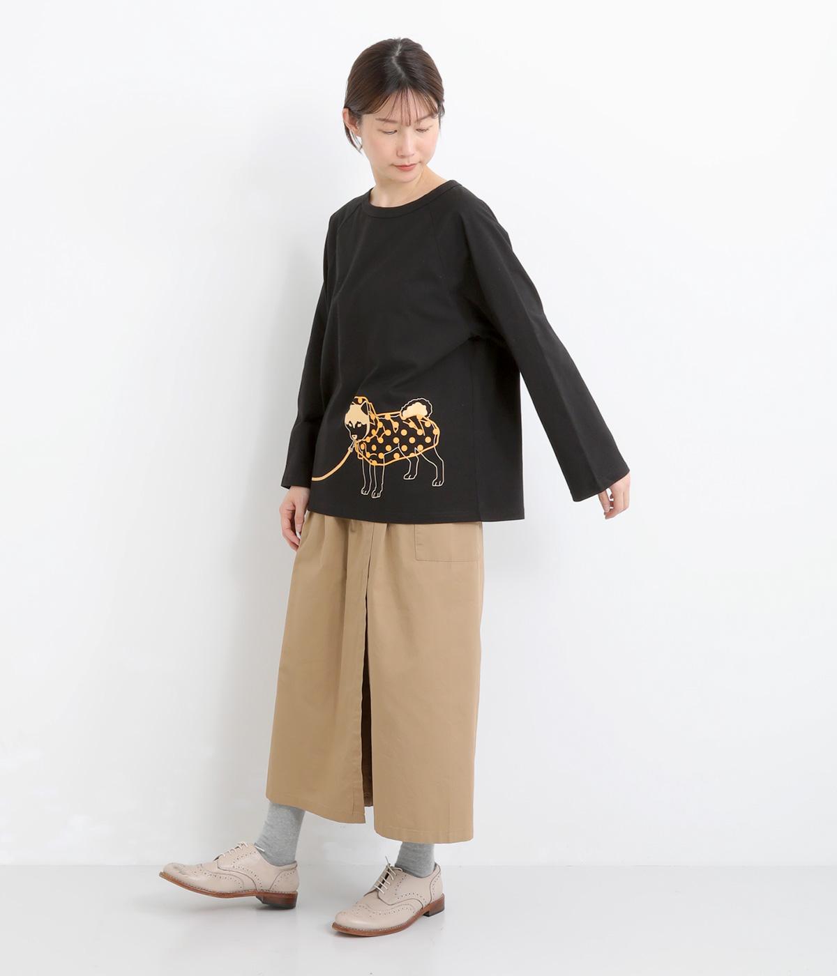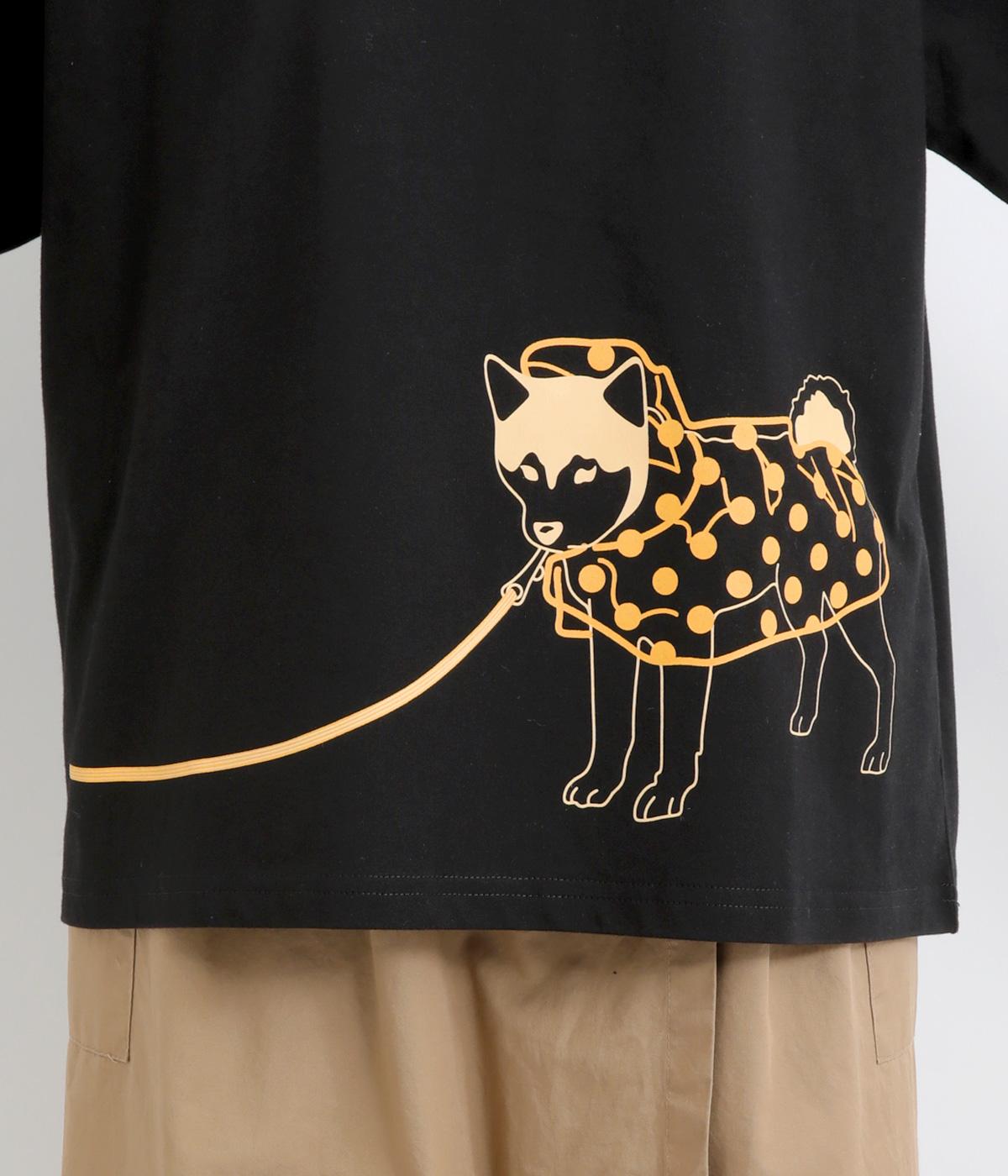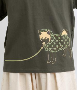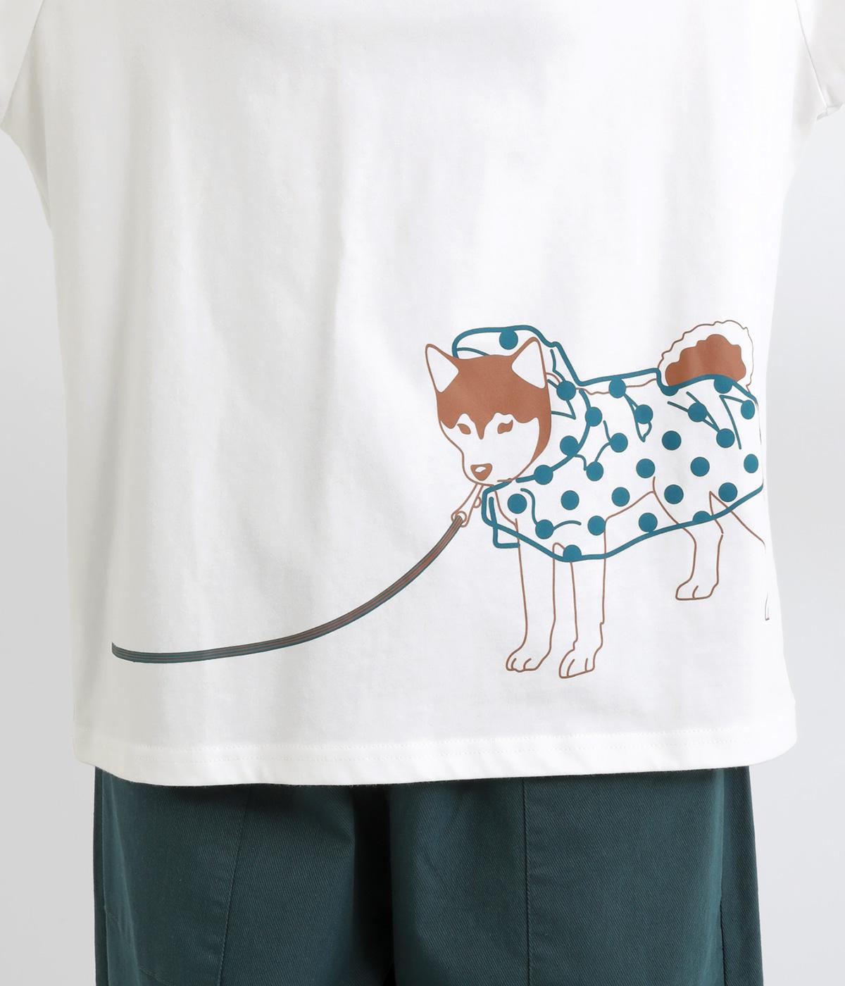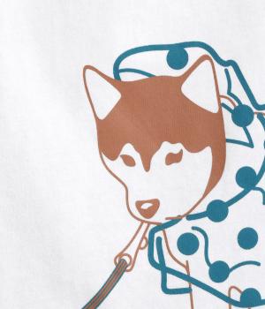 ドット柄の雨具を着た犬のプリントが存在感を放つトップスです。ほどよいサイズ感でボトムスを選びません。お出かけにも、お家でのリラックスタイムにも寄り添う一枚です。