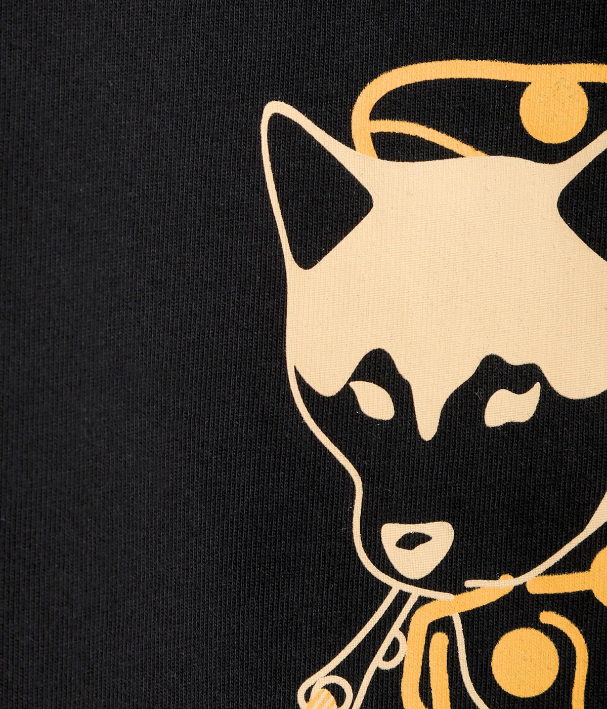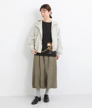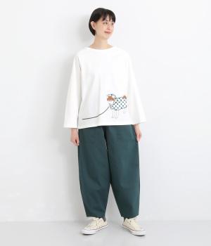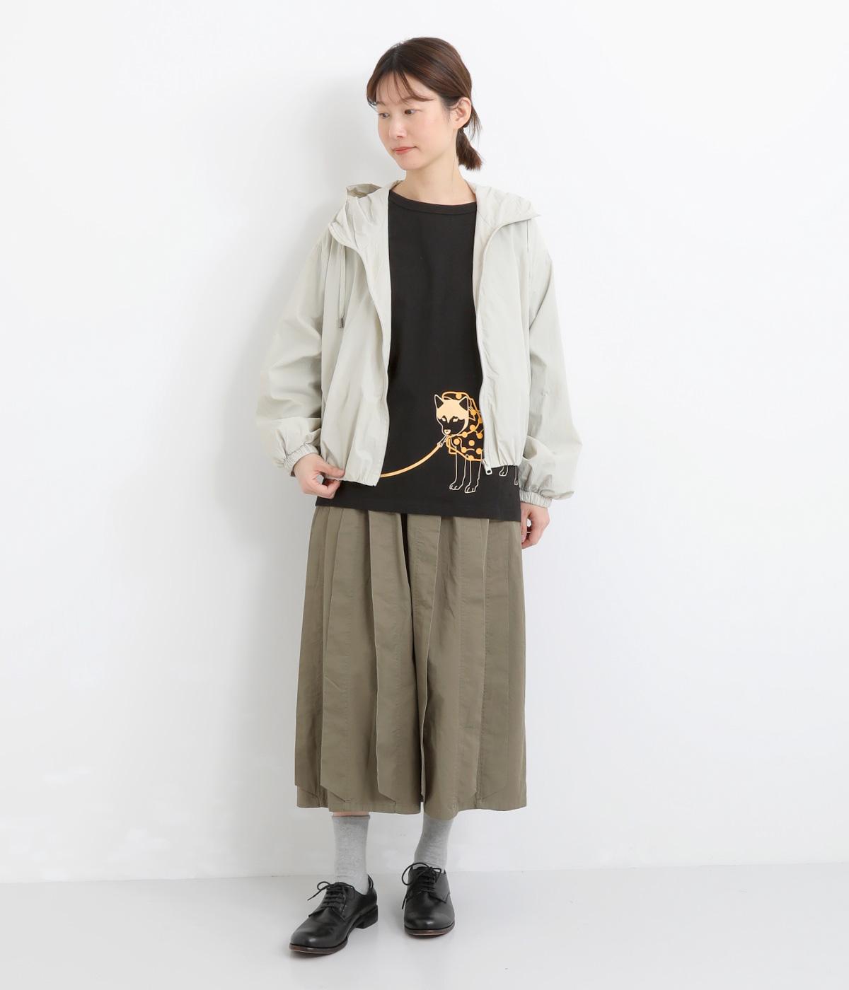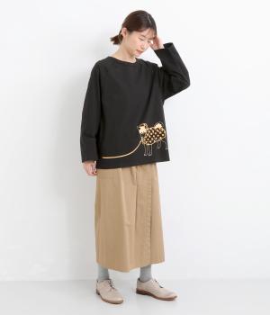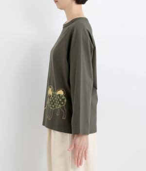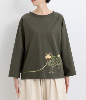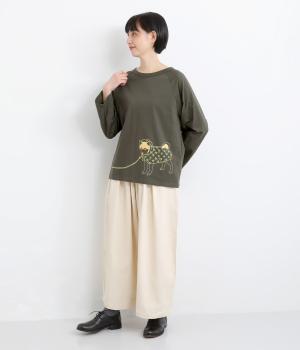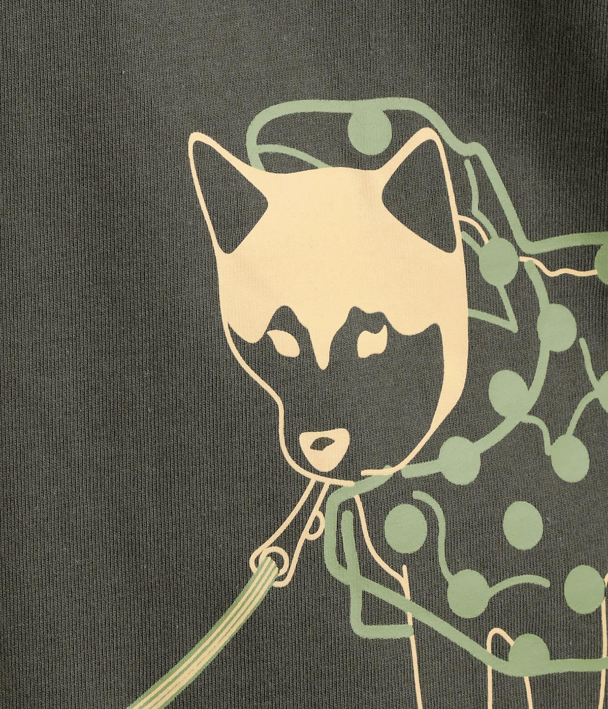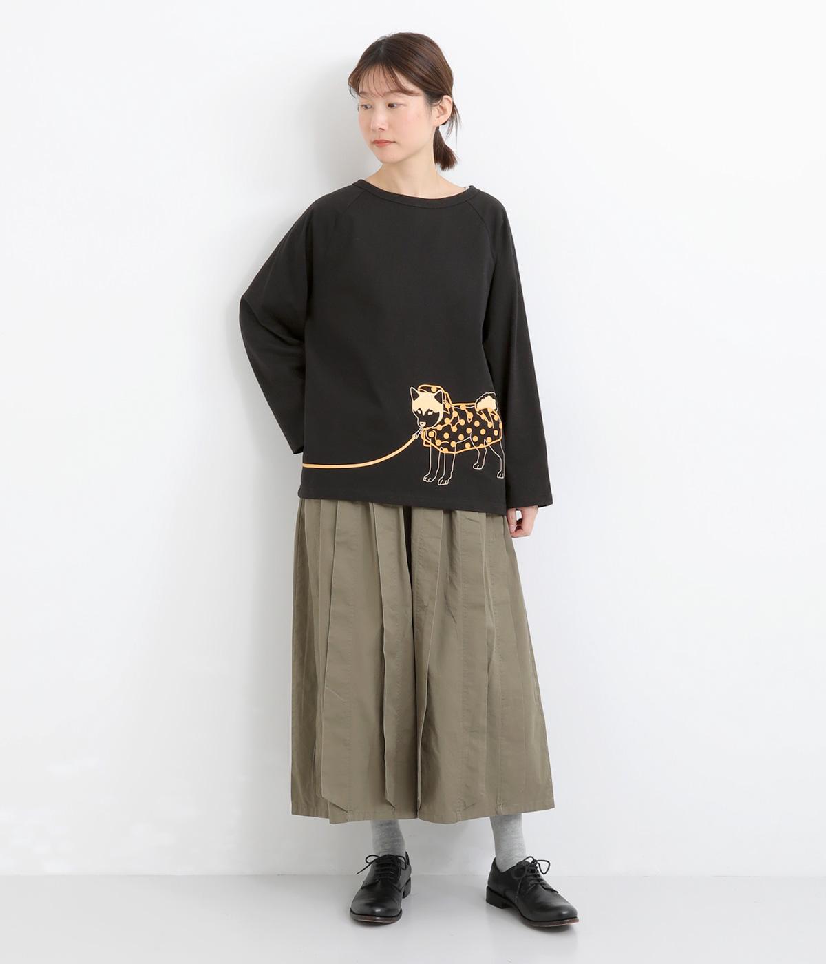 ドット柄の雨具を着た犬のプリントが存在感を放つトップスです。ほどよいサイズ感でボトムスを選びません。お出かけにも、お家でのリラックスタイムにも寄り添う一枚です。