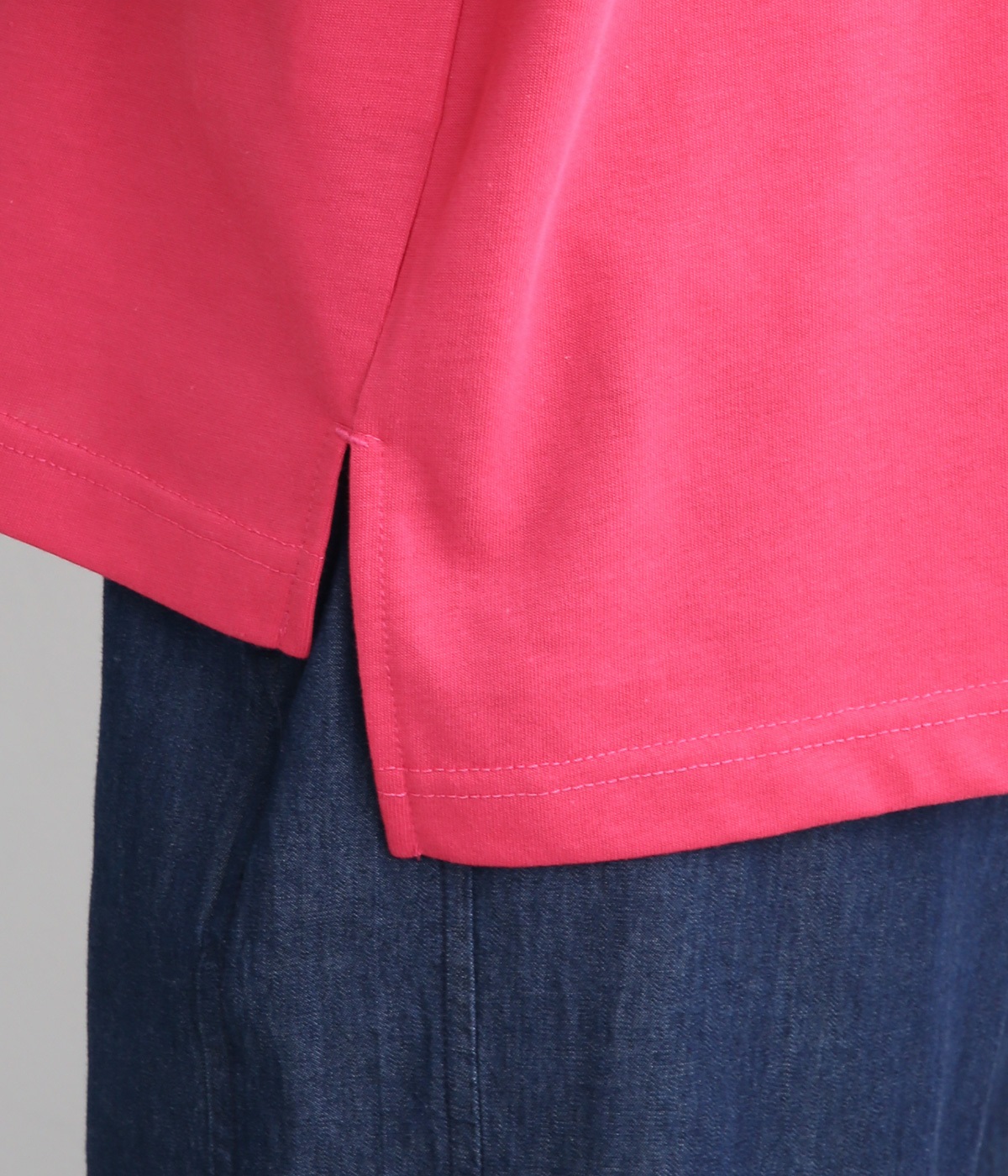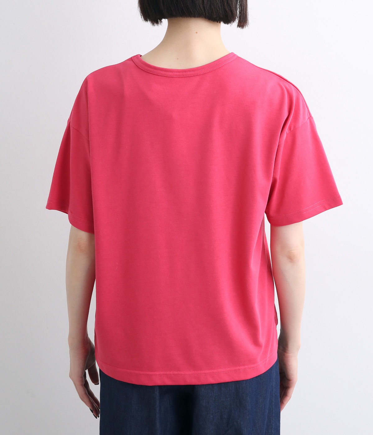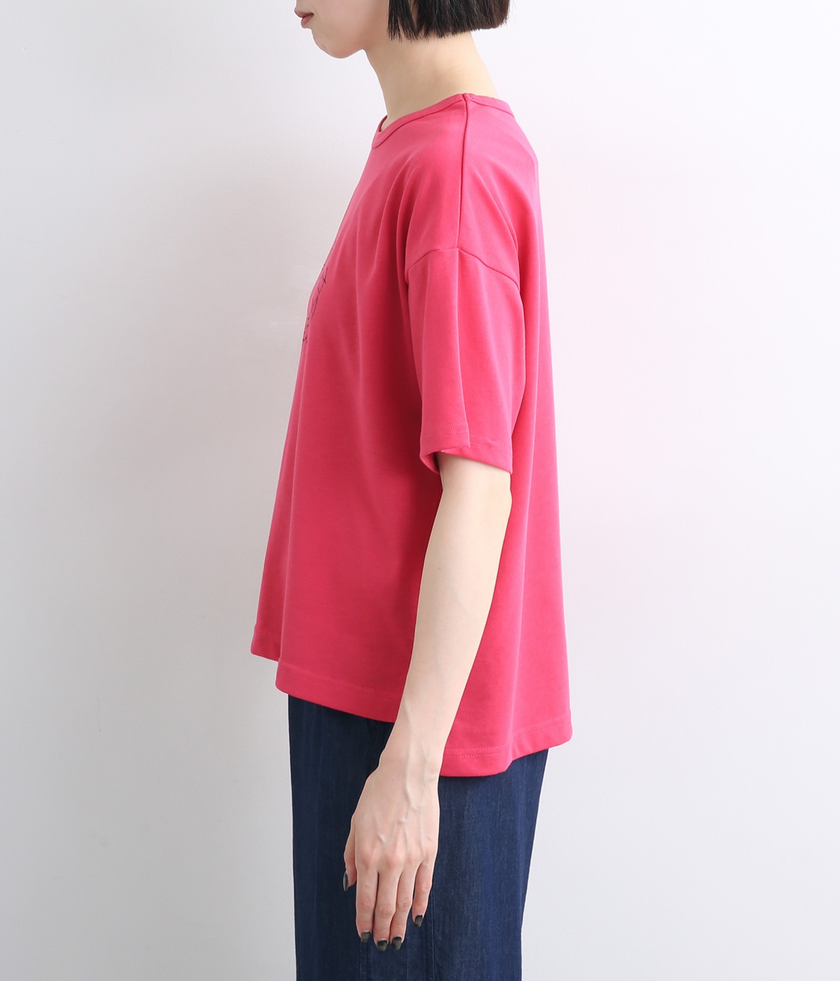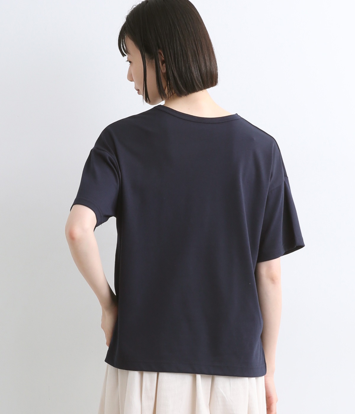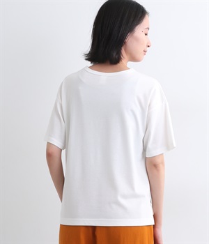 なめらかでやわらかな肌触りが着心地の良さを約束するコットン混紡の天竺生地を使用しています。薄めの中厚手生地でラフに着こなしやすい生地感です。