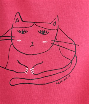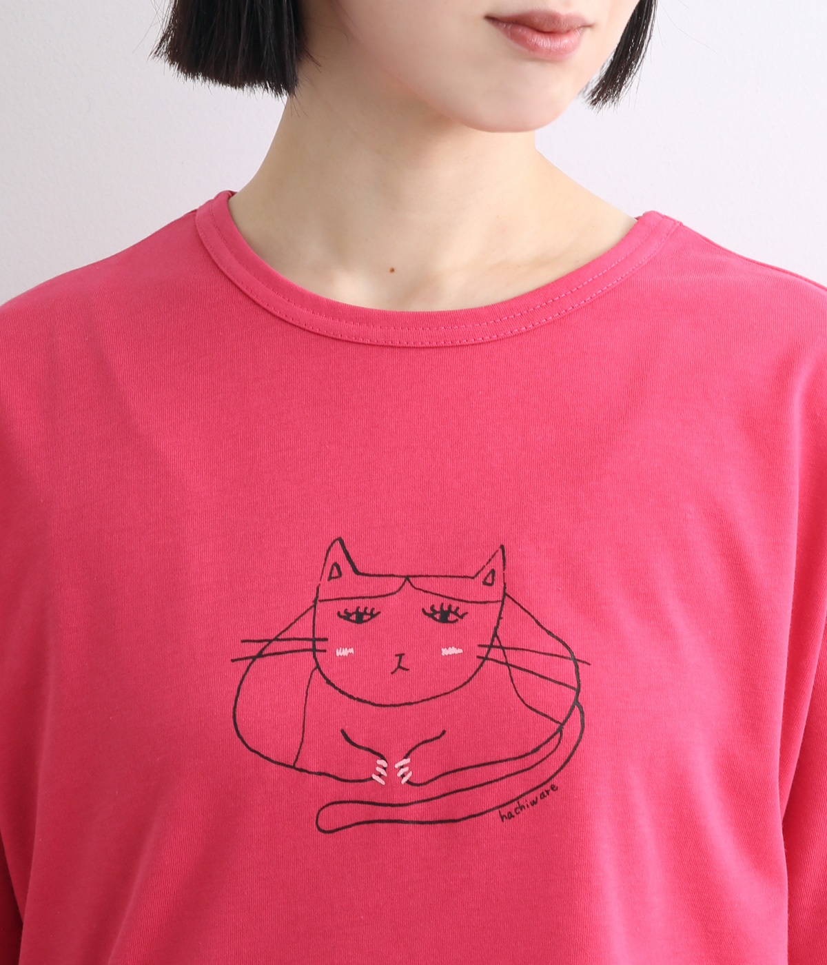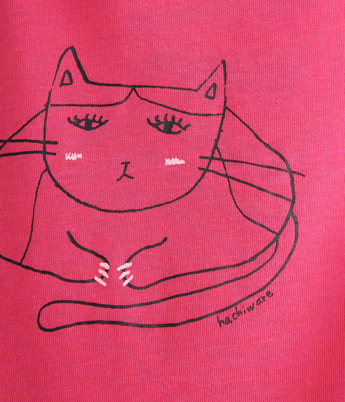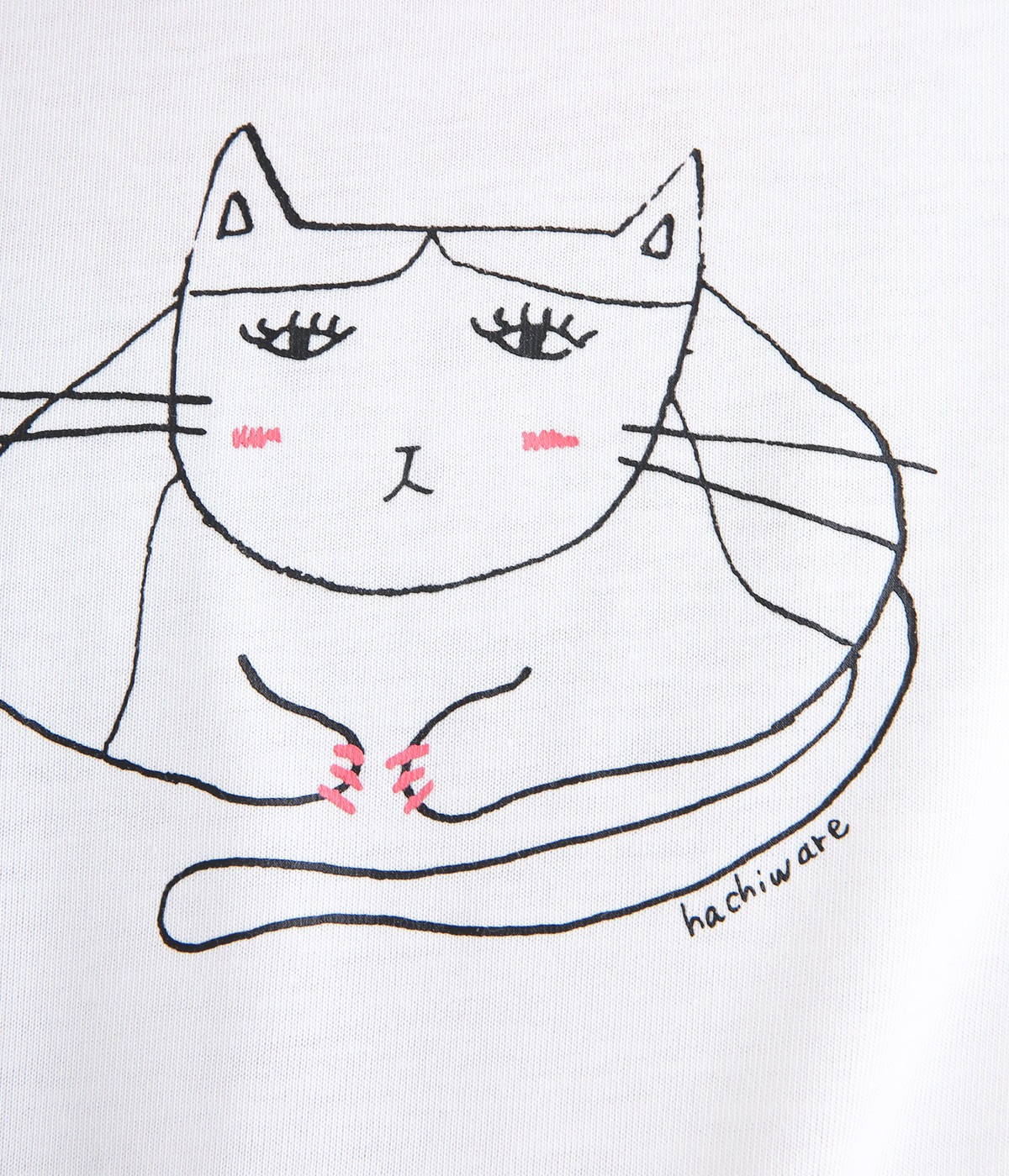 ゆるいタッチで描かれたハチワレ猫のプリントがなんとも可愛らしいTシャツです。ベースはシンプルなボックスシルエットに仕立てているのでボトム合わせも困りません。サイドスリットを入れて適度に抜け感をつくっています。