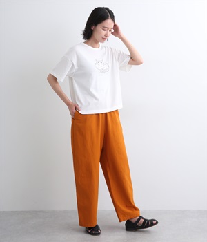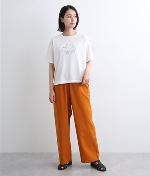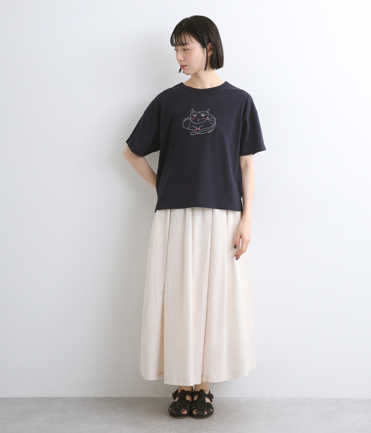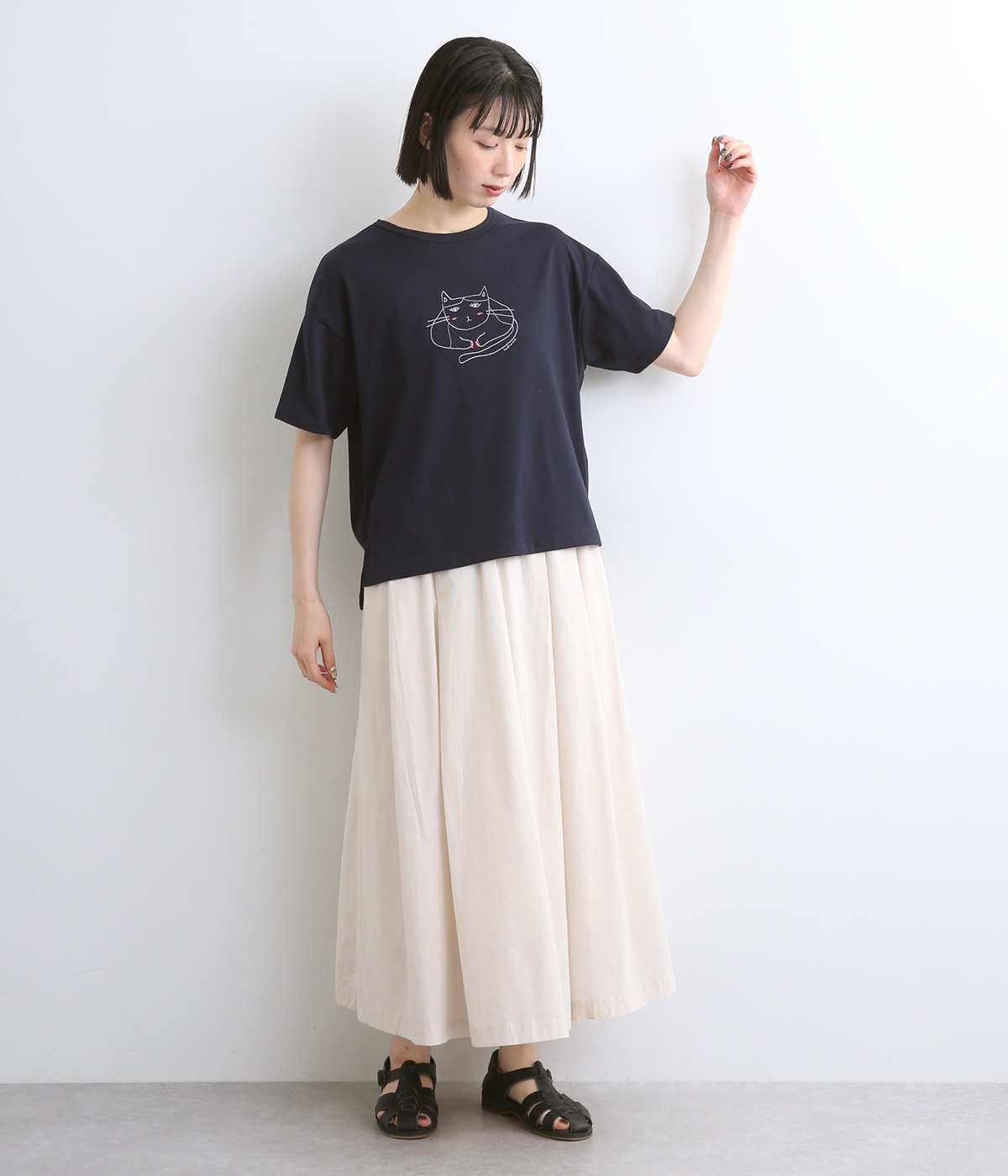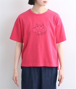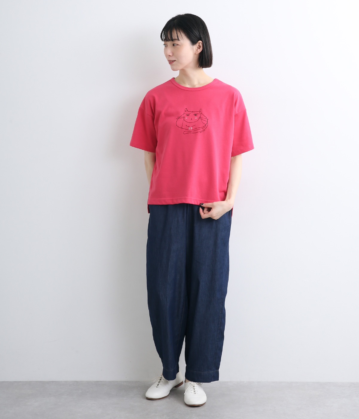 ゆるいタッチで描かれたハチワレ猫のプリントがなんとも可愛らしいTシャツです。ベースはシンプルなボックスシルエットに仕立てているのでボトム合わせも困りません。サイドスリットを入れて適度に抜け感をつくっています。