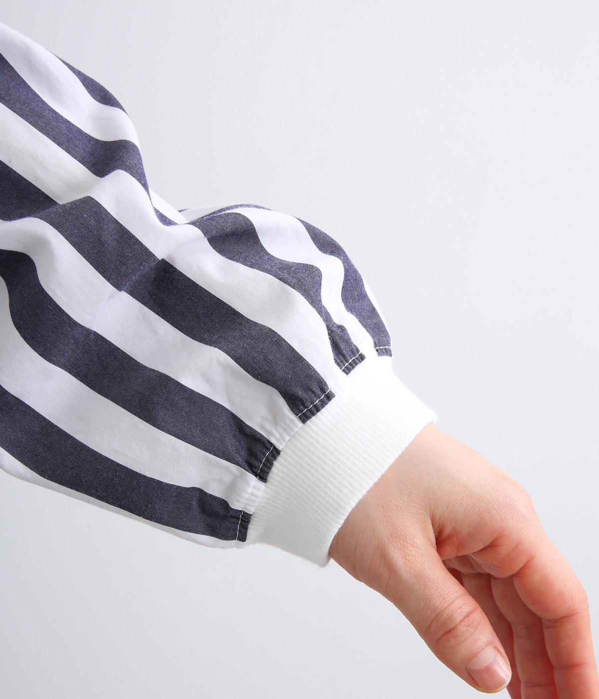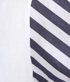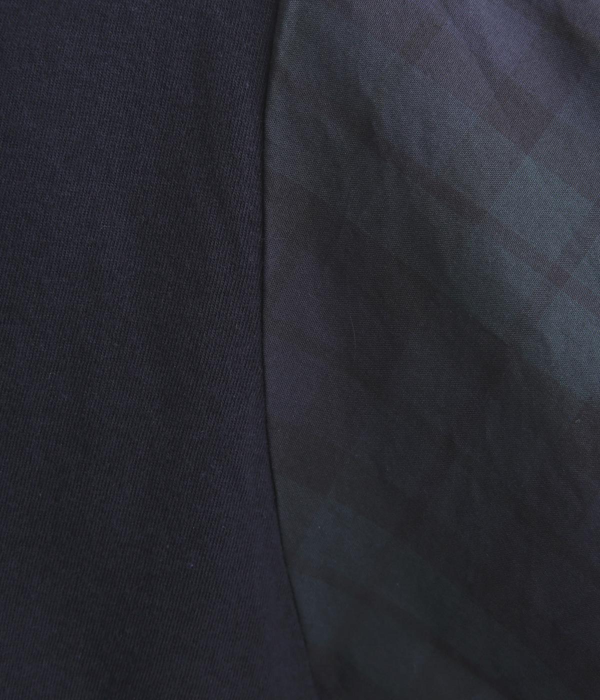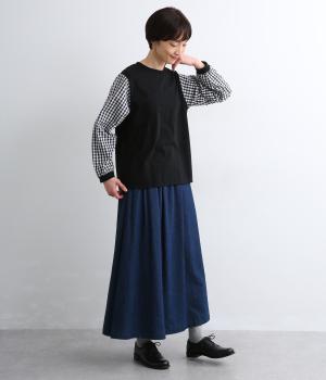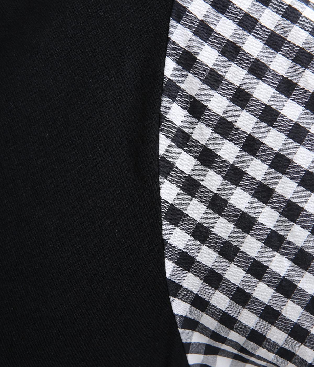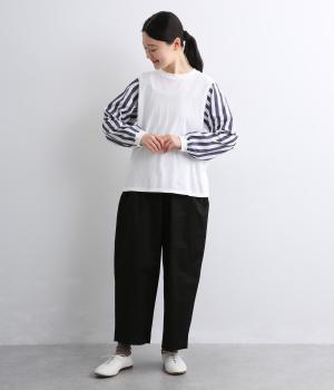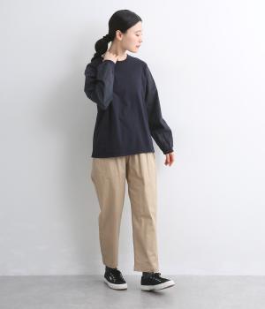 やわらかで伸びのいいカットソー素材とさらりとしてふくらみのある柄生地をドッキング。どちらも肌にやさしいコットン素材で、縫製後の製品洗い加工による風合いの良さも魅力です。