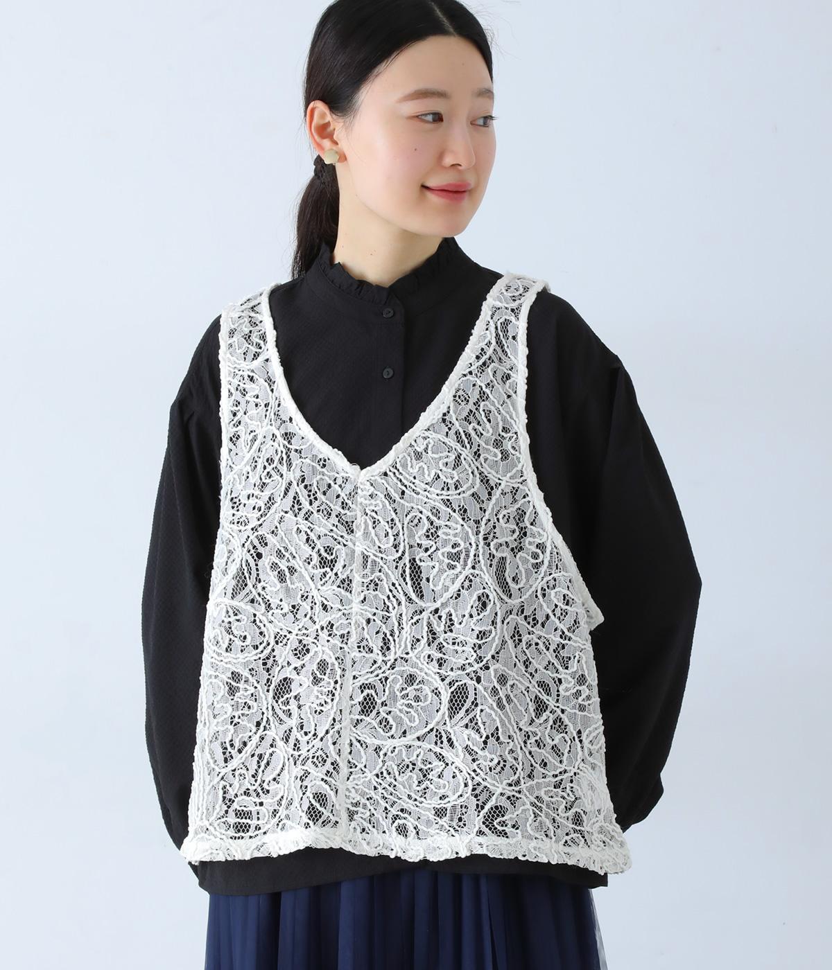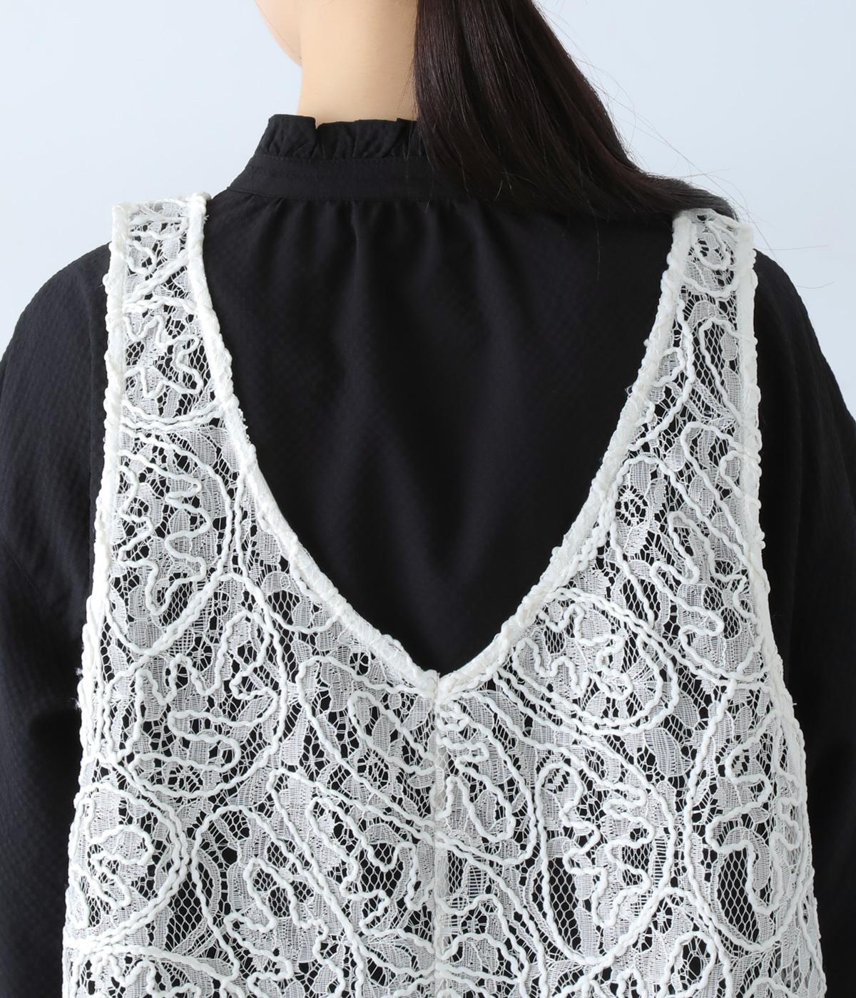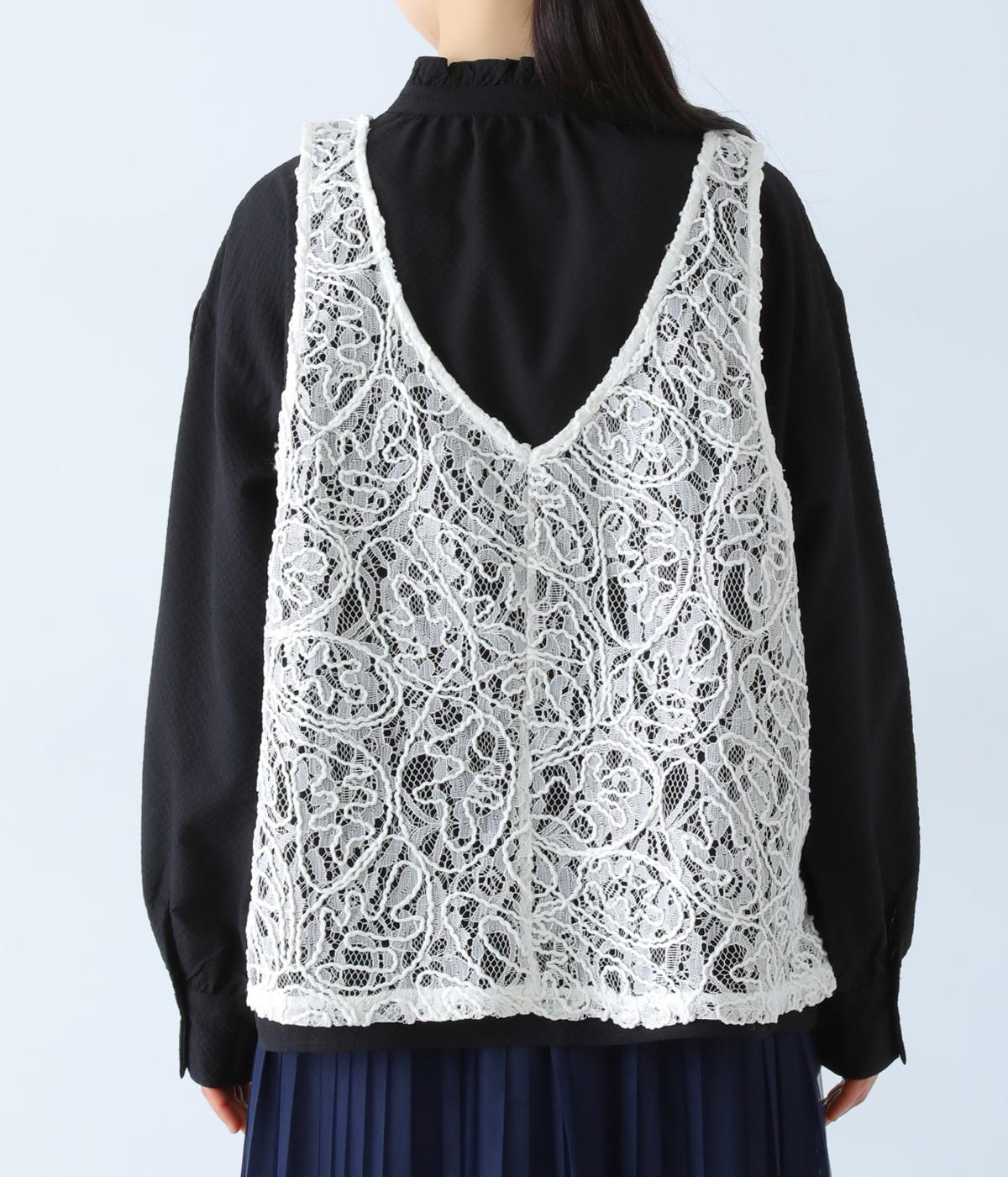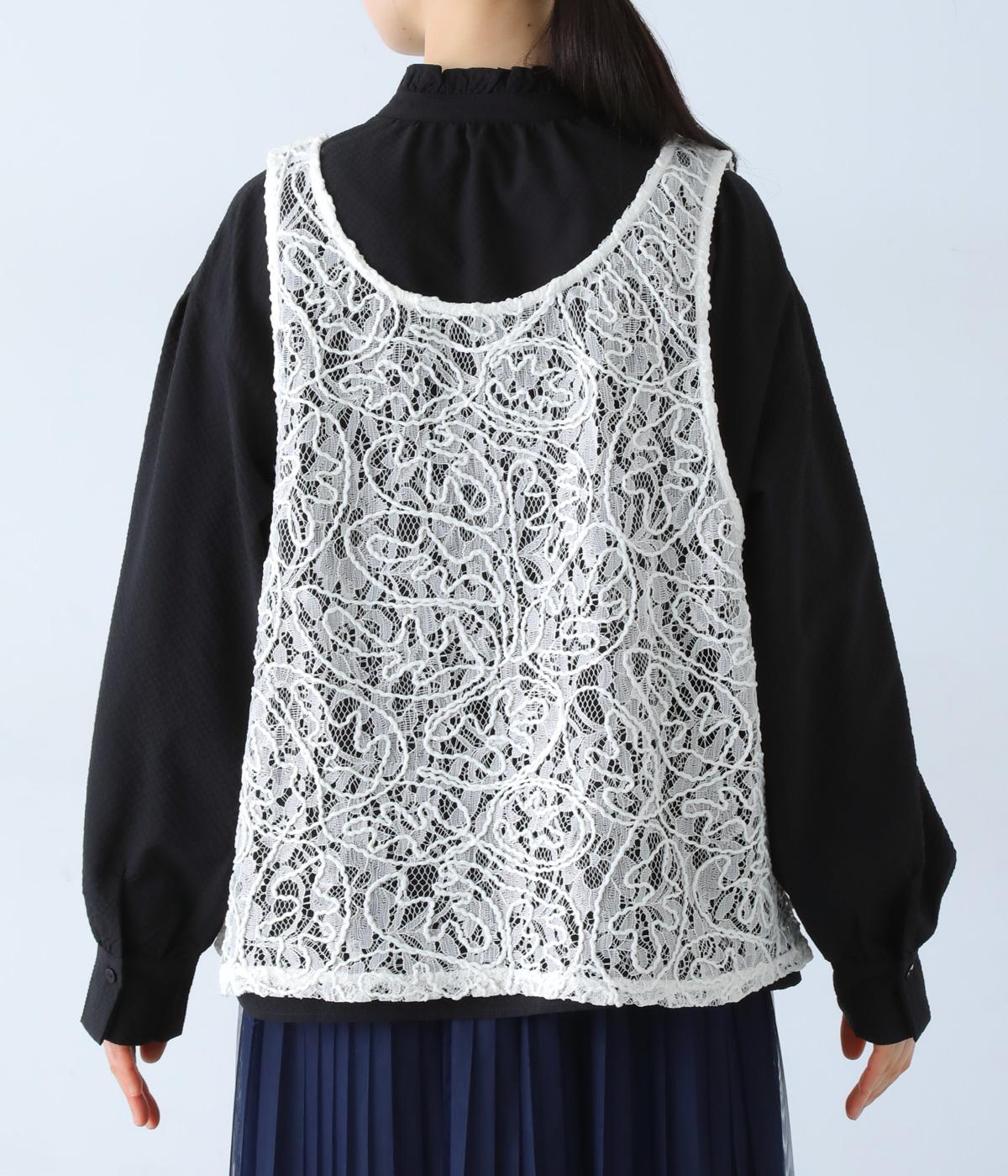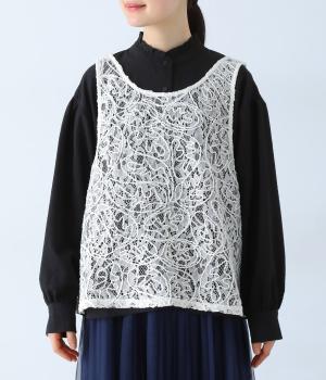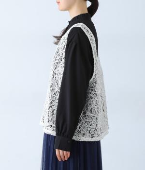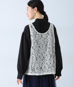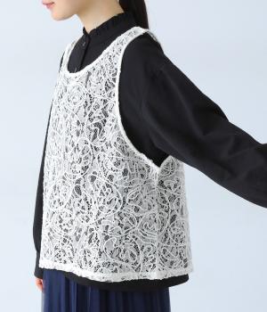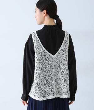 繊細なレース刺繍に立体的な曲線模様を重ねた、表情豊かなベスト。Vネックとクルーネックを前後2way仕様で楽しめます。インナーがほどよく透ける軽やかな素材感が魅力です。