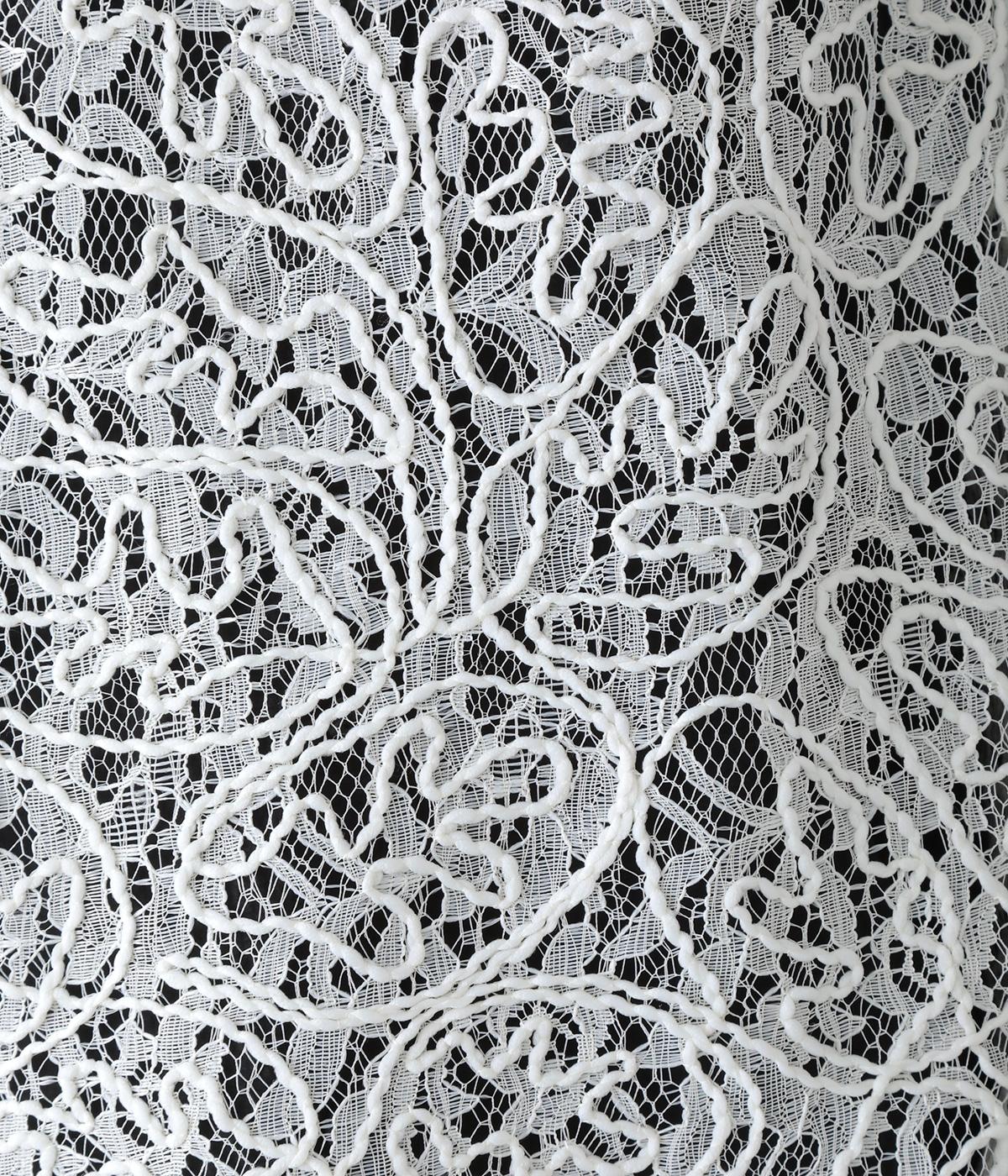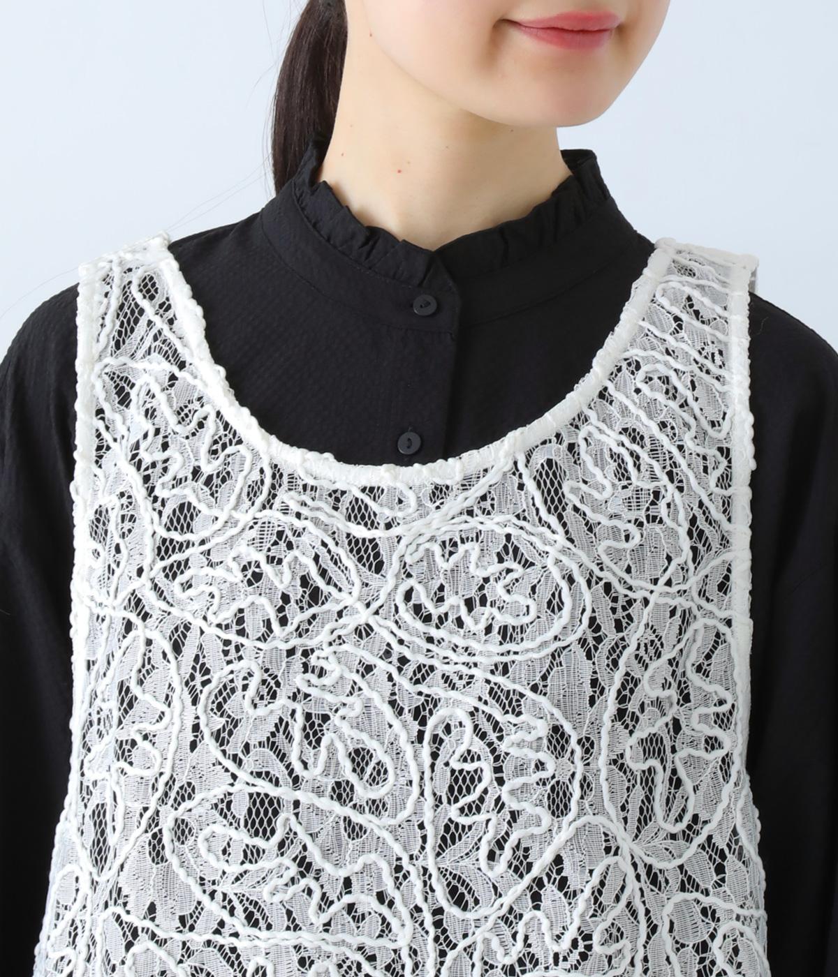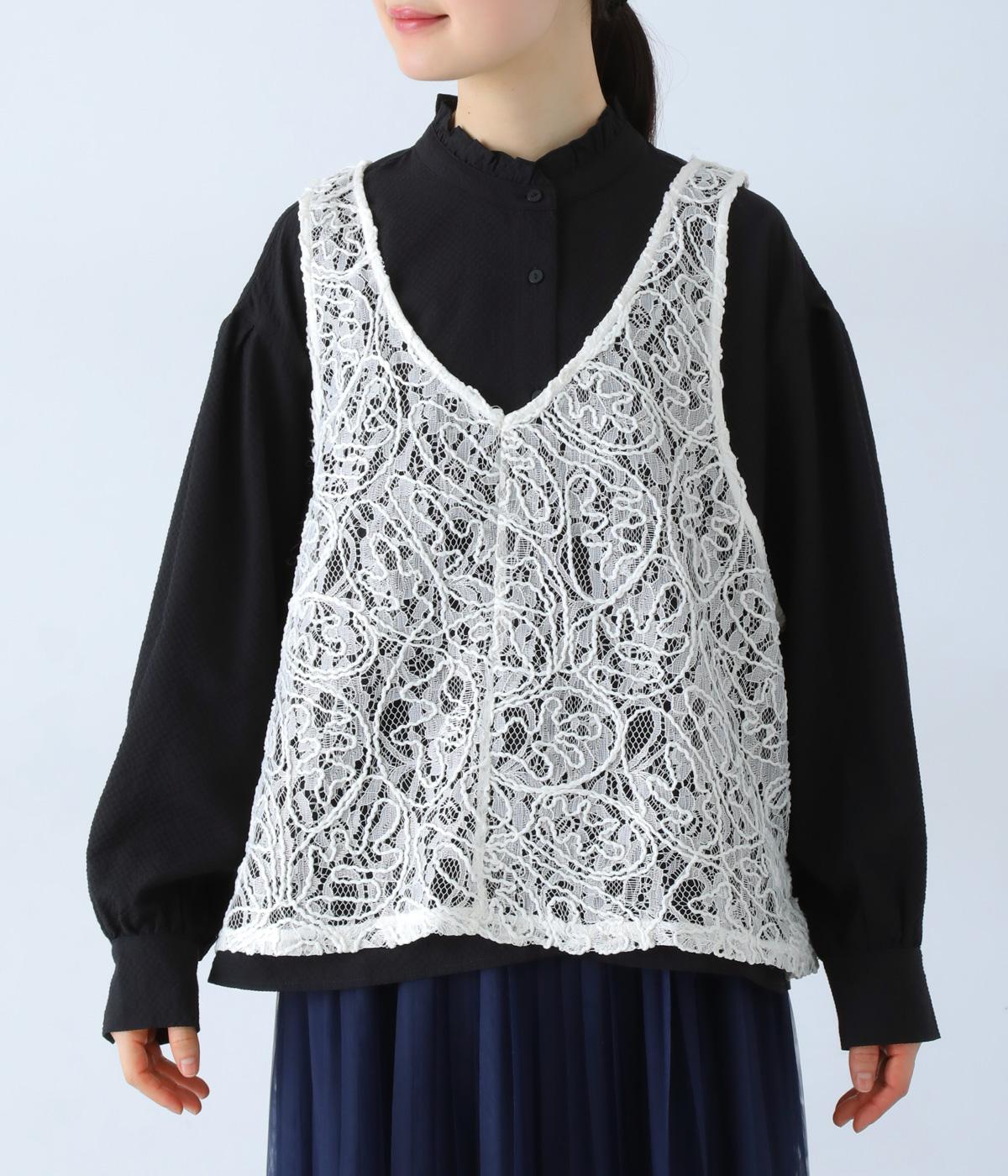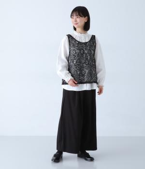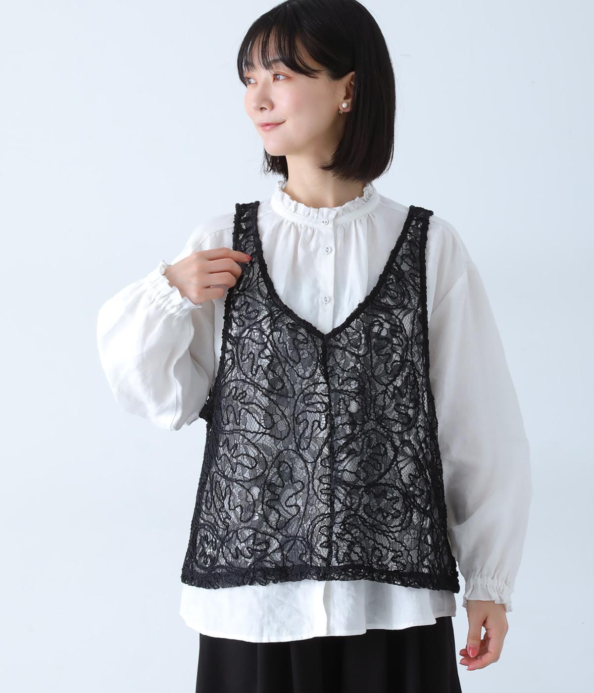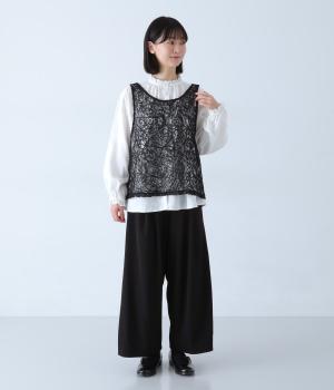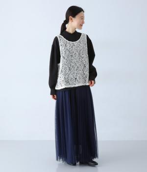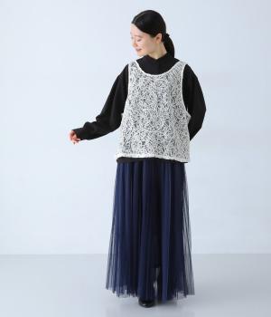 繊細なレース刺繍に立体的な曲線模様を重ねた、表情豊かなベスト。Vネックとクルーネックを前後2way仕様で楽しめます。インナーがほどよく透ける軽やかな素材感が魅力です。