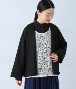 軽くて薄手のポリエステル素材を使用しています。透け感のある立体的なレース模様が上品で、軽やかに羽織れます。インナーを選ばず、ロングシーズン着まわせます。
