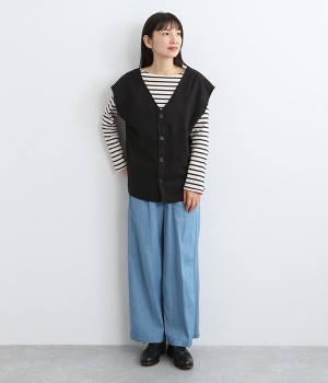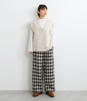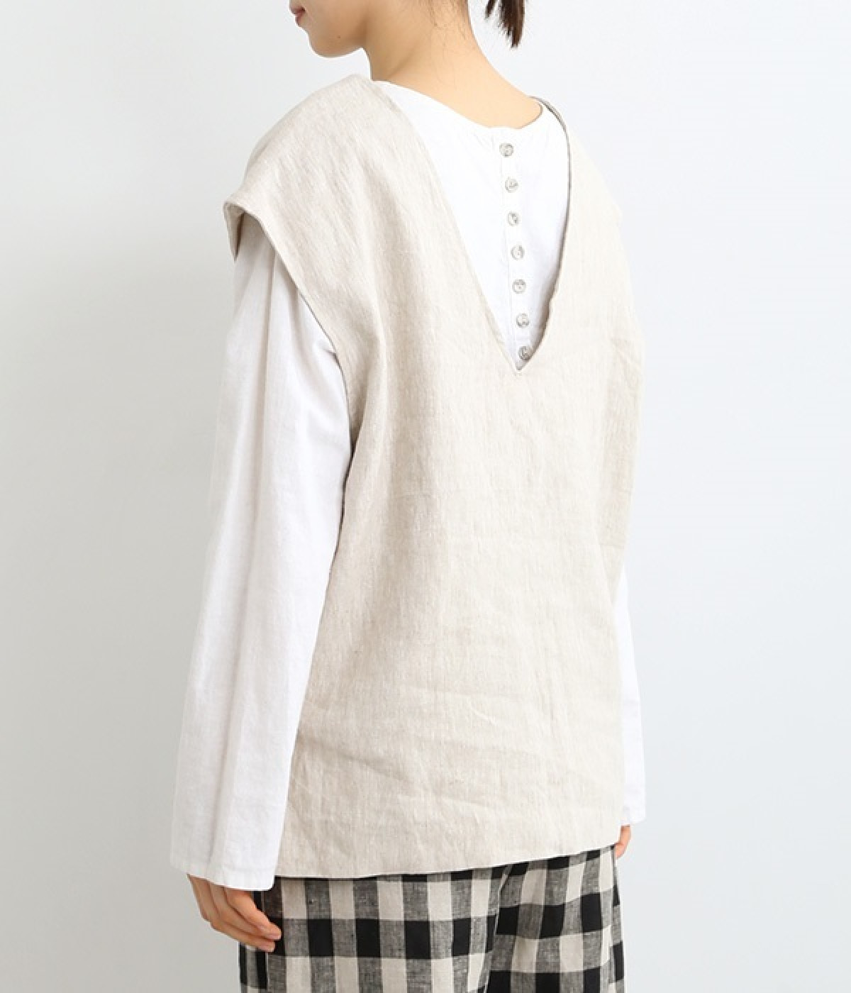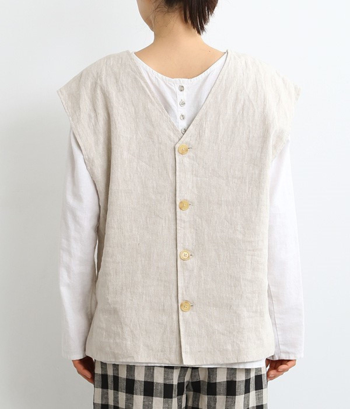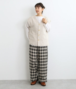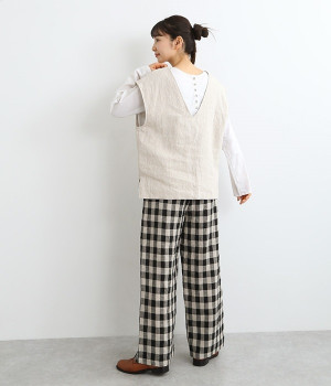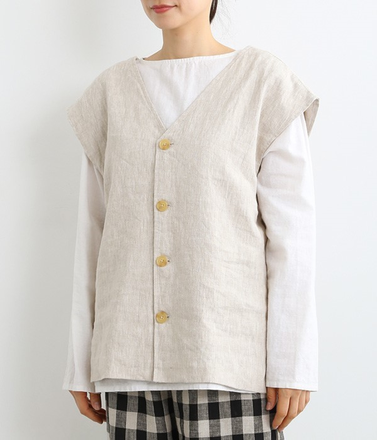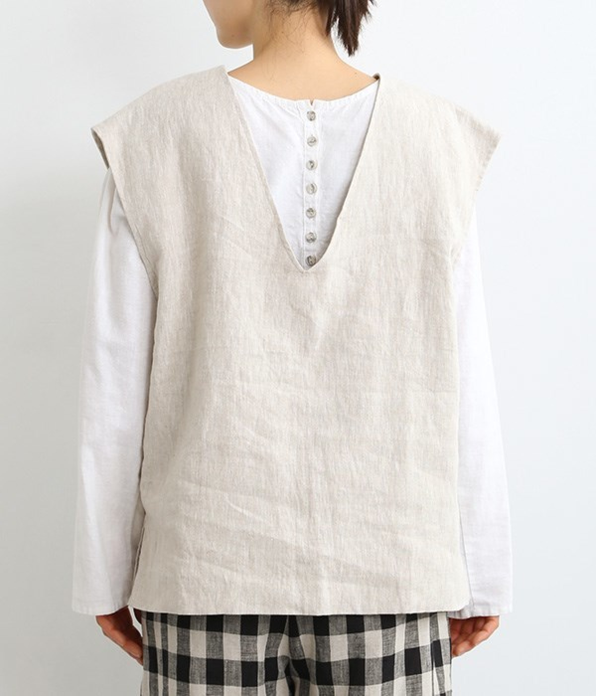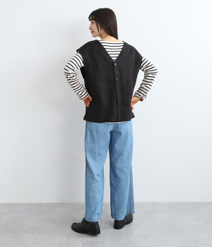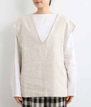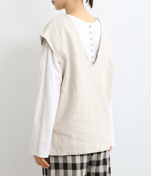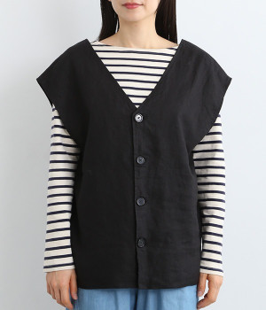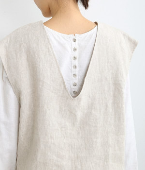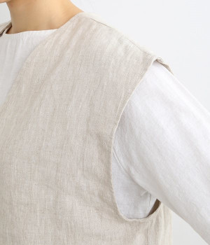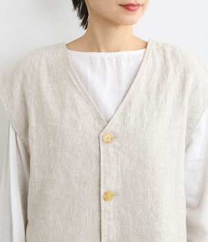 ナチュラルな風合いと洗いざらしのようなふくらみ感が魅力の、9番手リネンのベストです。ゆったりと開いたVネックと、少し肩先にかかる袖丈がリラクシーな雰囲気をかもしだします。シンプルなVネック面とボタン開きのVネック面、どちらをフロントにしても着用できる2WAYタイプ。生地のすべりを促す裏地をつけて、仕立ての良さも感じさせるつくりも◎。重ねたトップスの柄の存在感を和らげたり、同じ色みのワンピースを合わせて奥行き感を出したりと、スタイリングの印象を変えるのに便利です。