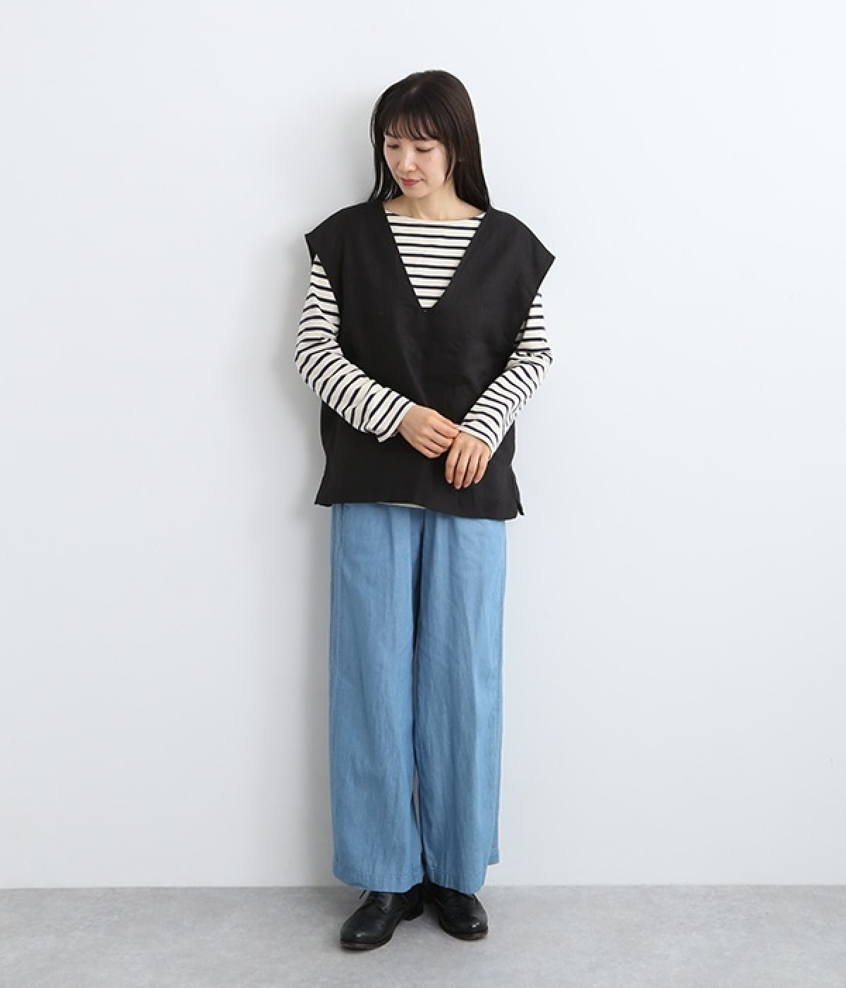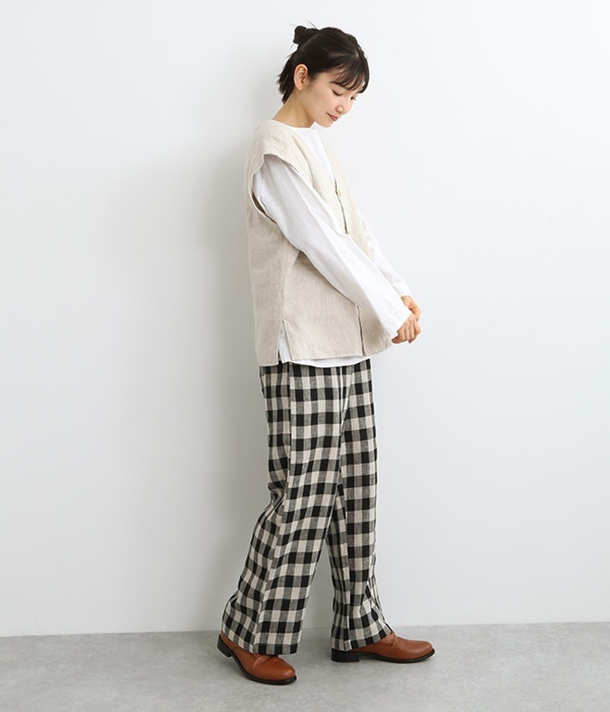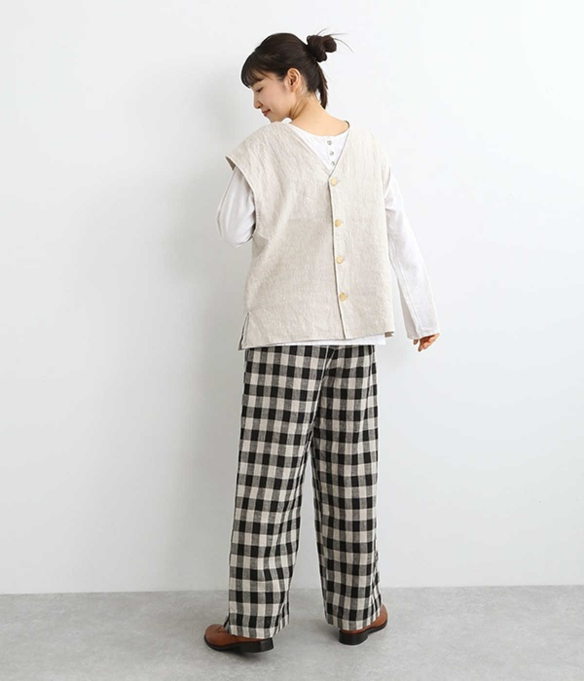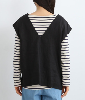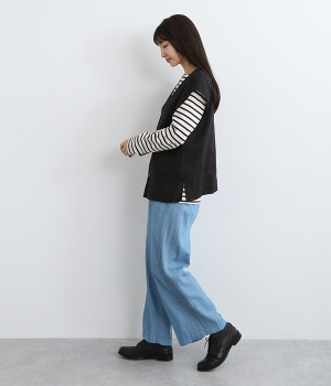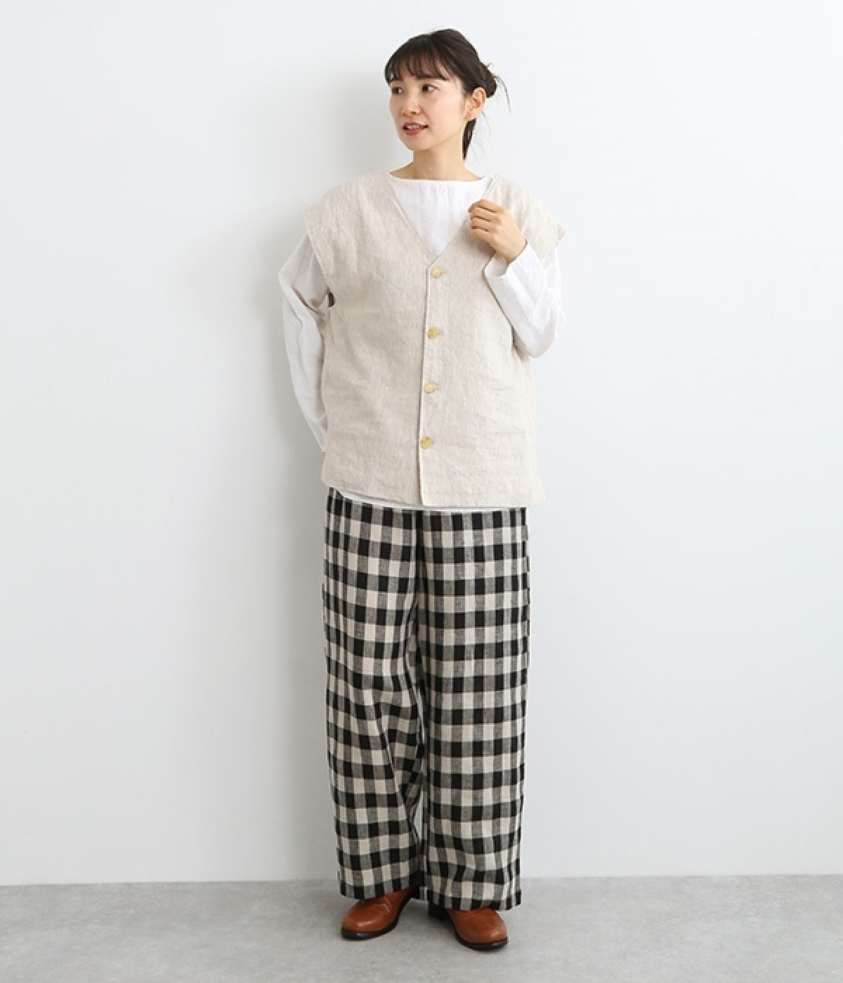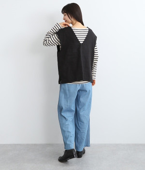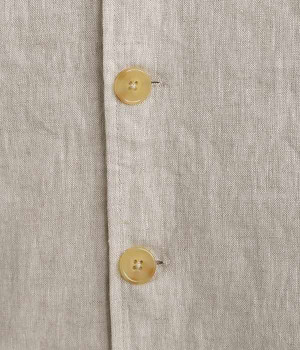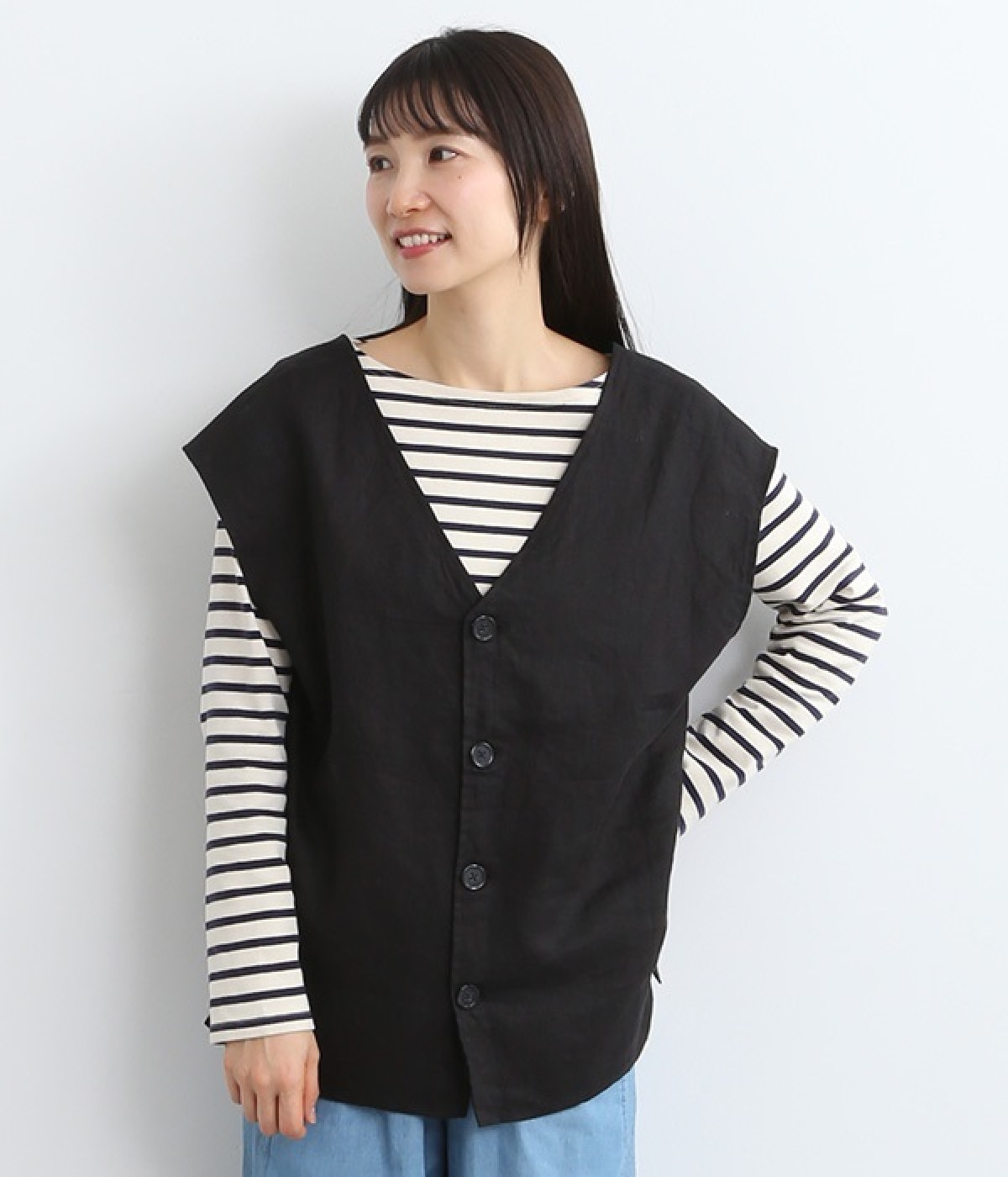 ナチュラルな風合いと洗いざらしのようなふくらみ感が魅力の、9番手リネンのベストです。ゆったりと開いたVネックと、少し肩先にかかる袖丈がリラクシーな雰囲気をかもしだします。シンプルなVネック面とボタン開きのVネック面、どちらをフロントにしても着用できる2WAYタイプ。生地のすべりを促す裏地をつけて、仕立ての良さも感じさせるつくりも◎。重ねたトップスの柄の存在感を和らげたり、同じ色みのワンピースを合わせて奥行き感を出したりと、スタイリングの印象を変えるのに便利です。