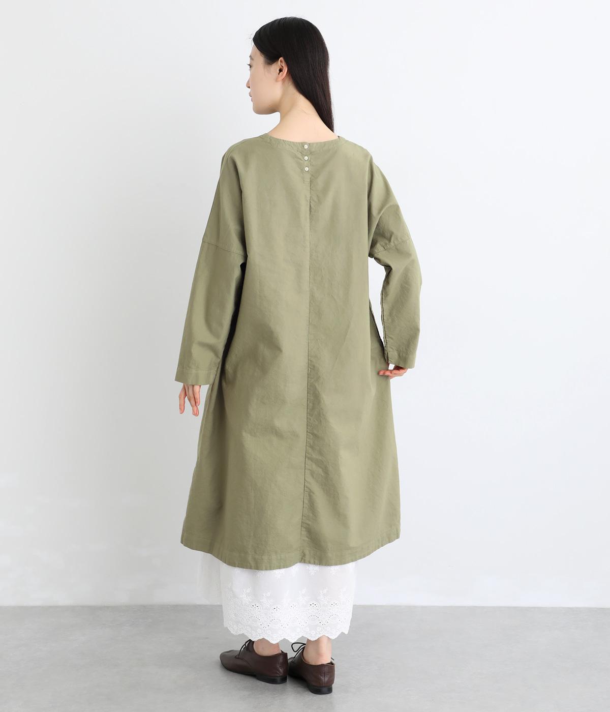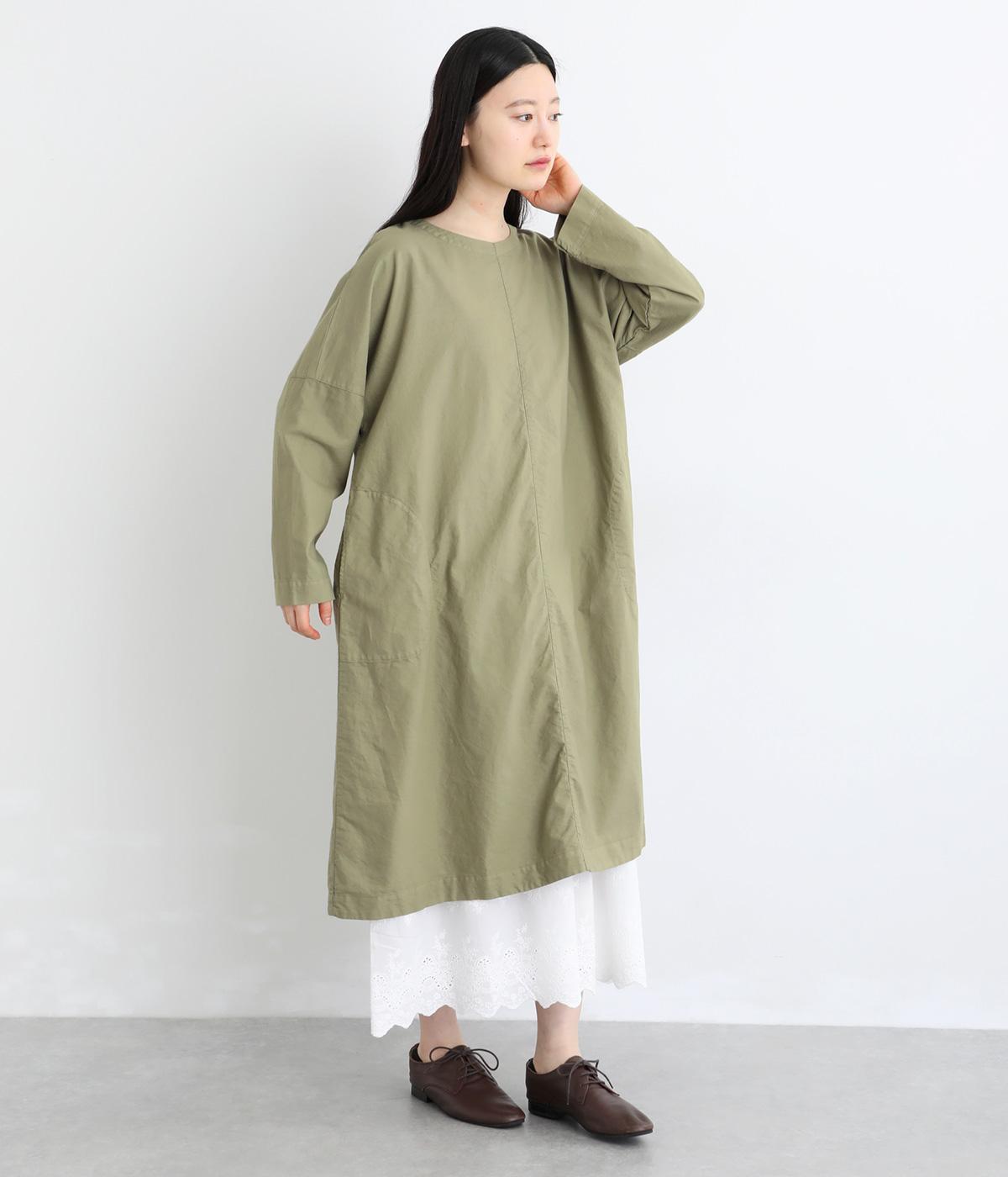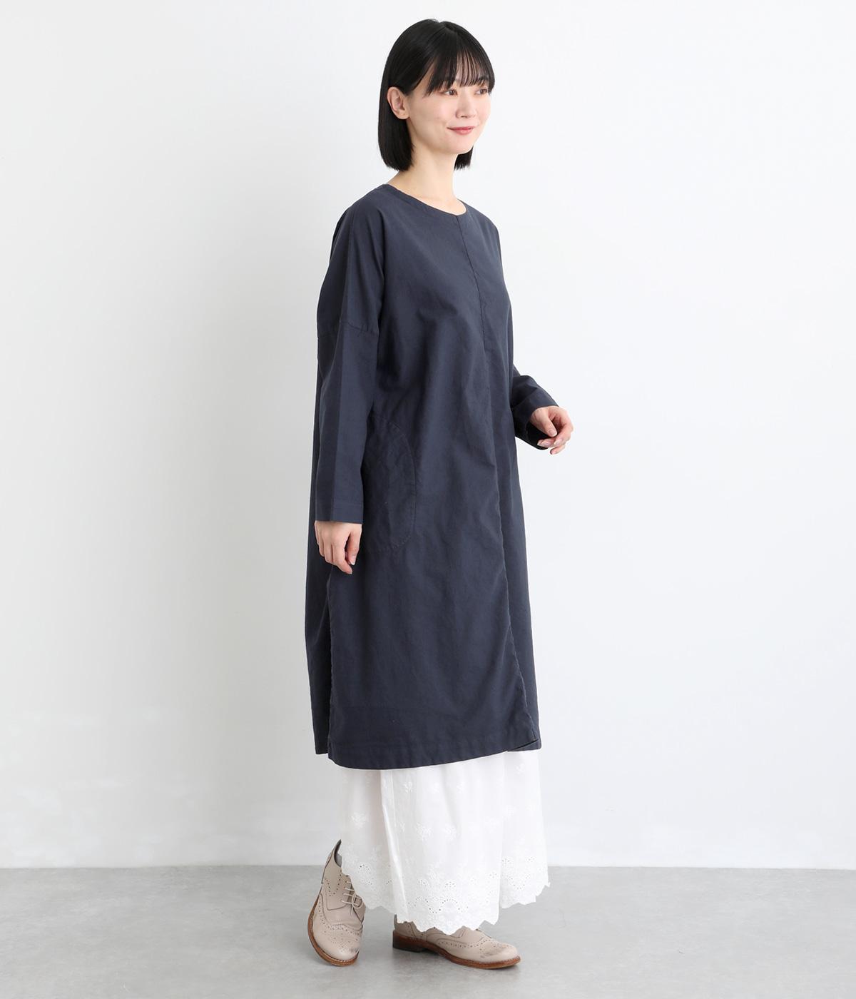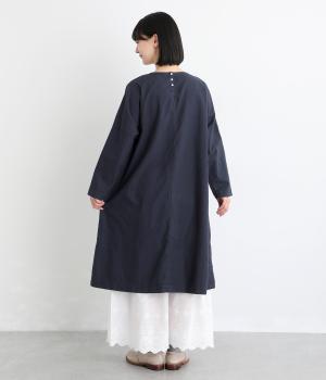 シンプルなシルエットのワンピースは、スカートやパンツとのレイヤードスタイルなど、着こなしの幅が広がるアイテムです。フロントに入った切り替えステッチが縦のラインを強調し、全体をすっきりと見せてくれます。うしろにボタンがついているので、着脱しやすいのもうれしいポイント。