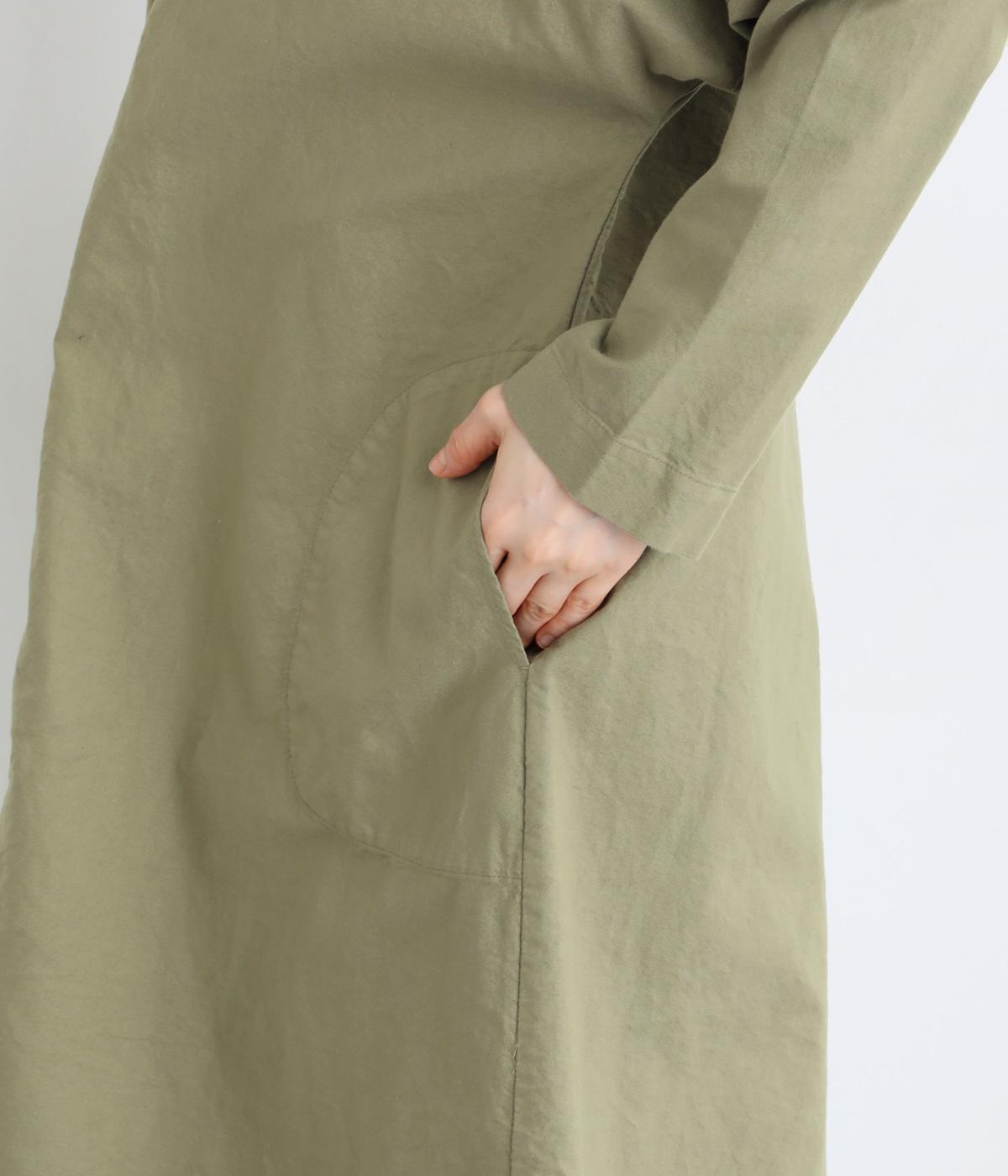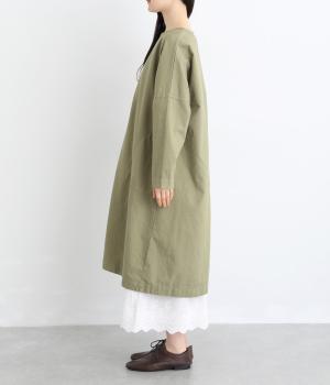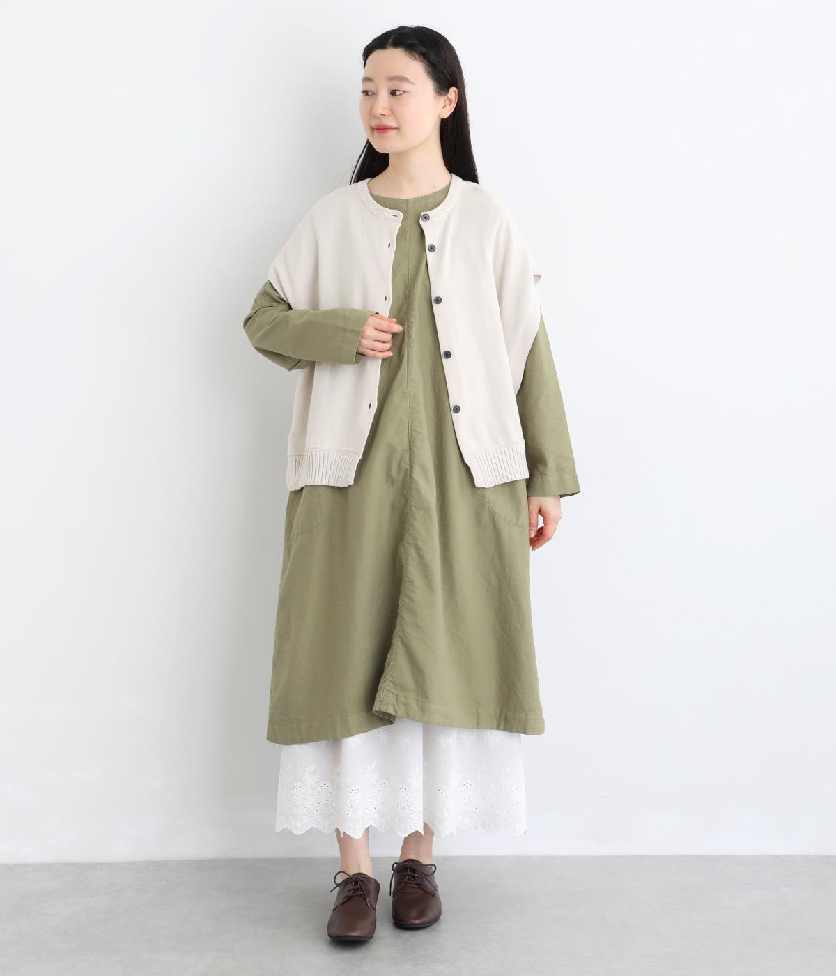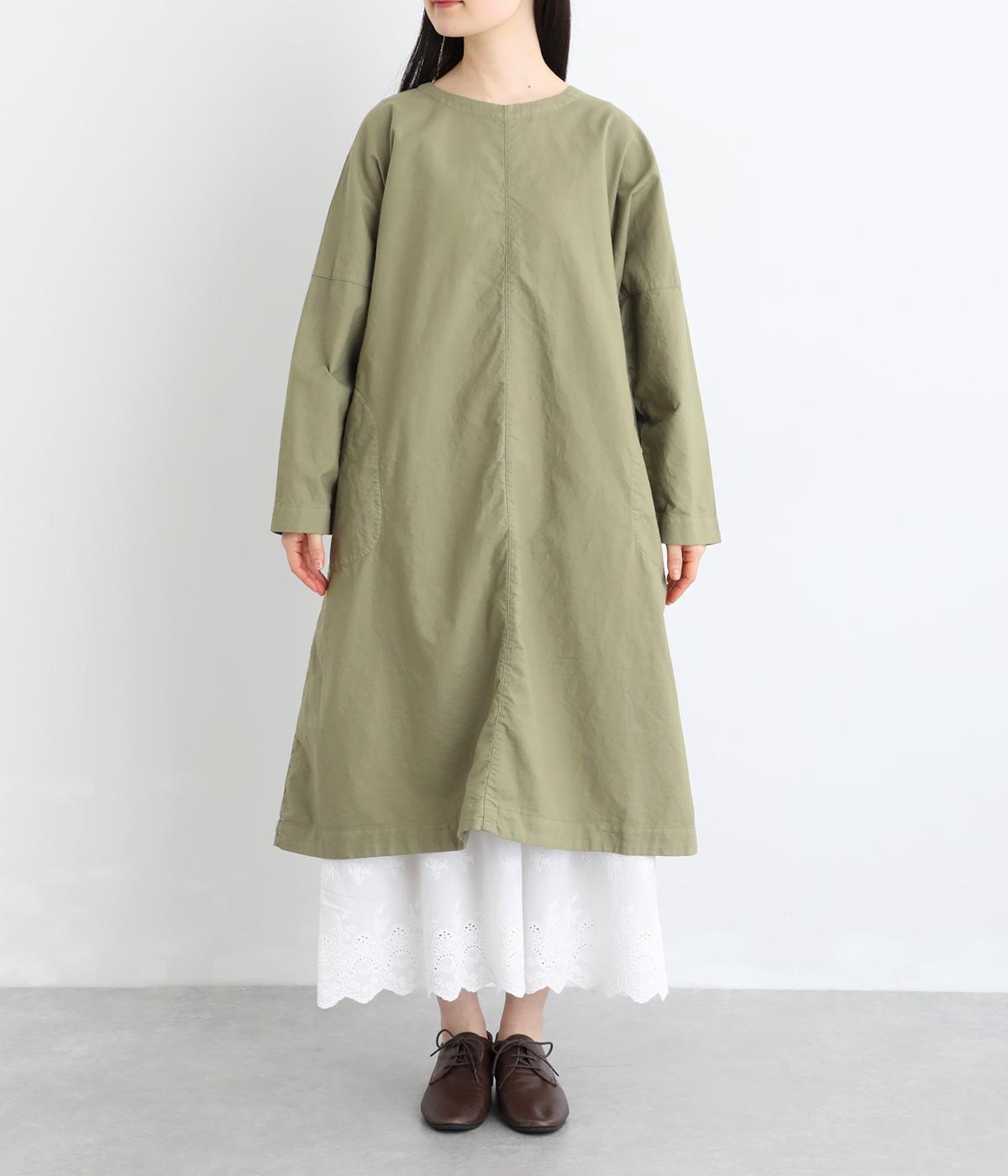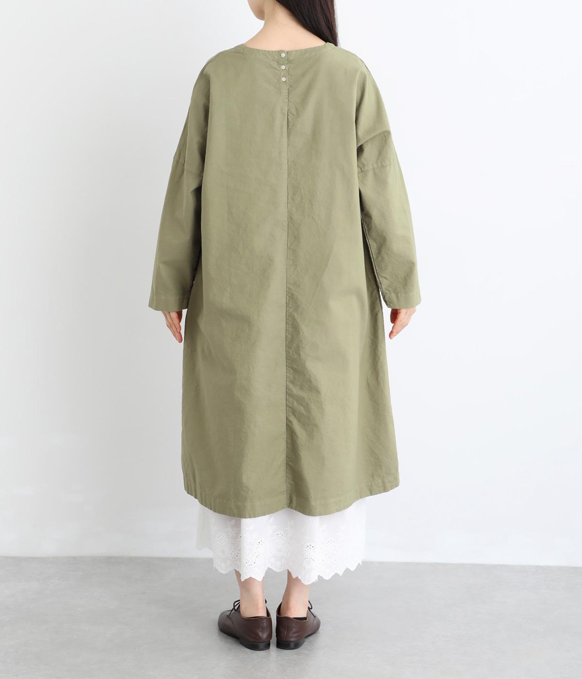 シンプルなシルエットのワンピースは、スカートやパンツとのレイヤードスタイルなど、着こなしの幅が広がるアイテムです。フロントに入った切り替えステッチが縦のラインを強調し、全体をすっきりと見せてくれます。うしろにボタンがついているので、着脱しやすいのもうれしいポイント。