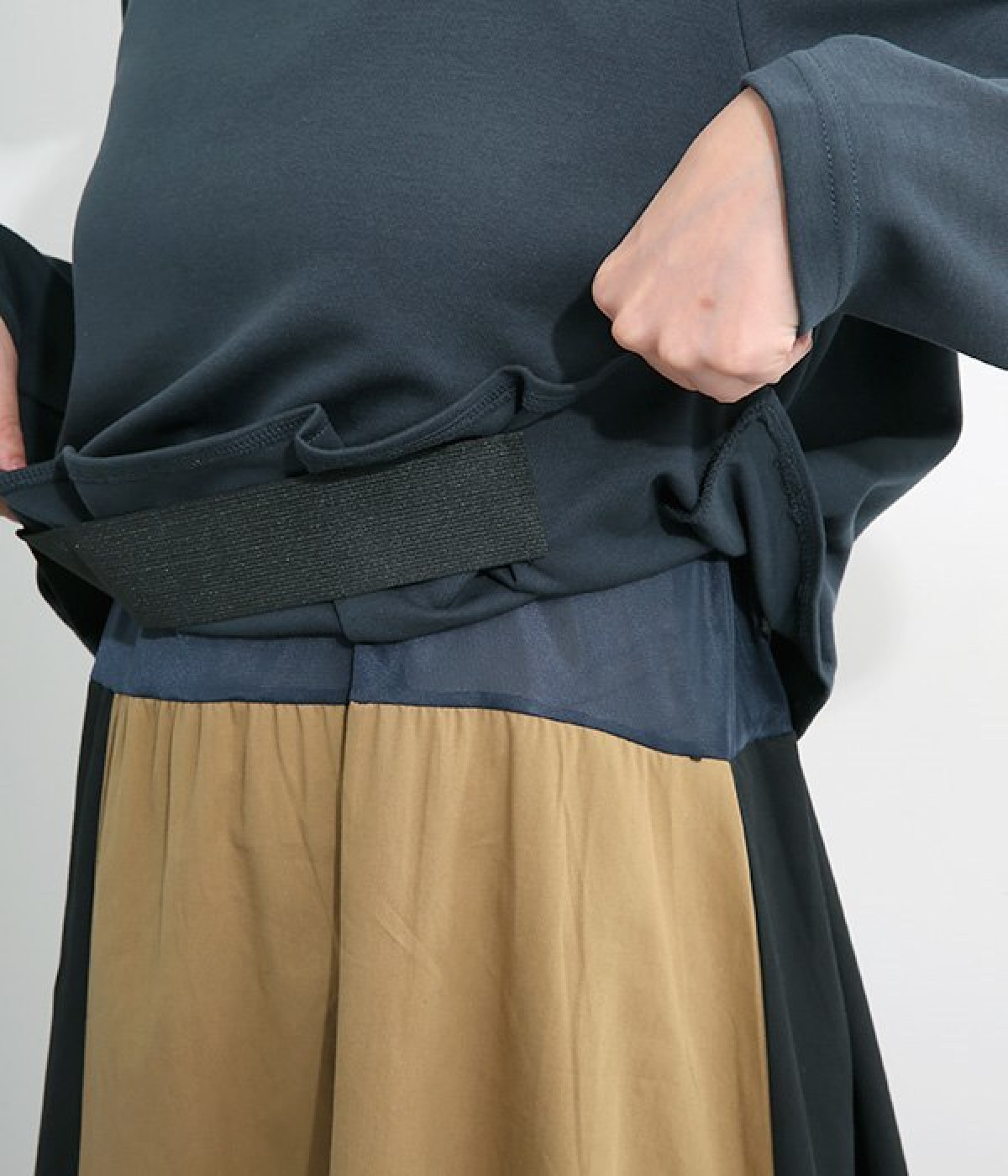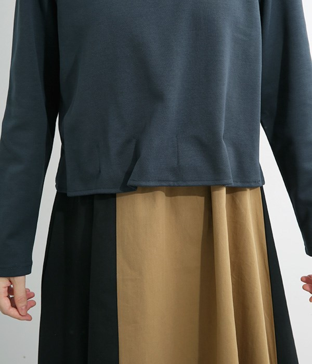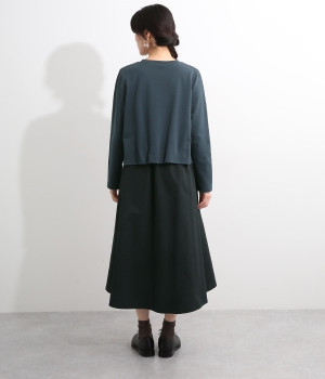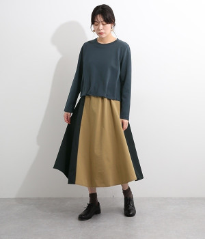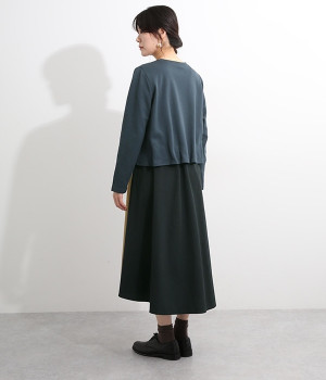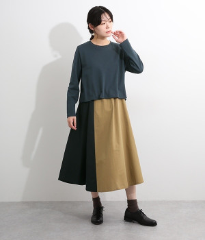 短めトップスとロングスカートを合わせたような、ドッキングデザインのワンピースです。スカート部分はハリのある配色生地を縦に切り替えることですらりとした印象に。トップの裾部分にはゴムテープを施し、タックを取ったような動きのある表情に仕上げました。トップ部分はややストレッチがきいているため脱ぎ着をアシスト。コーディネート要らずで忙しい朝にもおすすめのアイテムです。