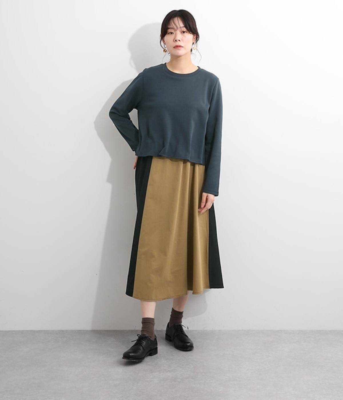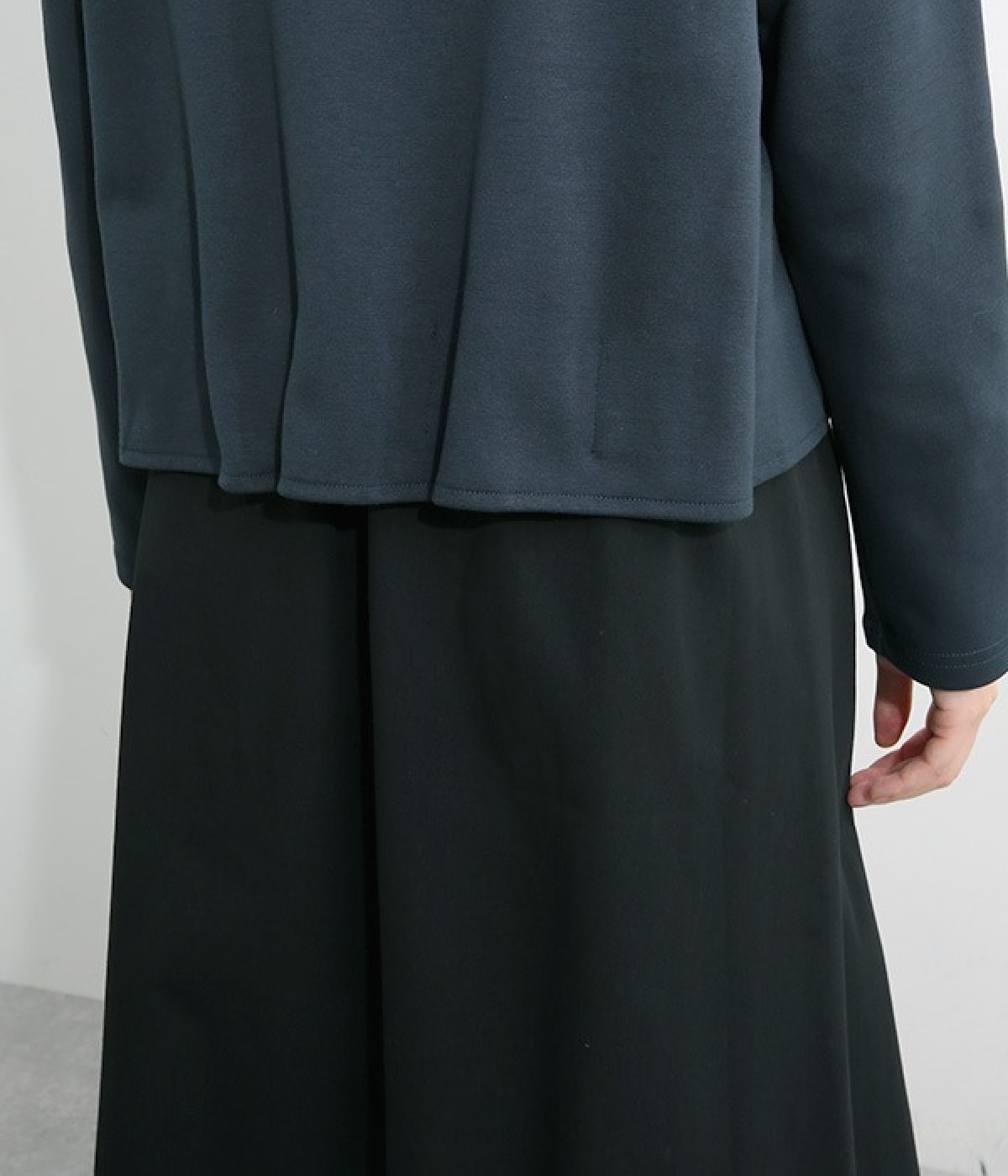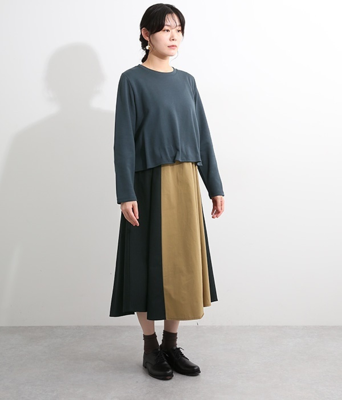 短めトップスとロングスカートを合わせたような、ドッキングデザインのワンピースです。スカート部分はハリのある配色生地を縦に切り替えることですらりとした印象に。トップの裾部分にはゴムテープを施し、タックを取ったような動きのある表情に仕上げました。トップ部分はややストレッチがきいているため脱ぎ着をアシスト。コーディネート要らずで忙しい朝にもおすすめのアイテムです。