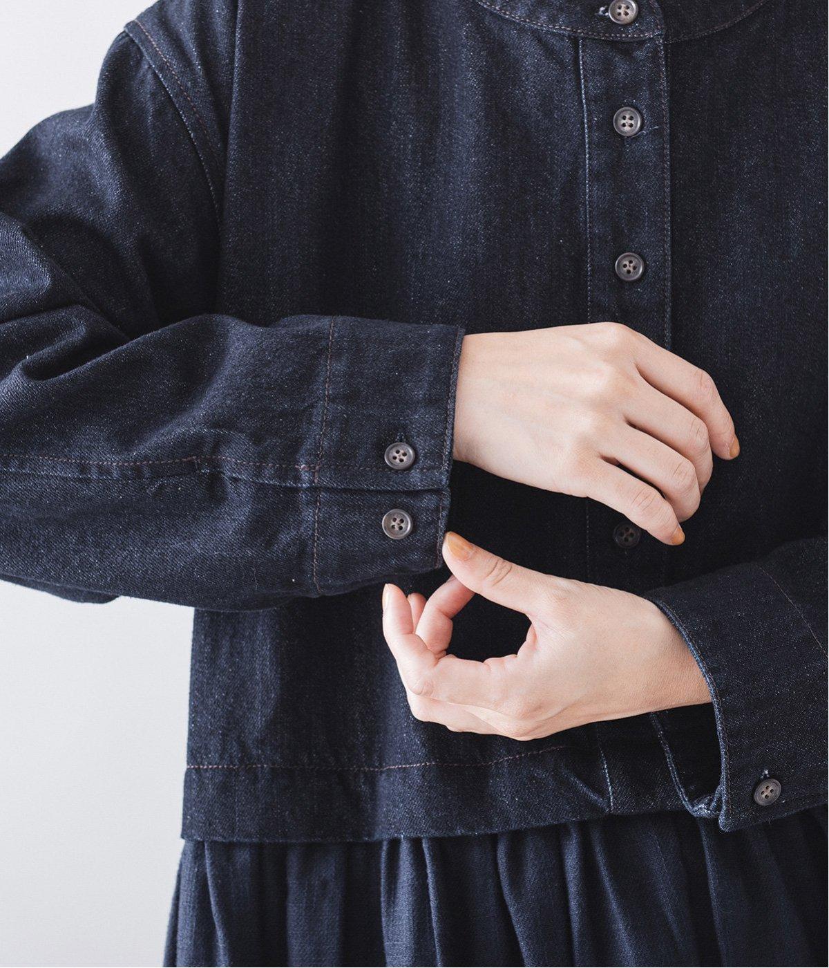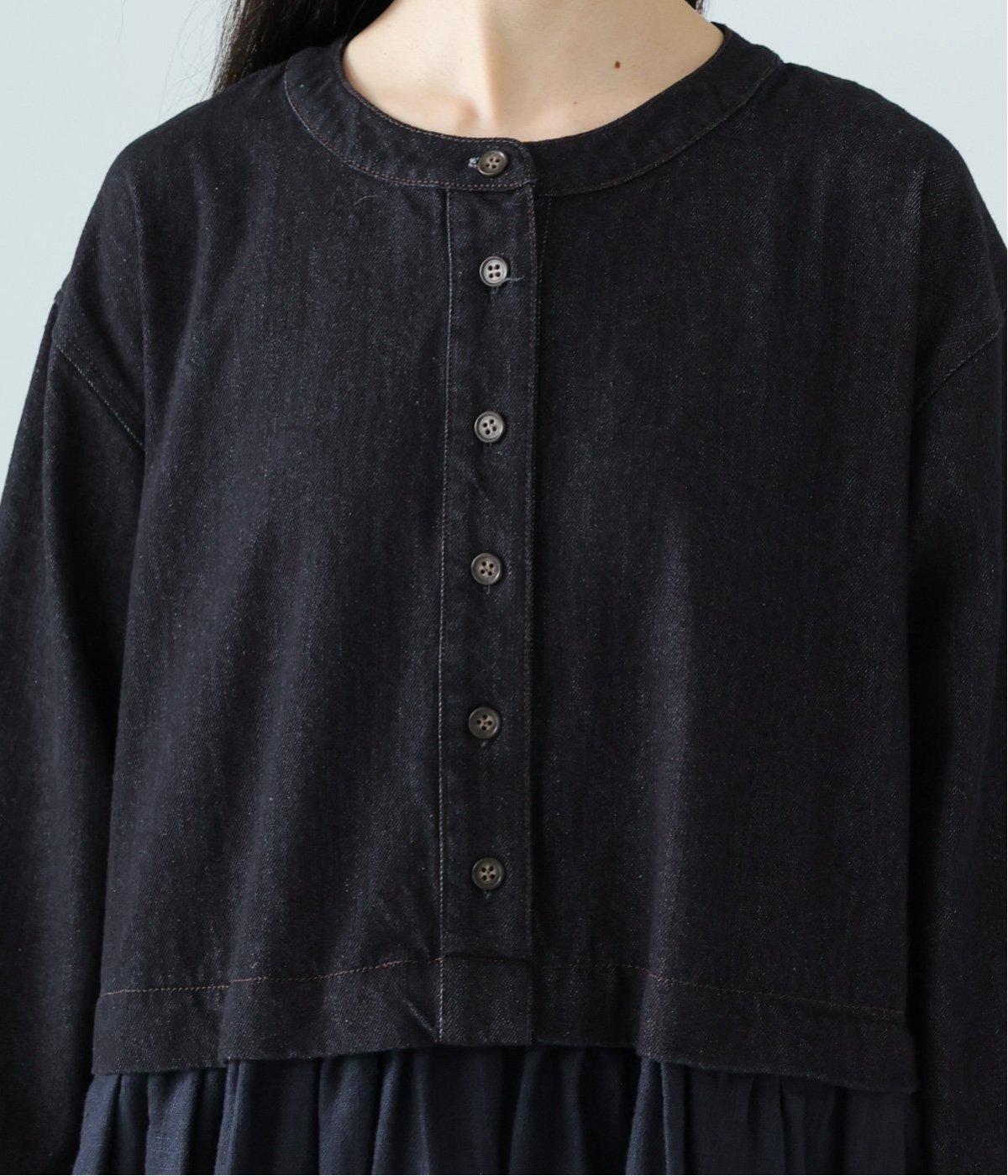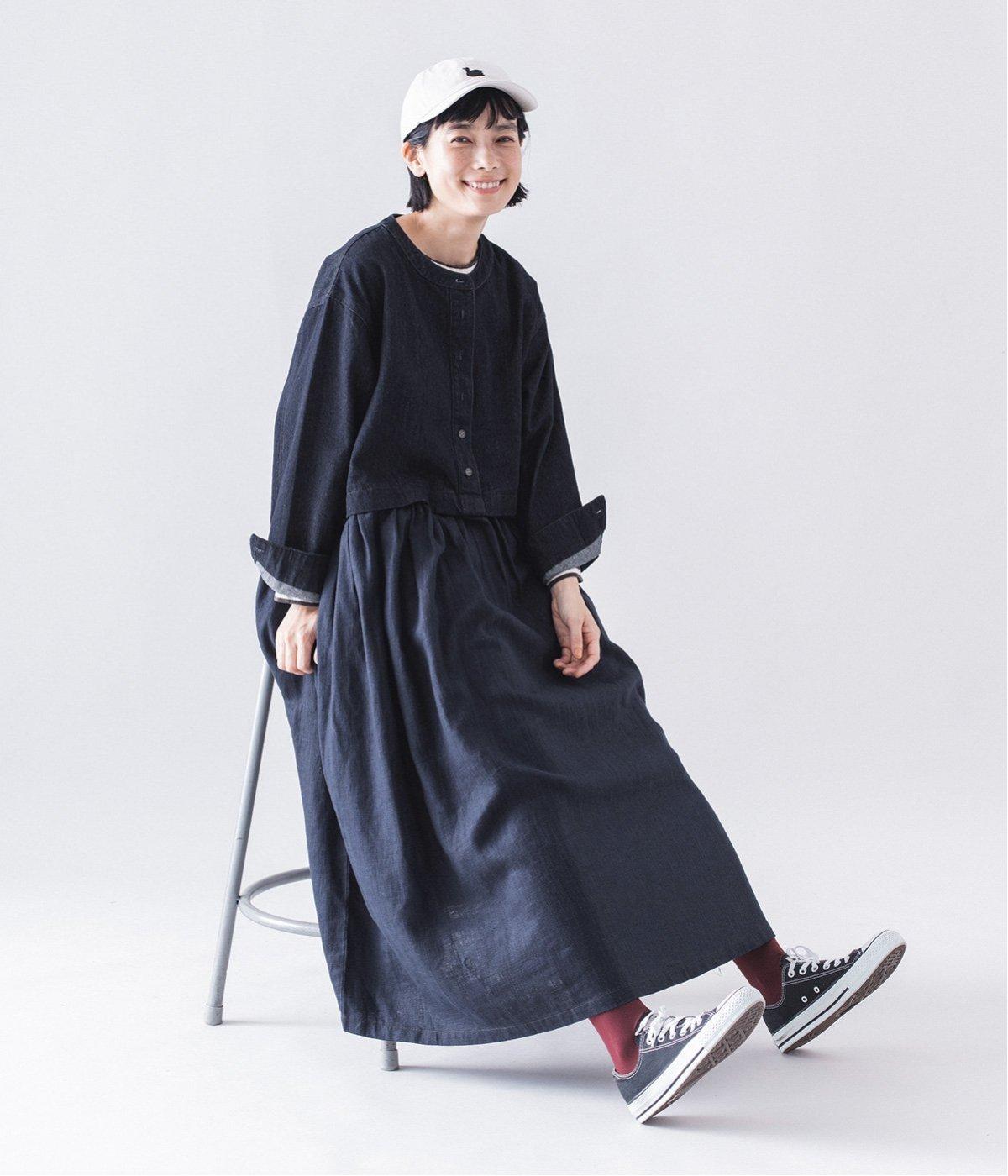 首元をきれいに見せるバンドカラーに、ウエストまで開く前ボタンで着脱もスムーズ。軽やかなスカートにデニムトップスを重ねたような仕様が印象的な、大人に似合うフォルムに仕上げました。