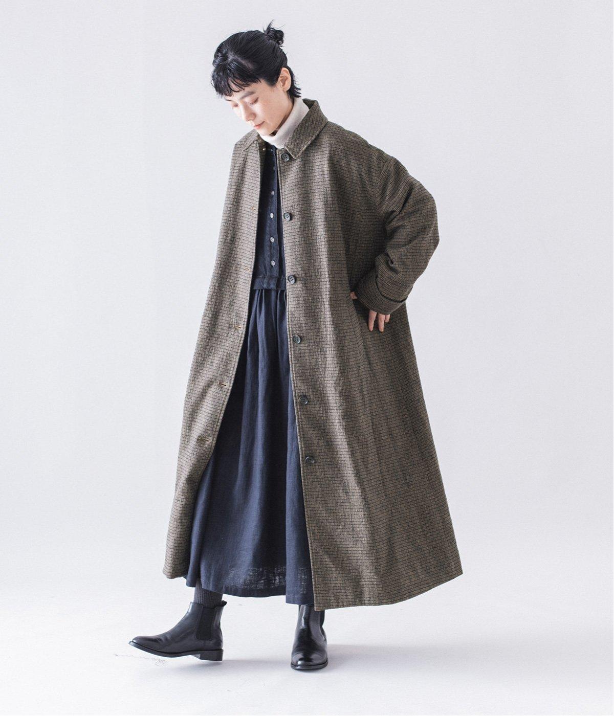 ベージュのタートルネックを重ねてチェック柄のコートを羽織れば、ぬくもりを感じる冬の装いが完成。ワンピースの深いネイビーが、今季らしいブラウンのグラデーションをおだやかに調和させます。