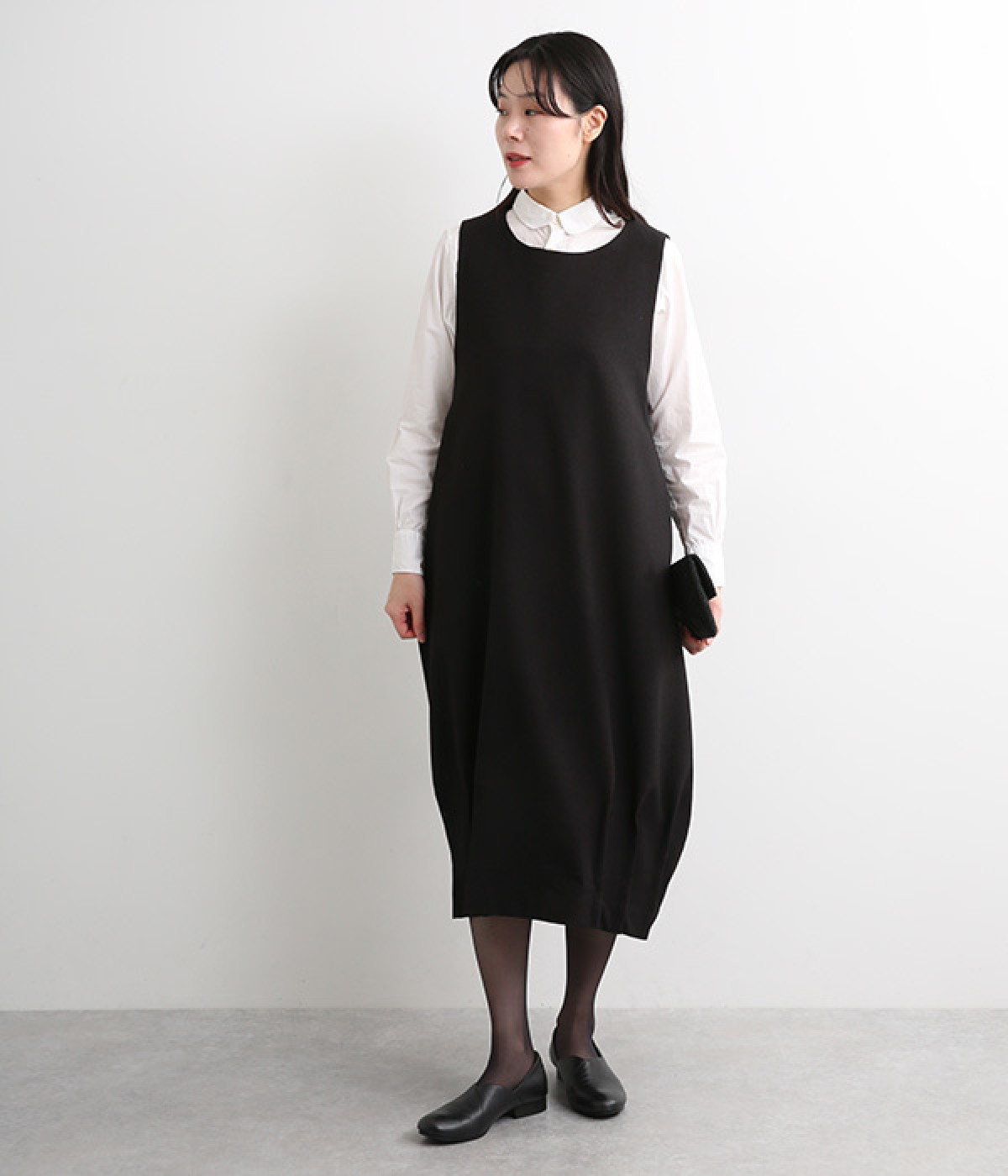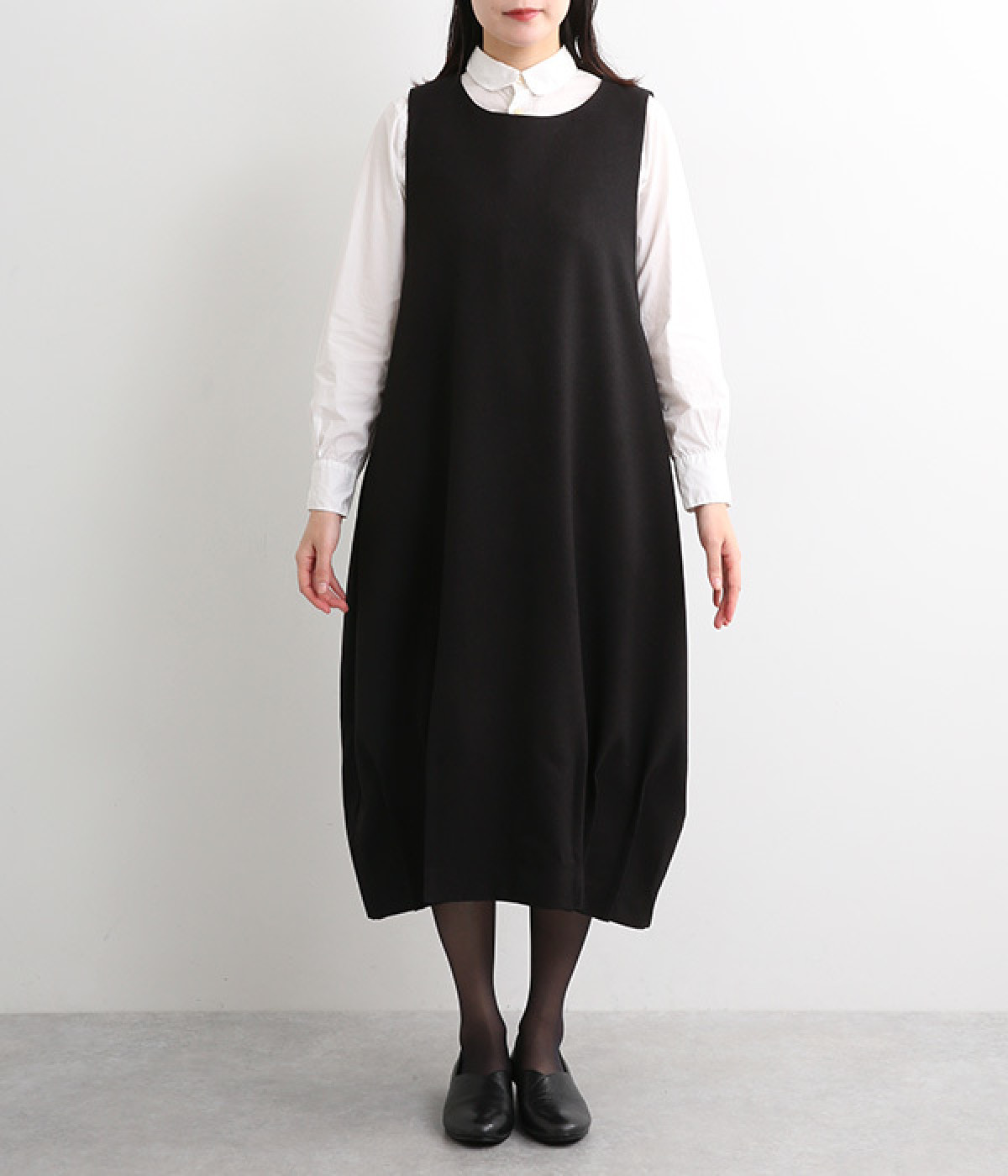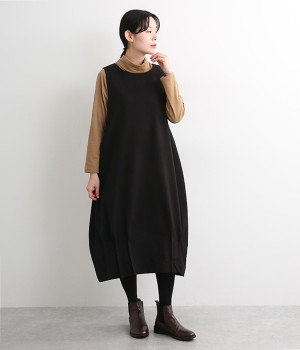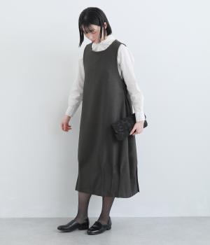 品のあるフォーマルな表情のワンピースの裾にタックをほどこし、コクーンシルエットに仕立てました。背中の涙あきがエレガントな雰囲気を後押しします。さりげないディテールが抜け感をもたらし、日々のスタイリングにもなじむ一枚です。