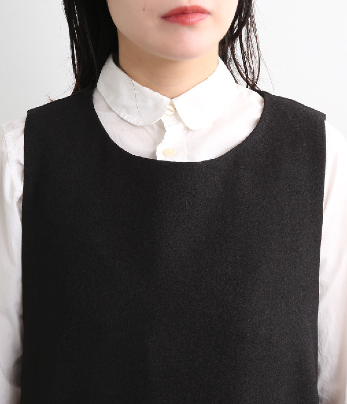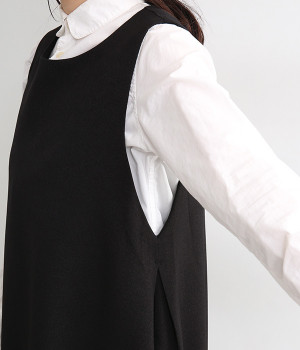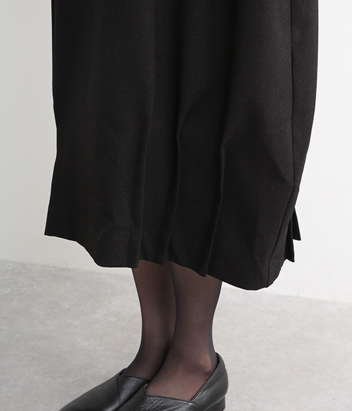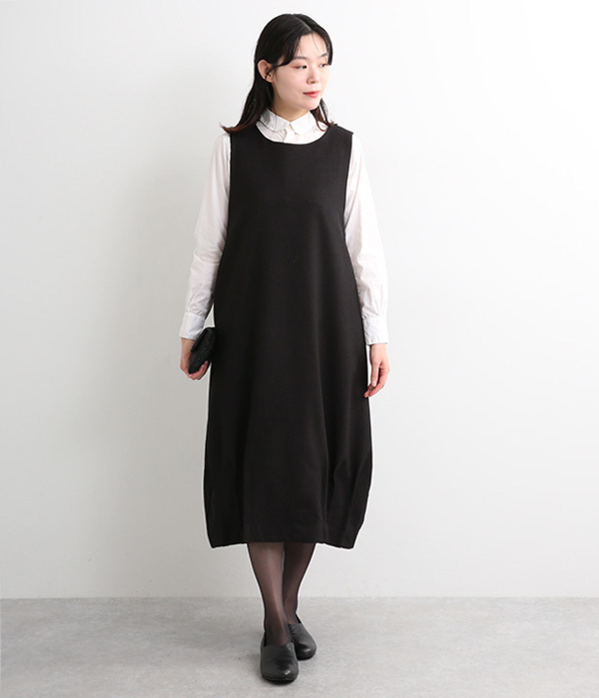 品のあるフォーマルな表情のワンピースの裾にタックをほどこし、コクーンシルエットに仕立てました。背中の涙あきがエレガントな雰囲気を後押しします。さりげないディテールが抜け感をもたらし、日々のスタイリングにもなじむ一枚です。