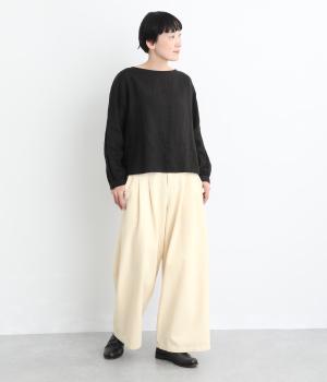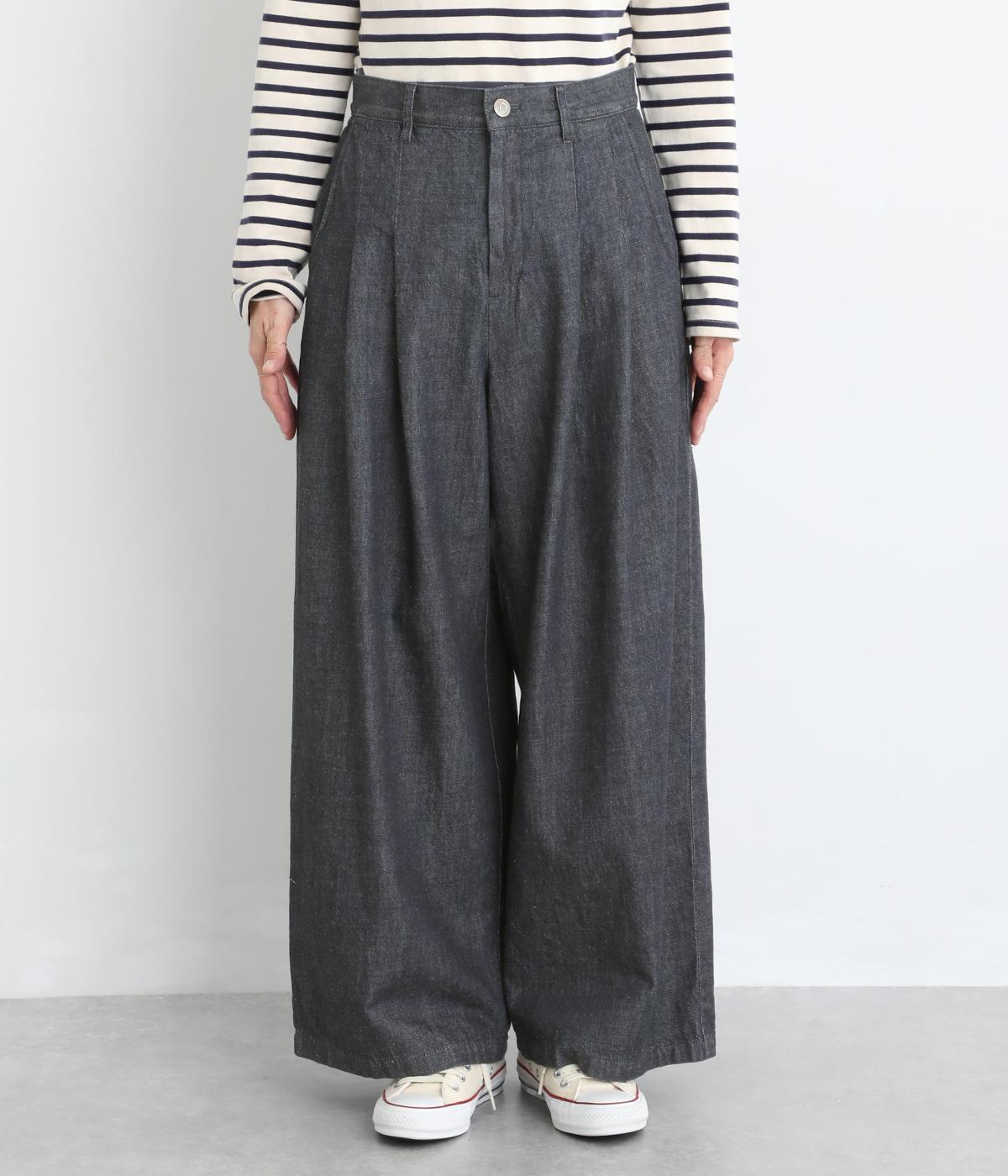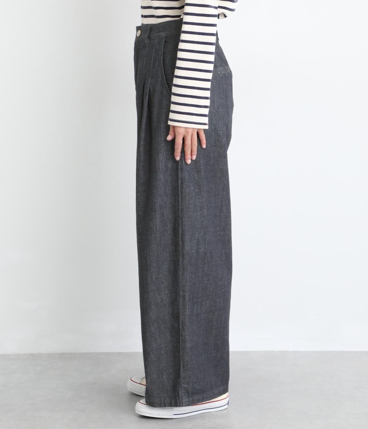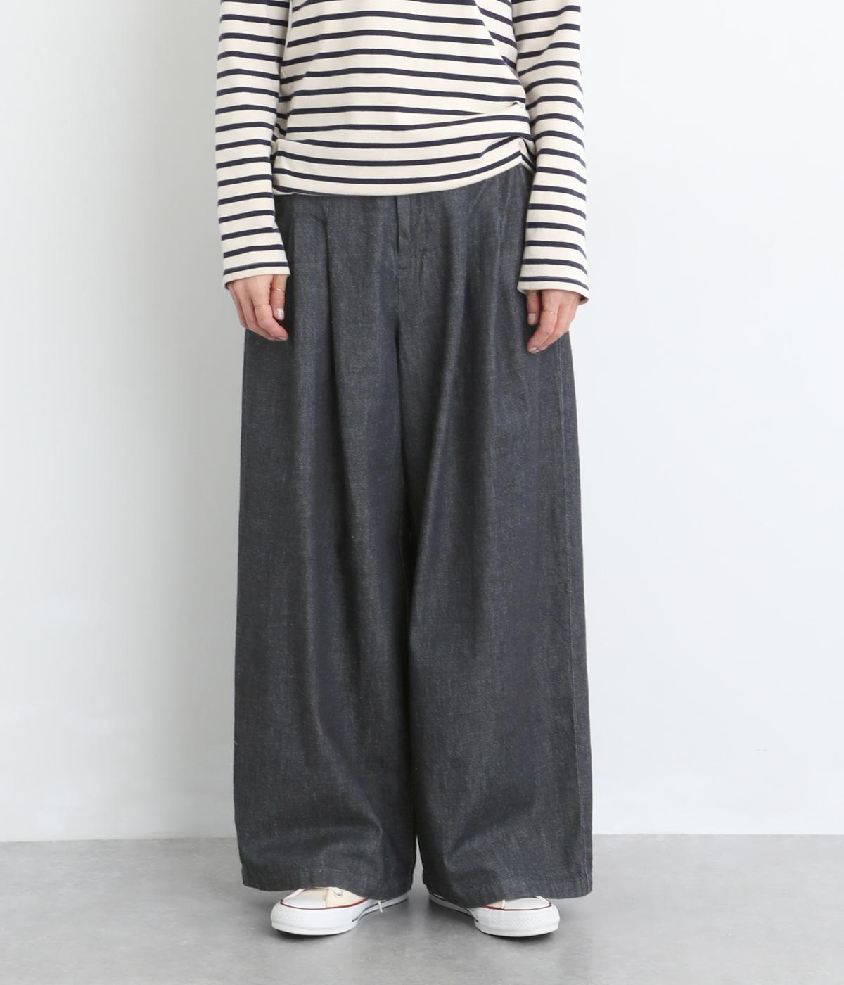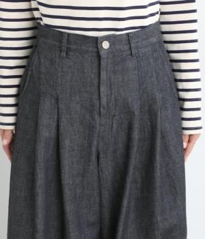 体のラインを拾いにくいワイドシルエットのパンツ。落ち感のある生地が縦のラインをつくり、すっきりとした印象に。ウエストはボタンとファスナー仕様でベルトループつき。ハイウエストで、トップスをインのスタイリングもサマになります。