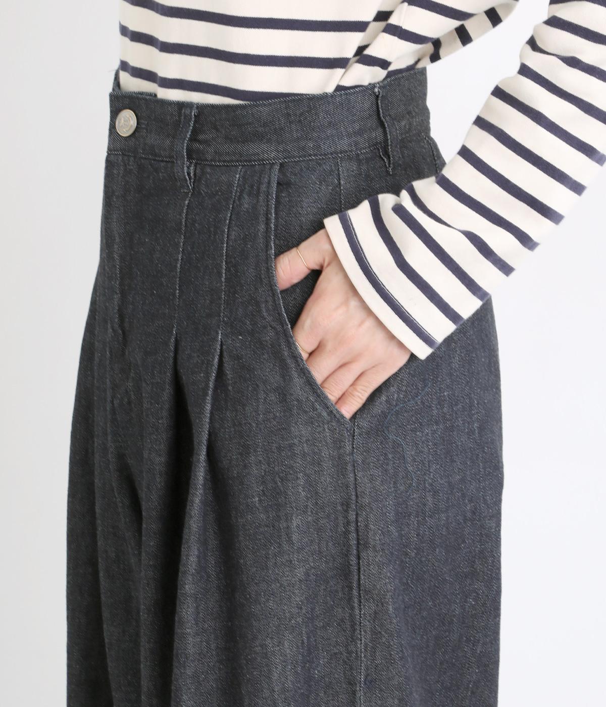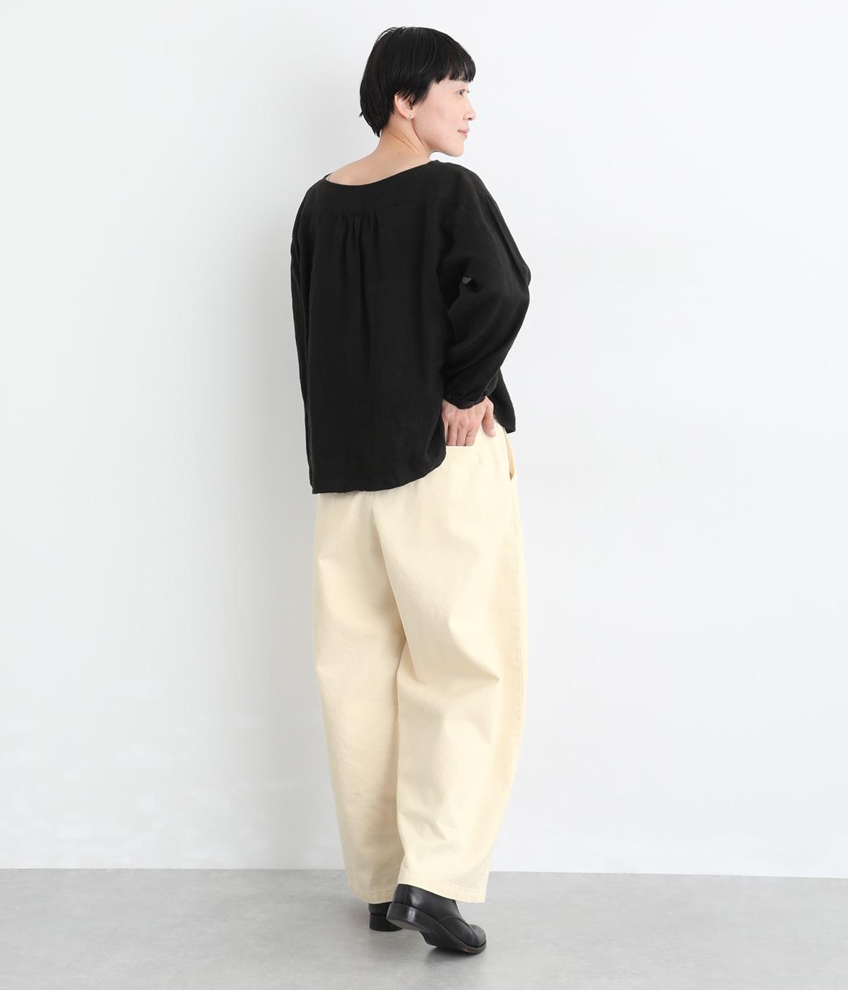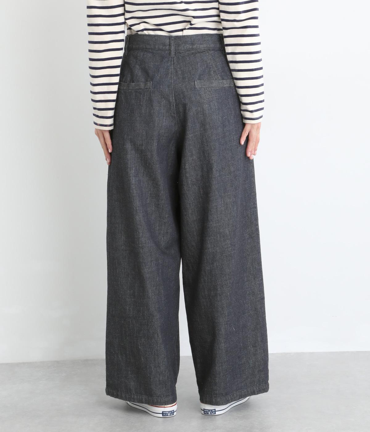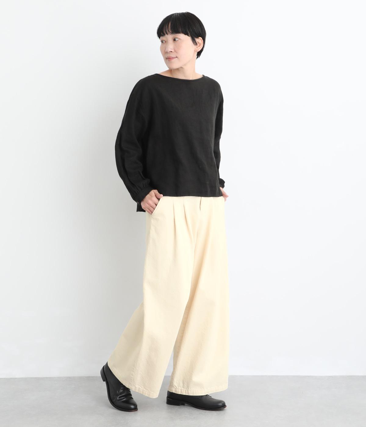 体のラインを拾いにくいワイドシルエットのパンツ。落ち感のある生地が縦のラインをつくり、すっきりとした印象に。ウエストはボタンとファスナー仕様でベルトループつき。ハイウエストで、トップスをインのスタイリングもサマになります。