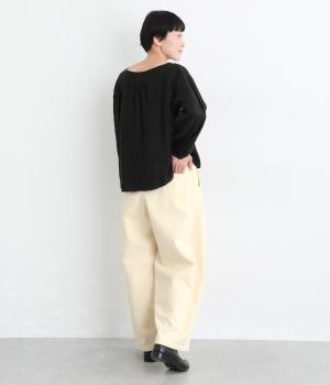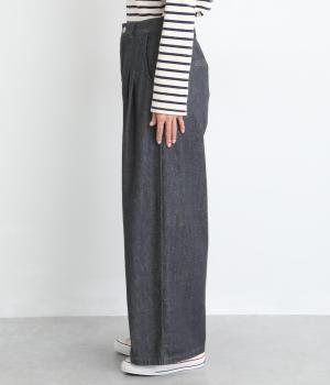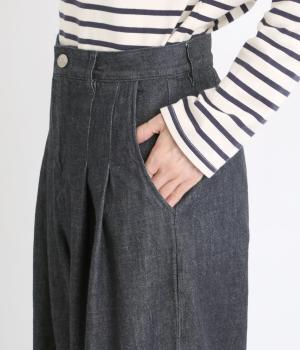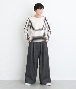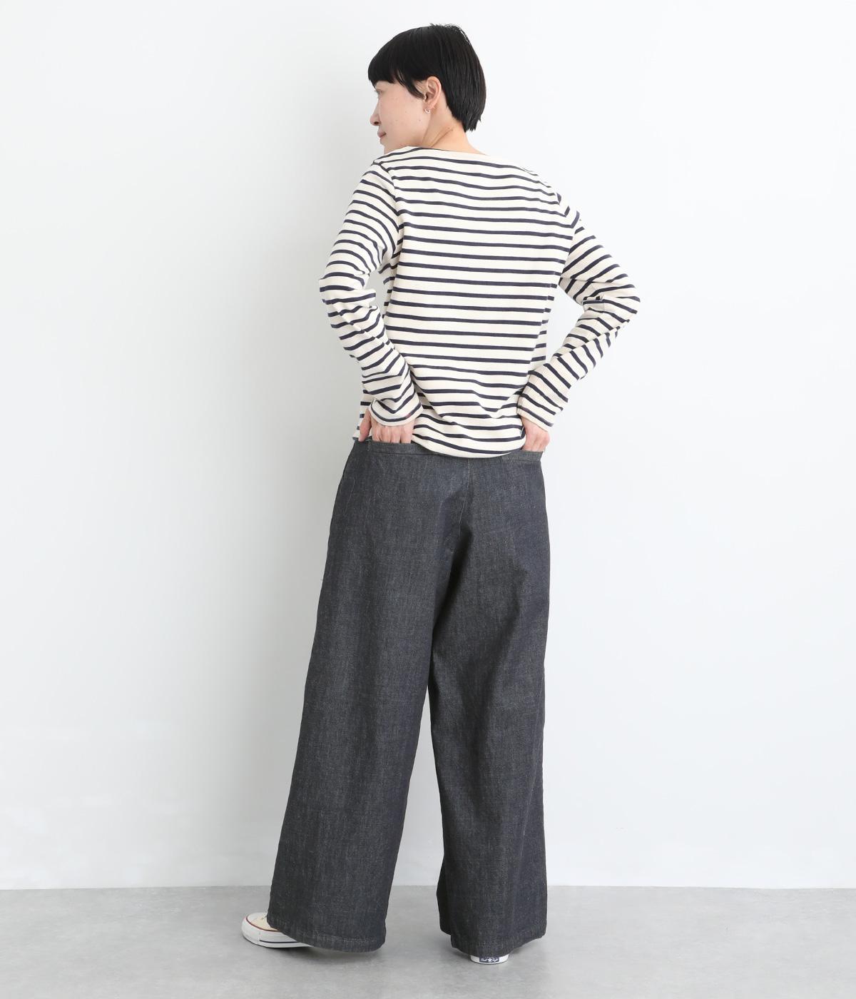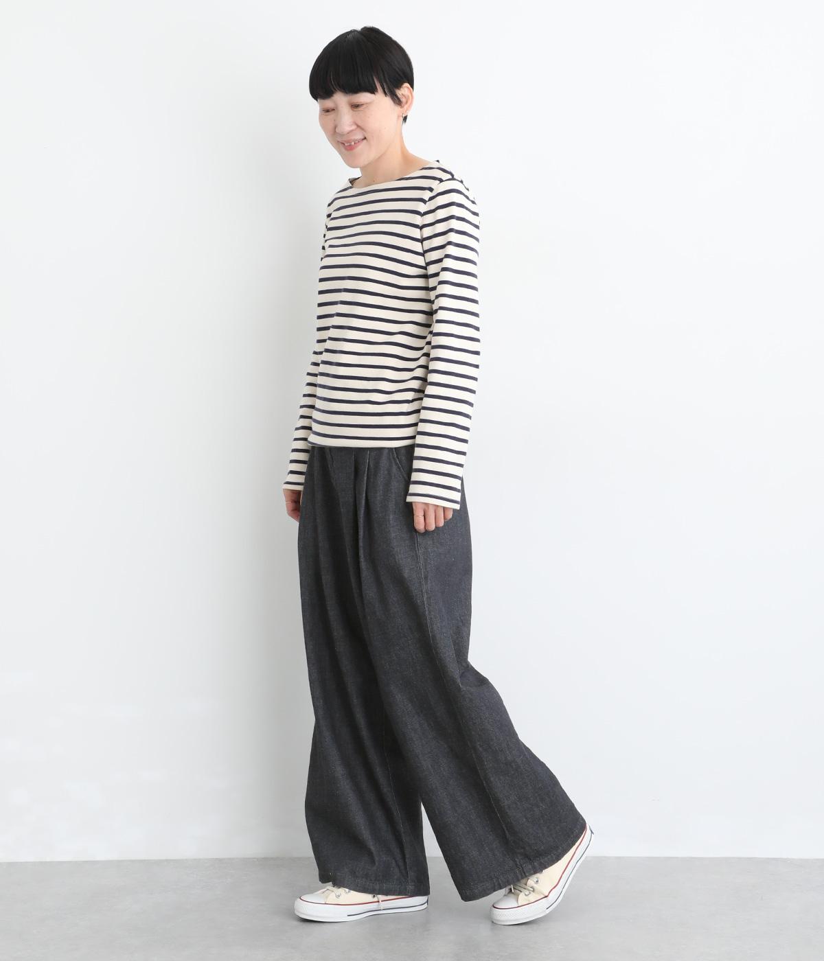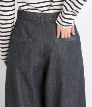 ごわつき感の少ないしなやかなライトオンスデニムを使用しました。軽やかな生地がすとんと落ち感をつくり、すっきりとしたラインを描きます。やわらかな肌なじみでソフトな着心地です。