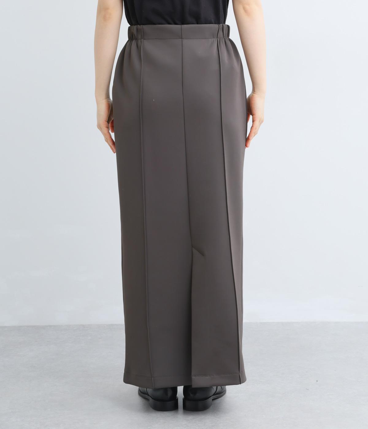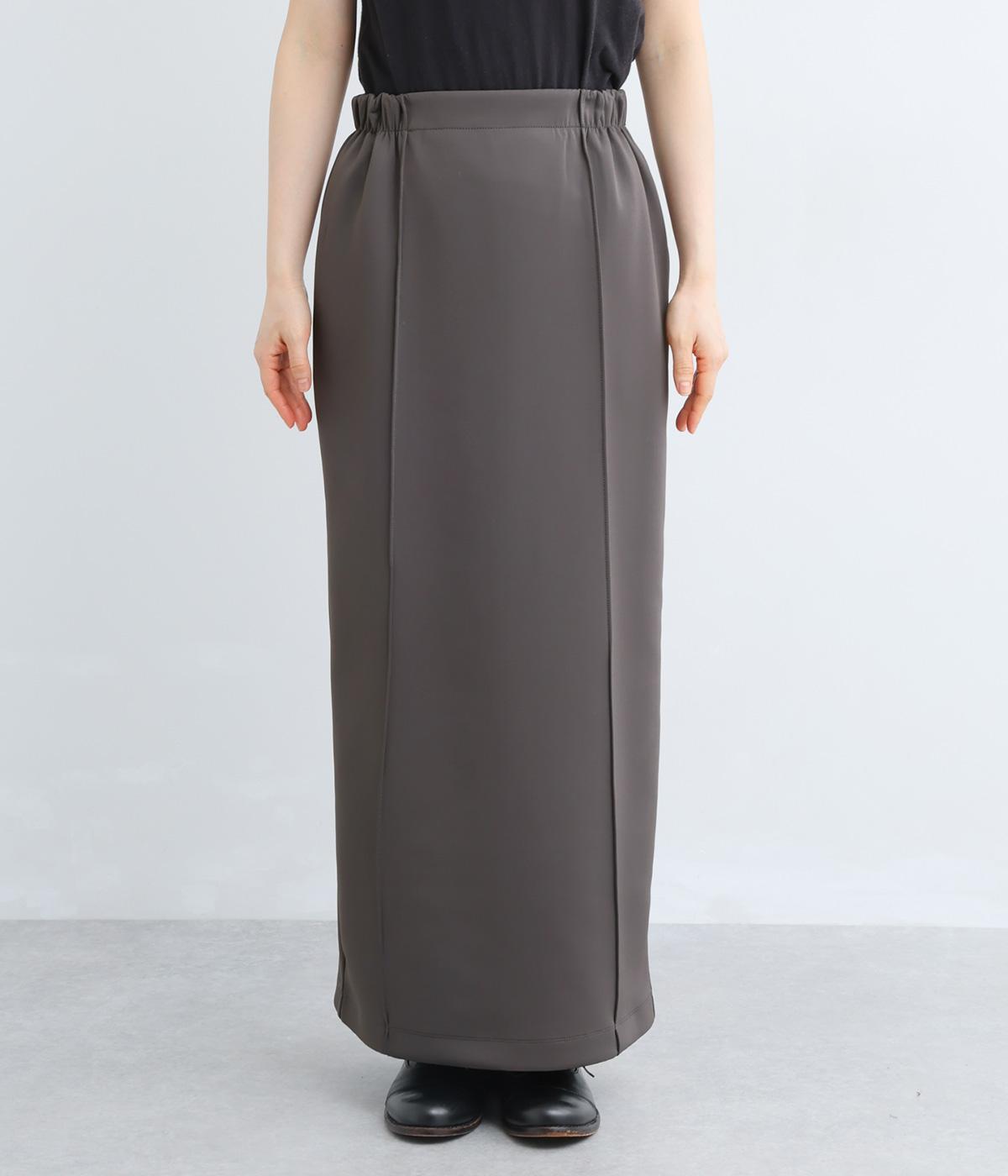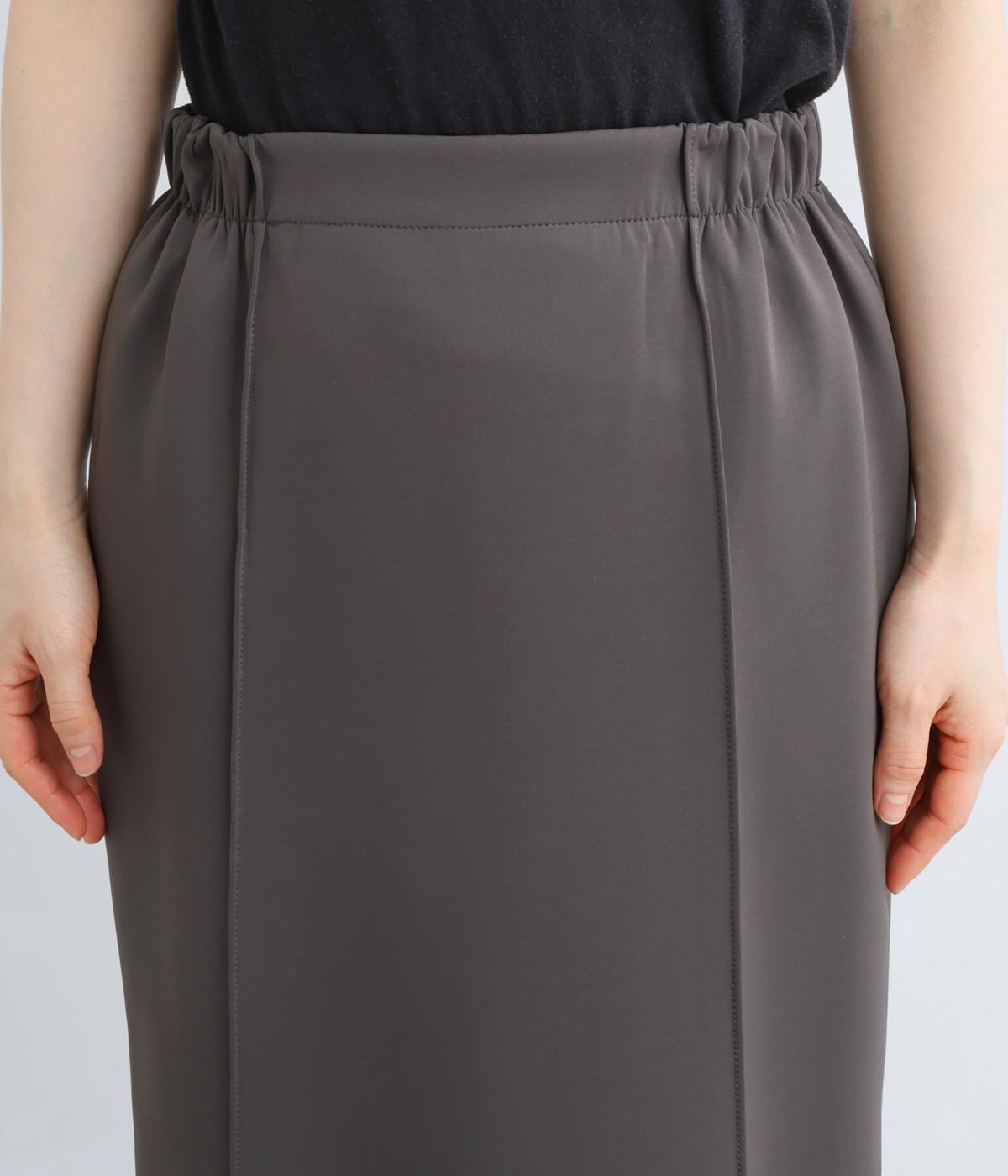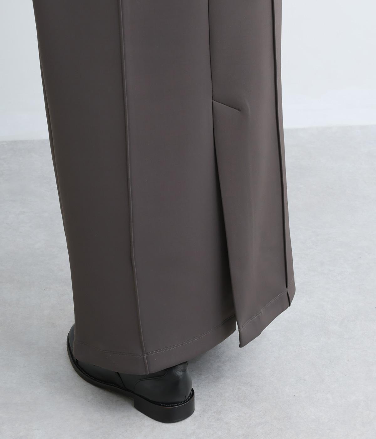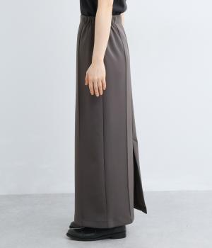 立体感のあるシルエットで体のラインを拾いにくく、ピンタックの縦のラインがスタイルよく見せてくれます。ストレッチ性のある生地感と、うしろのスリットで動きやすさも確保しました。ウエストは総ゴム仕様でストレスフリーな穿き心地です。